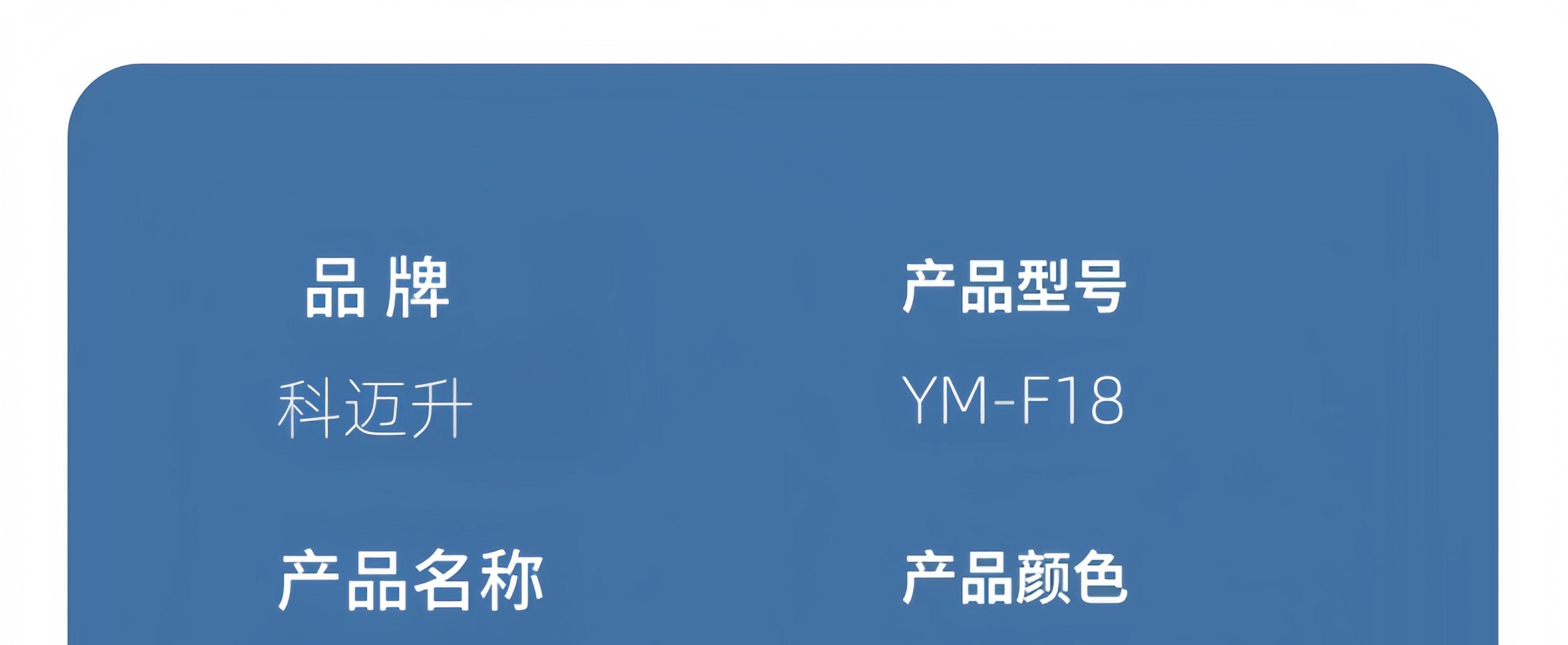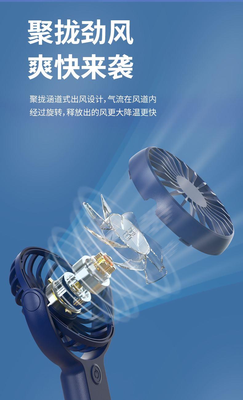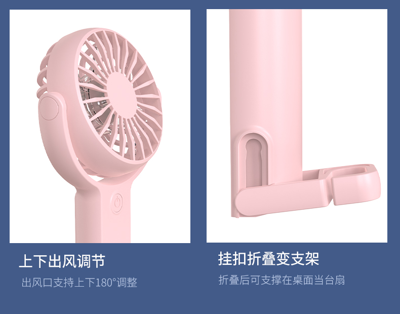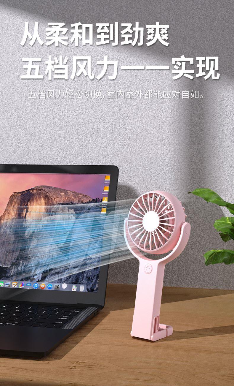 产品材质:ABS 产品功能:5档风力调节 产品容量:1200mAh 产品尺寸:115*30*82mm 产品颜色:白色,粉色,蓝色 条形码:6976935890822 产品卖点:升级亲肤挂钩设计,挂在背包上,钩在手上,清新自然的风一路相随。隐藏式支架,放桌面,办公,也是稳稳的;迷你小巧,方便携带。扇面可以180度旋转,轻松享受风的自由。5档风力,随心选择。