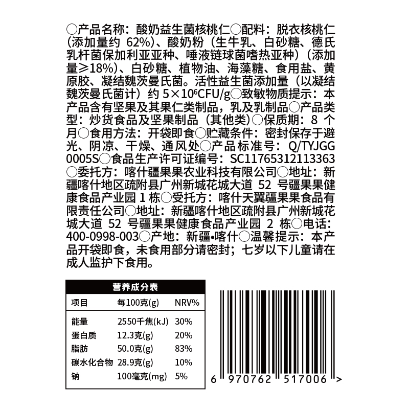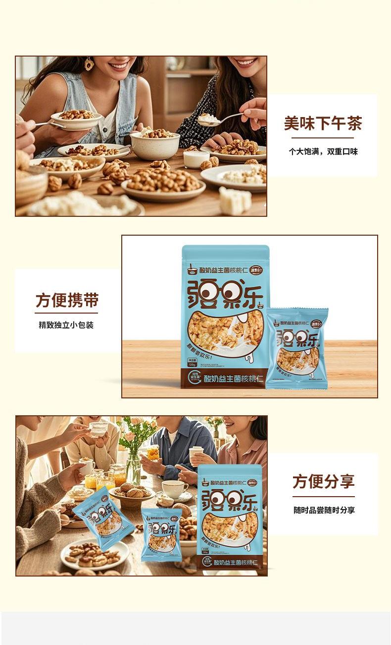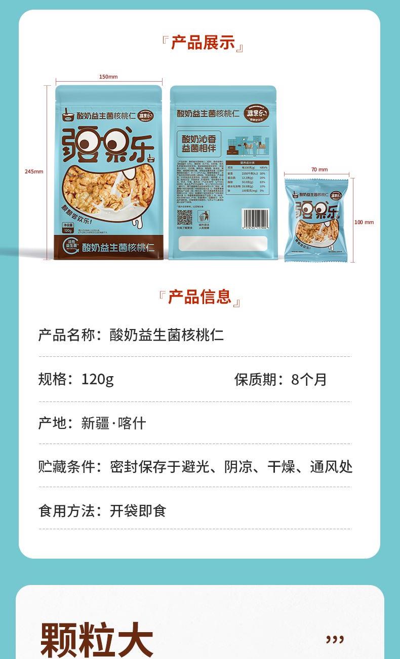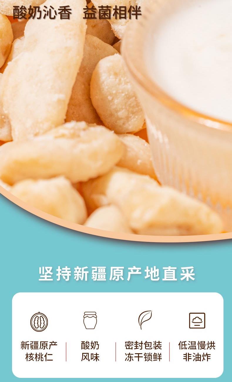 精选脱衣核桃仁裹上益生菌酸奶粉涂层,一口咬下——先是冰凉丝滑的酸奶外壳在舌尖融化,接着核桃的酥脆油香"咔嚓"炸开!活性益生菌在口腔开派对,后调还有淡淡焦糖香,好吃到停不下来的魔性口感~低温烘焙保留核桃完整营养,益生菌酸奶助力肠道健康。0反式脂肪、0防腐剂,高蛋白+优质脂肪组合,让贪吃变成"脑力投资",吃货和养生党终于达成共识!