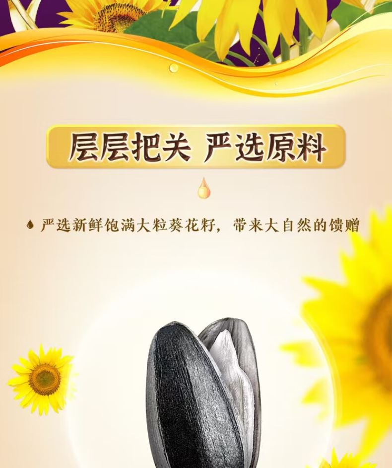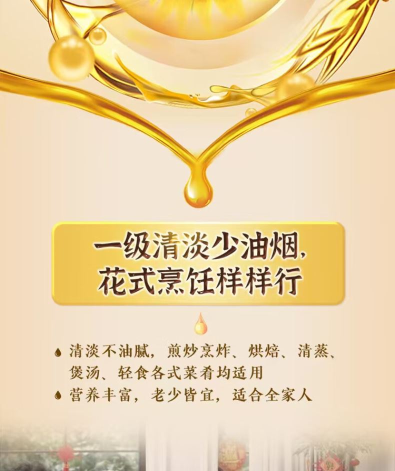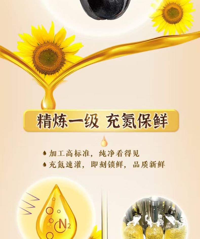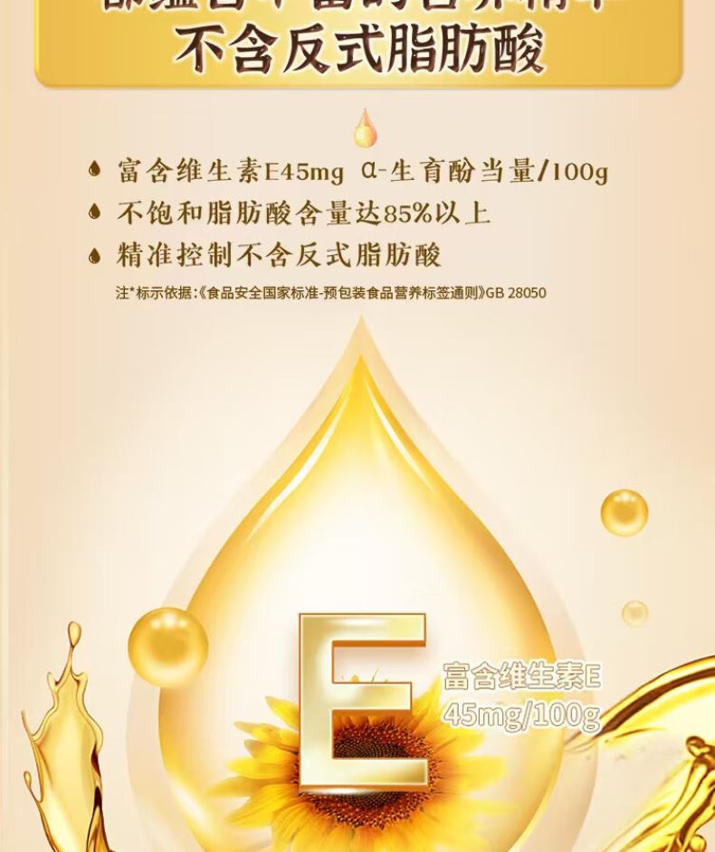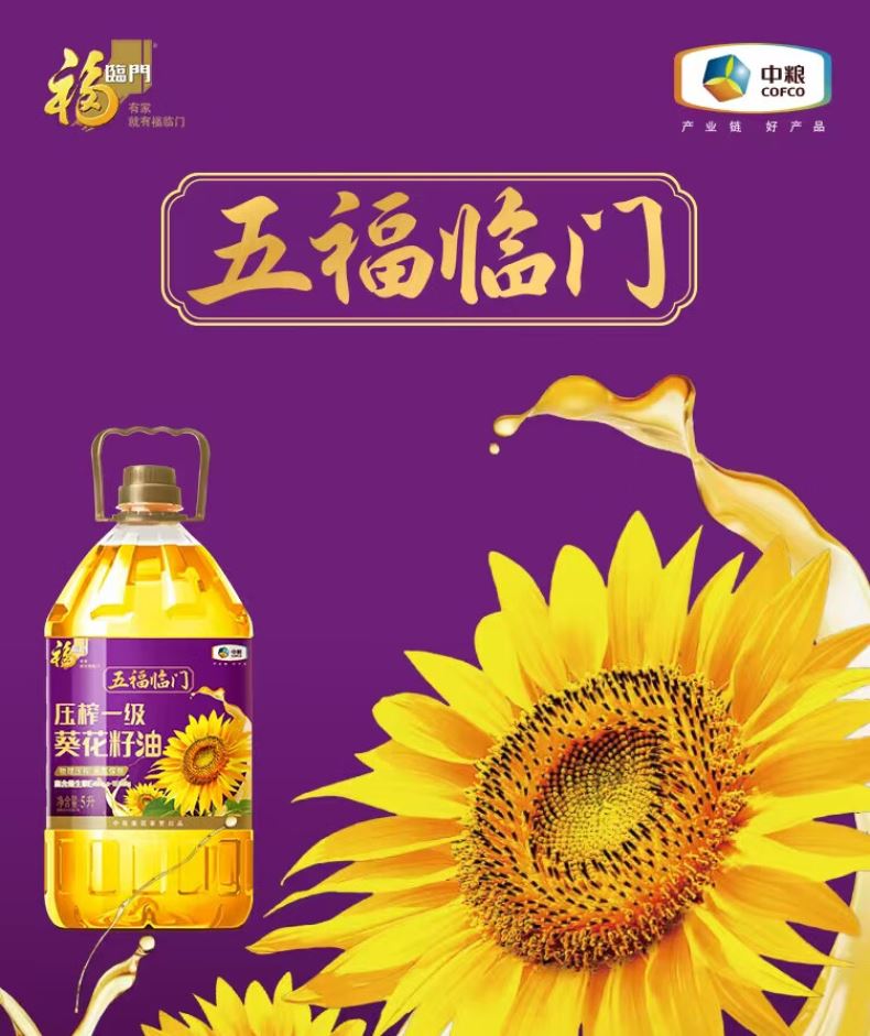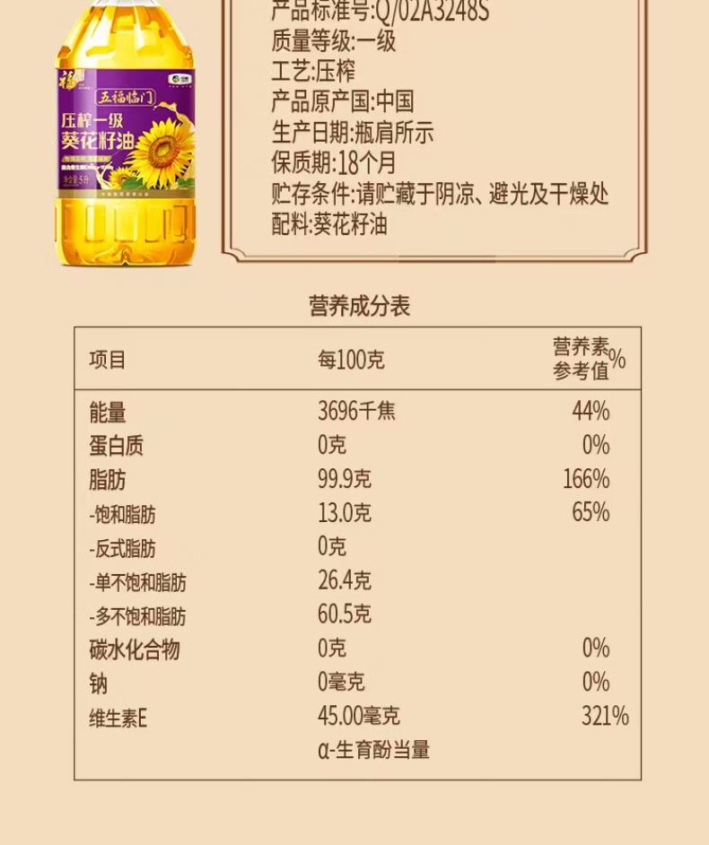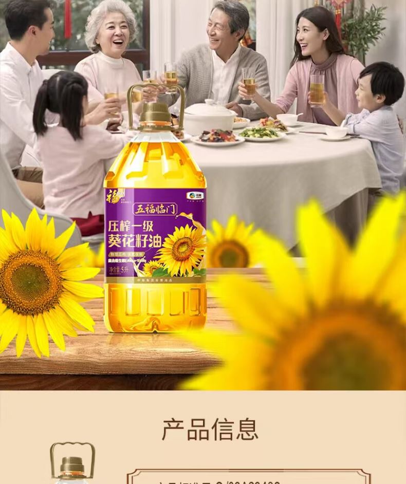 净含量:5L 条形码:6941499138208 开票税率:9% 产品卖点: 中粮品质 + 优选原料:中粮全产业链保障,精选优质葵花籽,脱壳物理压榨,一级精炼标准,滴滴纯净清香 健康营养 + 低油烟:富含86.9% 不饱和脂肪酸与维生素 E,高烟点少油烟,清淡不腻,适配煎炒烹炸 锁鲜工艺 + 吉祥寓意:防紫外线瓶 + 全程充氮保鲜,5L 大容量满足家庭需求,"五福临门" 传递团圆福气
