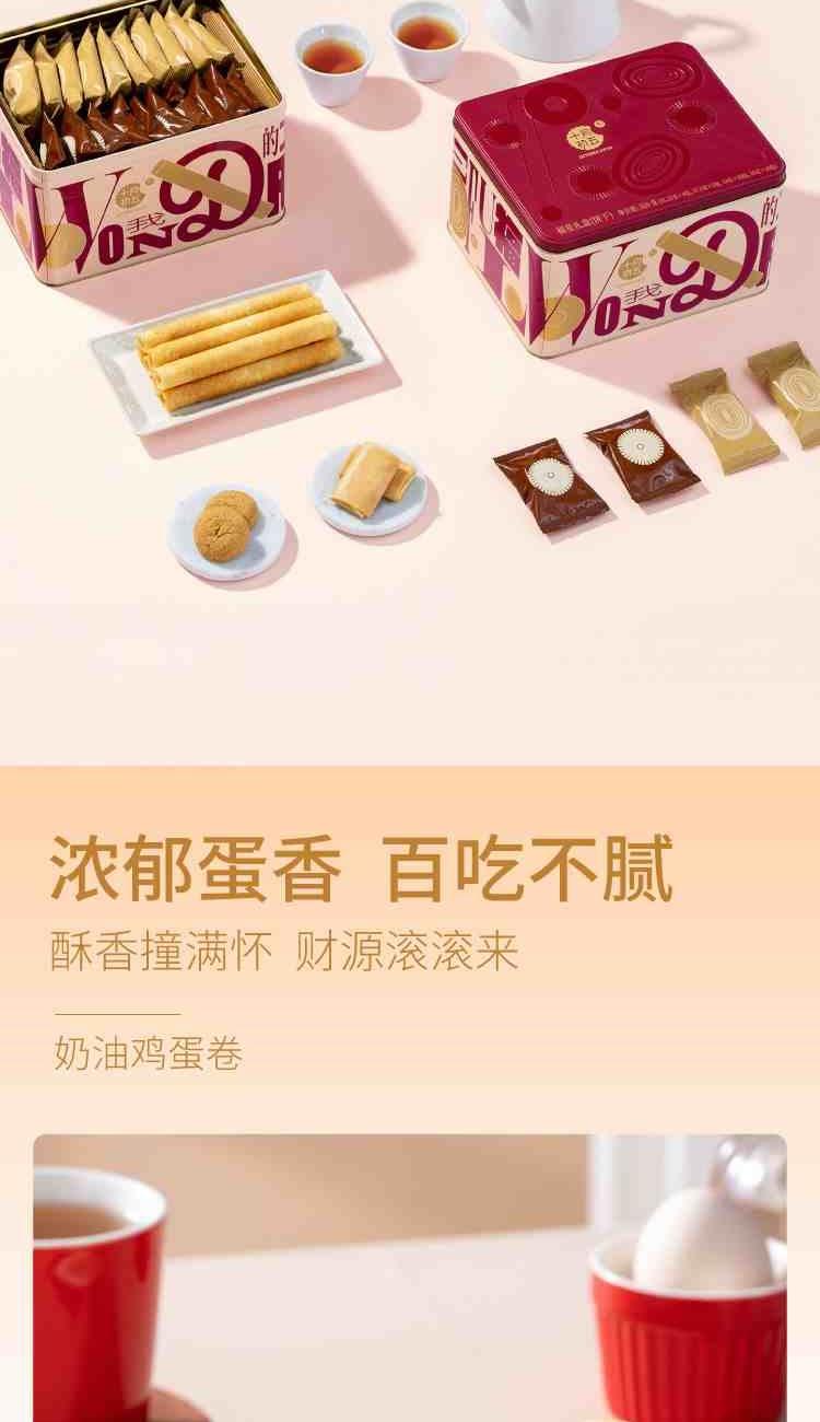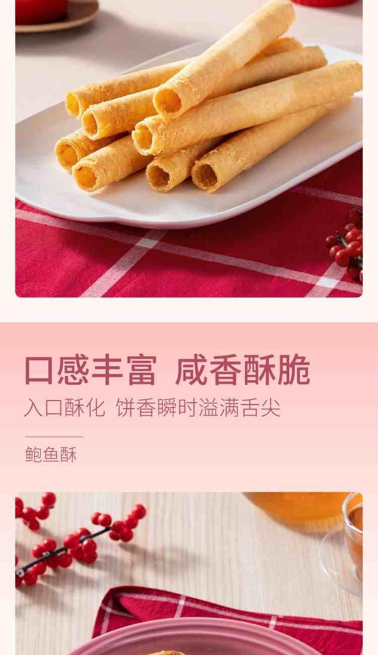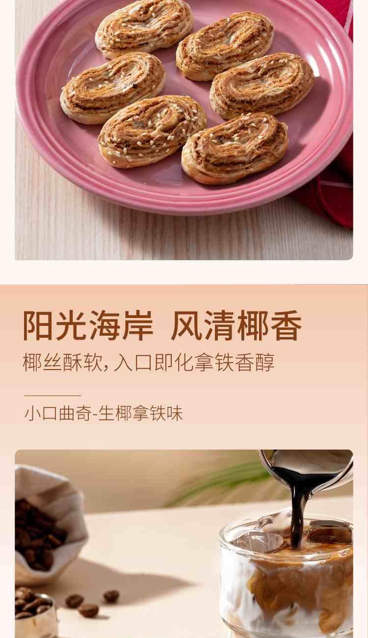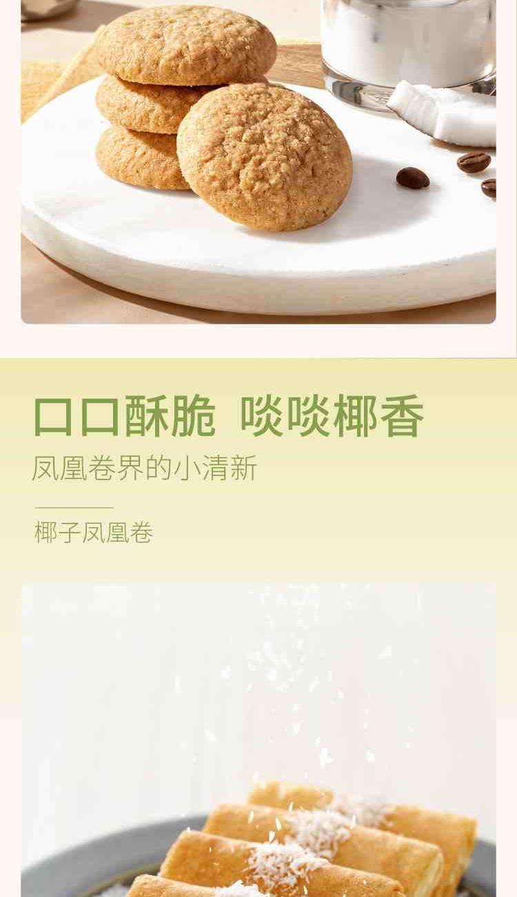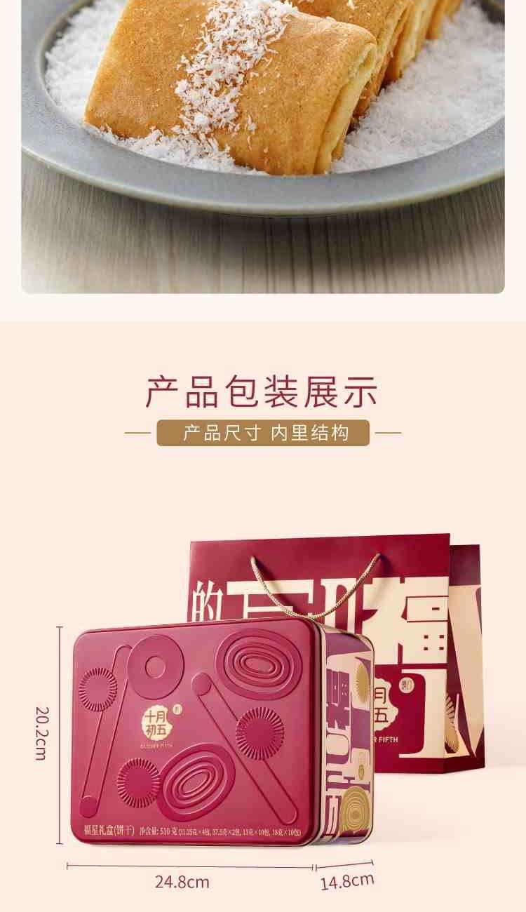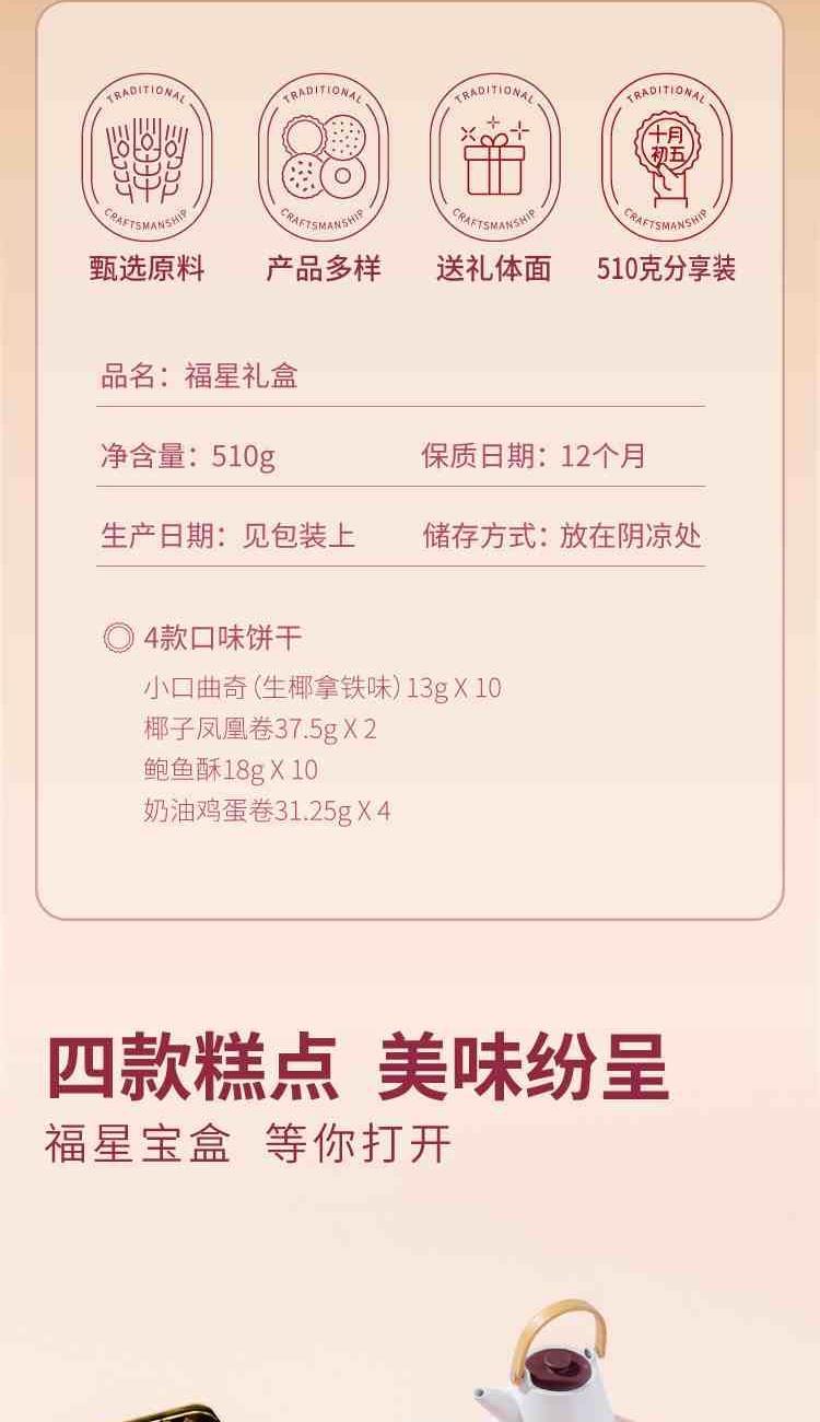 十月初五福星礼盒 净含量:510g 13g小口曲奇(生椰拿铁味)X10小包 18g鲍鱼酥X10小包 31.25g奶油鸡蛋卷X4小包 37.5g椰子凤凰卷X2小包