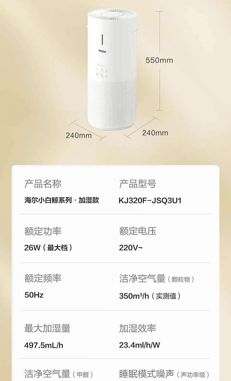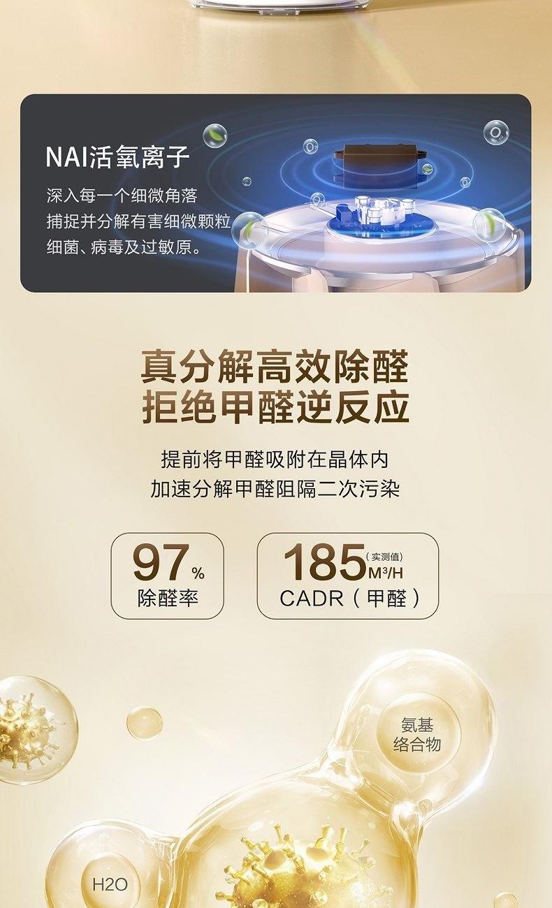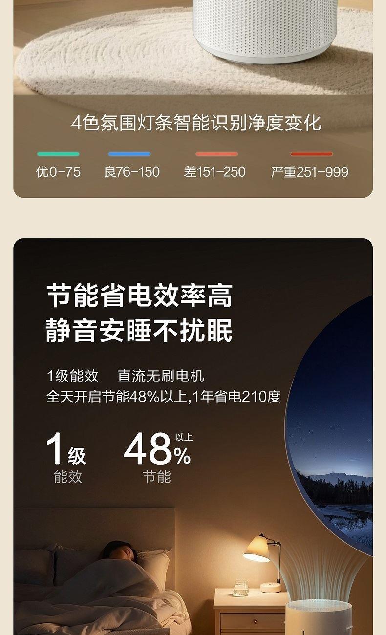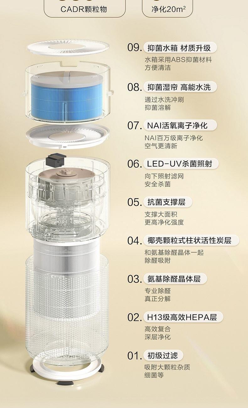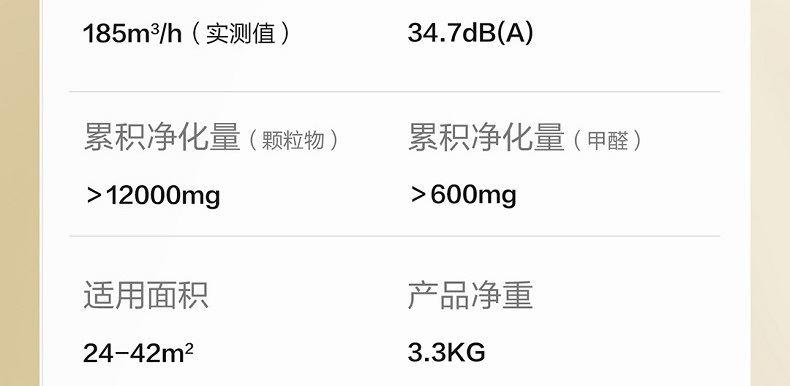 适用面积 42㎡ 净化方式 过滤式 颗粒物CCM P4 空气质量显示 PM2.5灯光显示 固态污染物CADR 340m³/h HEPA滤网等级 H13 气态CADR 170m³/h 气态污染物CCM F2 操控方式 触摸式;自动托管控制;APP操控 型号 KJ320F-JSQ3U1 额定电压 24V 额定功率 26W 1. 净润一体:净化+加湿一体,一机两用,四季皆宜,不闲置更实用