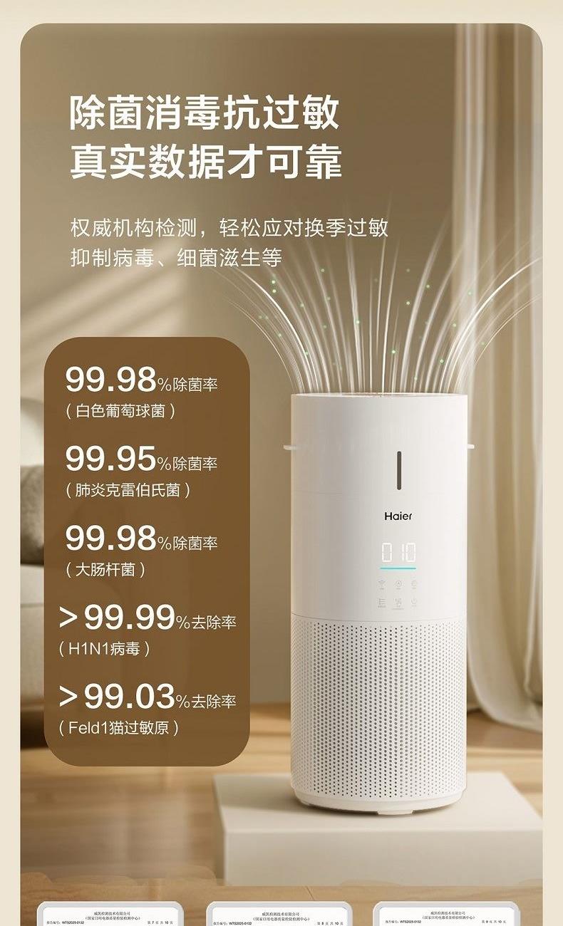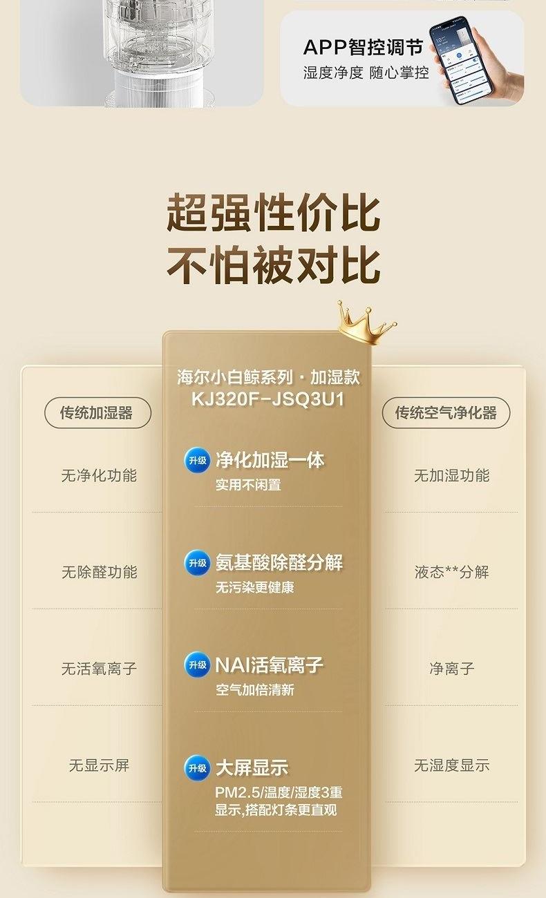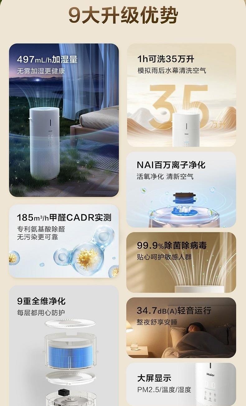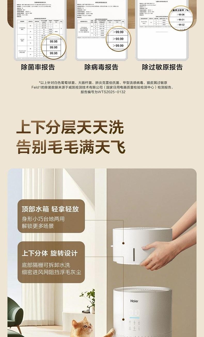 适用面积 42㎡ 净化方式 过滤式 颗粒物CCM P4 空气质量显示 PM2.5灯光显示 固态污染物CADR 340m³/h HEPA滤网等级 H13 气态CADR 170m³/h 气态污染物CCM F2 操控方式 触摸式;自动托管控制;APP操控 型号 KJ320F-JSQ3U1 额定电压 24V 额定功率 26W 1. 净润一体:净化+加湿一体,一机两用,四季皆宜,不闲置更实用