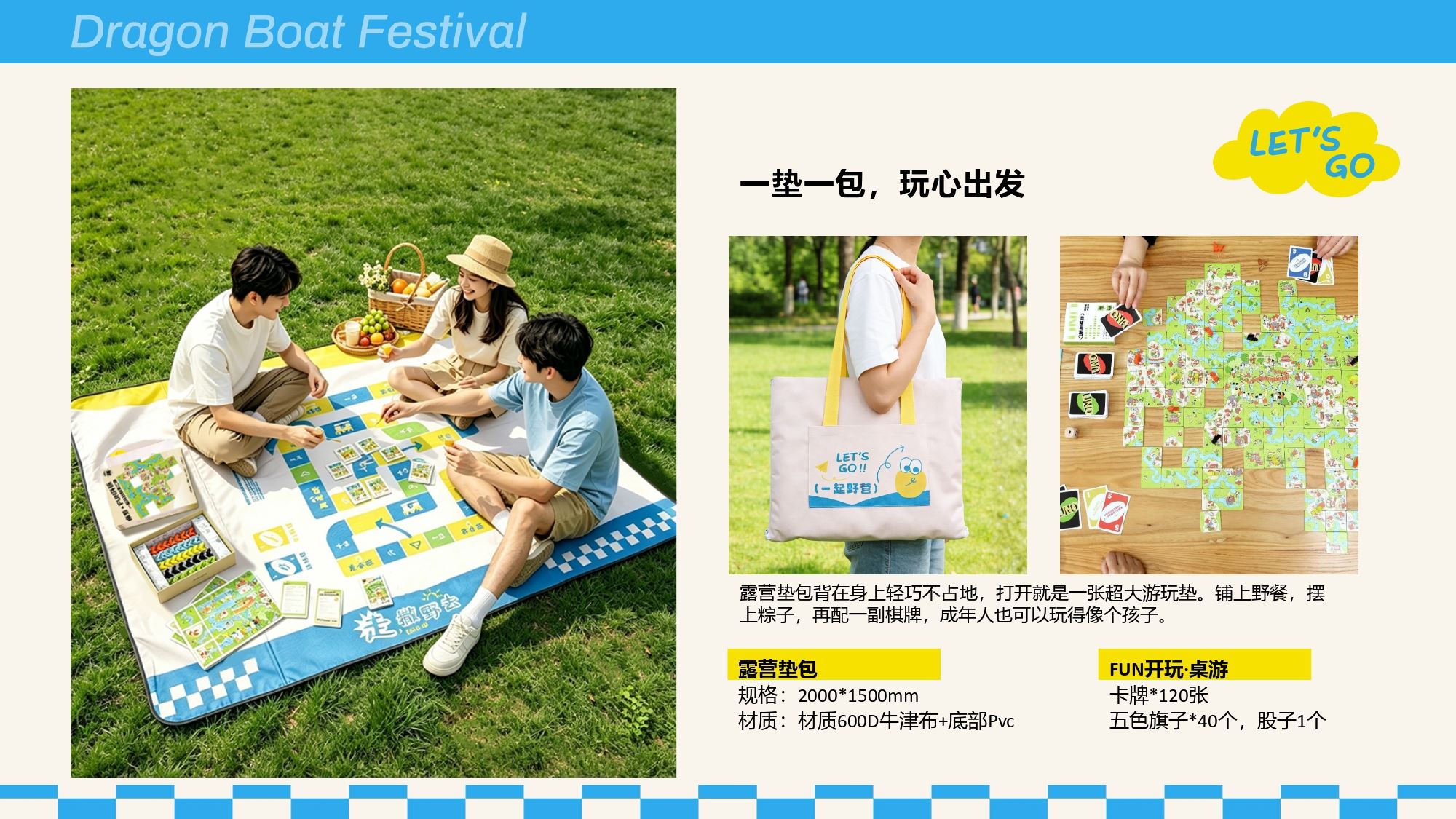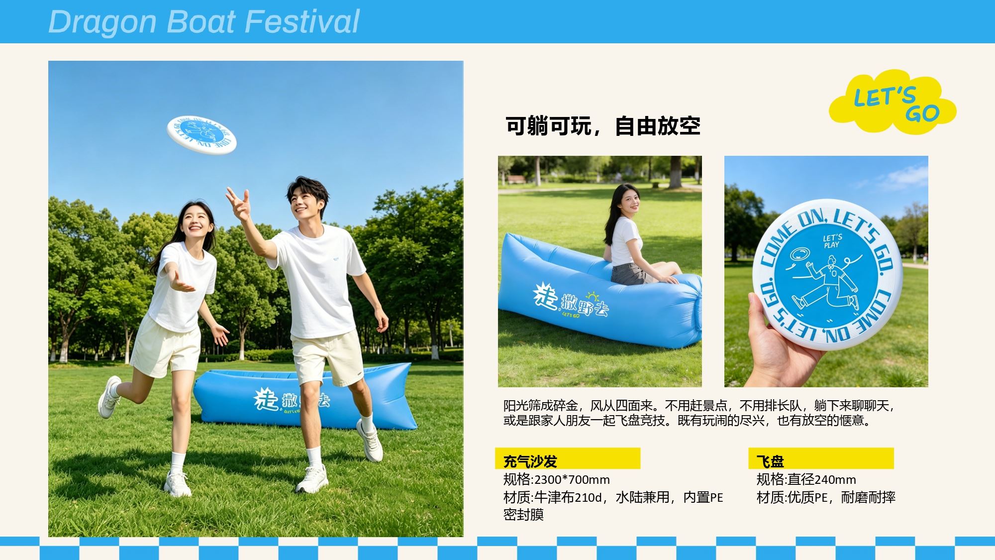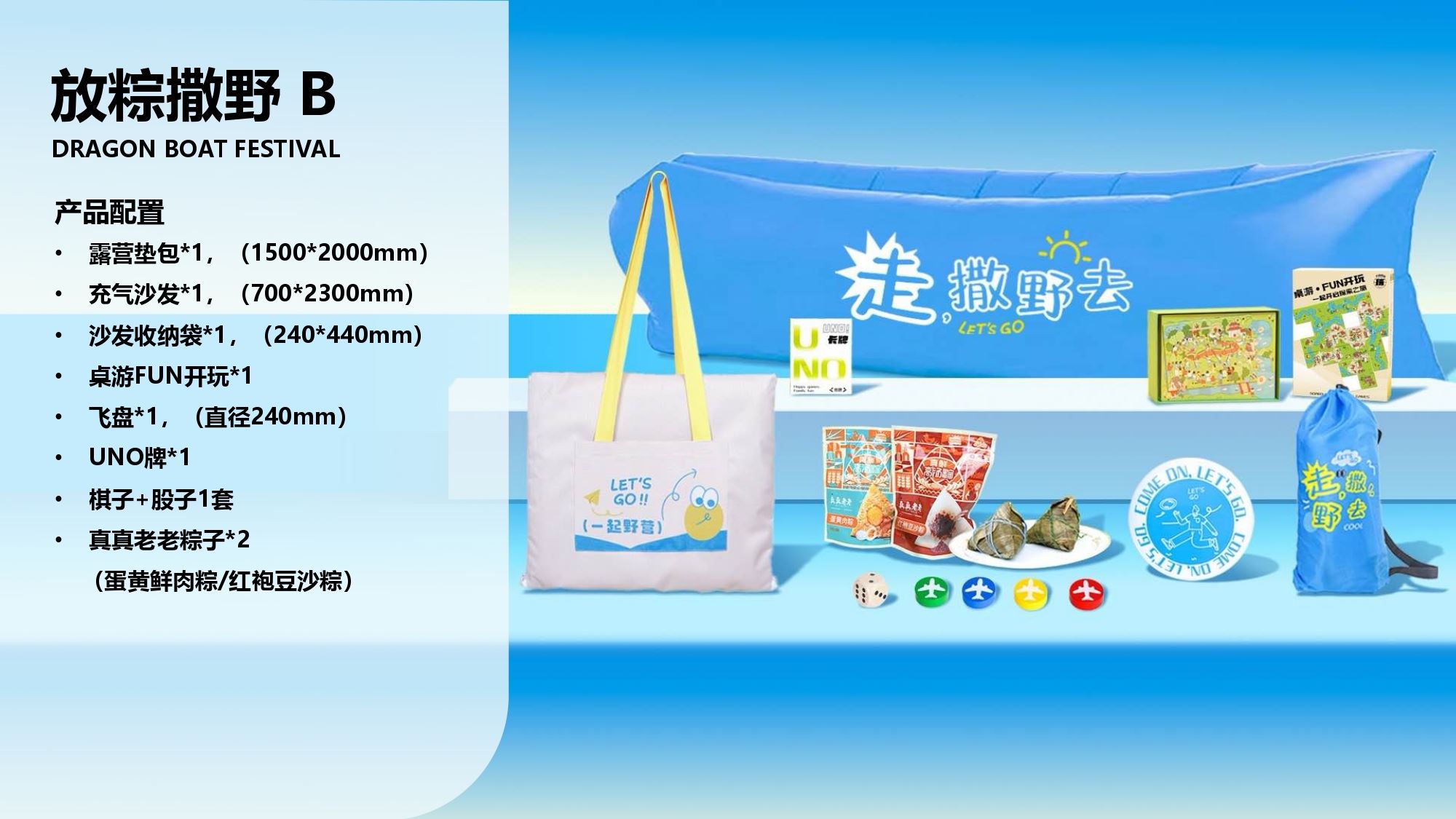 产品配置 露营垫包*1,(1500*2000mm) 充气沙发*1,(700*2300mm) 沙发收纳袋*1,(240*440mm) 桌游FUN开玩*1 飞盘*1,(直径240mm) UNO牌*1 棋子+股子1套 真真老老粽子*2 (蛋黄鲜肉粽/红袍豆沙粽)