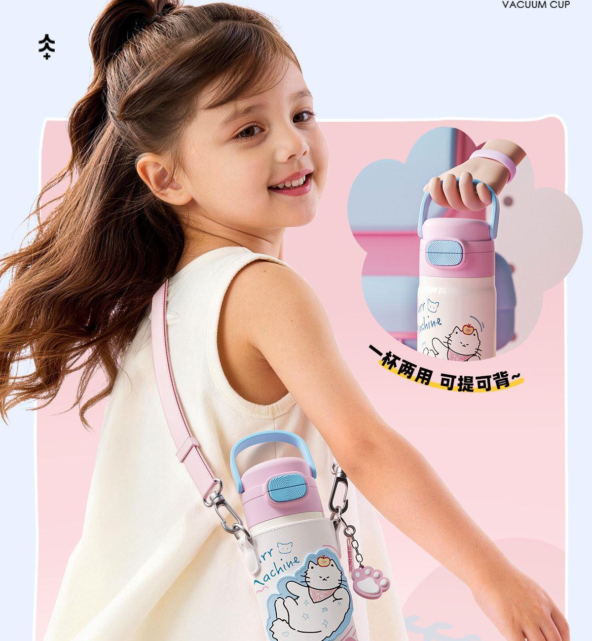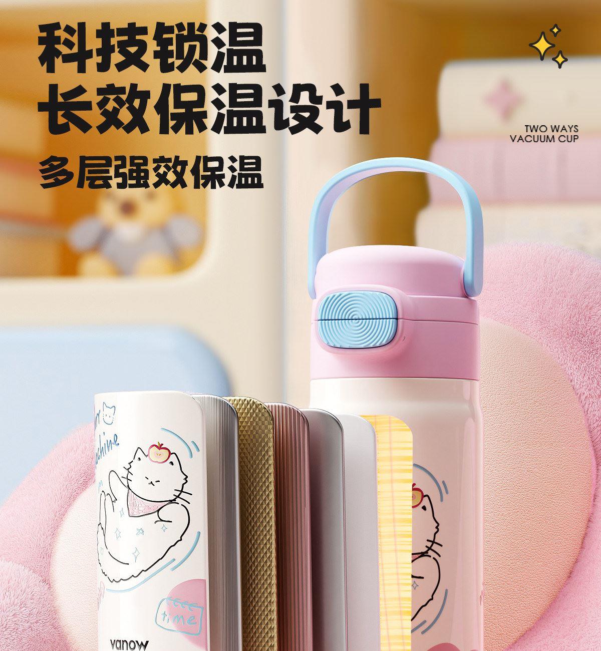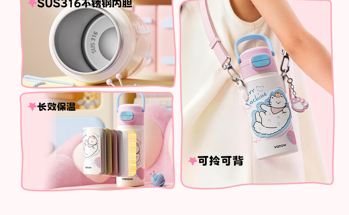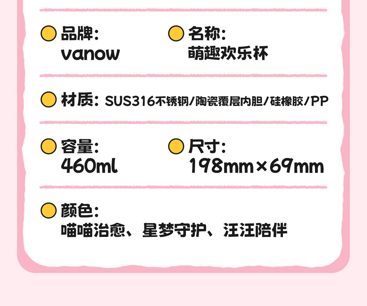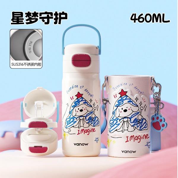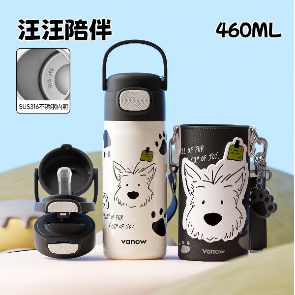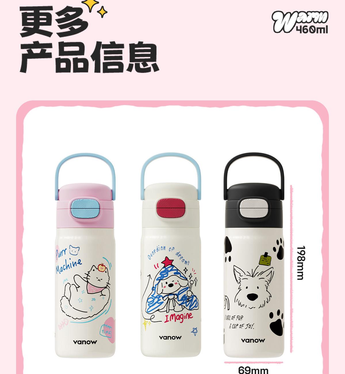 型号:VO-MQ46HL 颜色:黑色发夹狗,粉色猫咪,蓝色涂鸦狗 容量:460ml 尺寸:198*69mm 材质:316不锈钢内胆/硅橡胶/pp 产品卖点:1.科技锁温,长效保湿设计 2.百搭杯,精致出行,高品质可调节背带 3.一盖双印,随意切换 4.全身可拆,清洗无死角