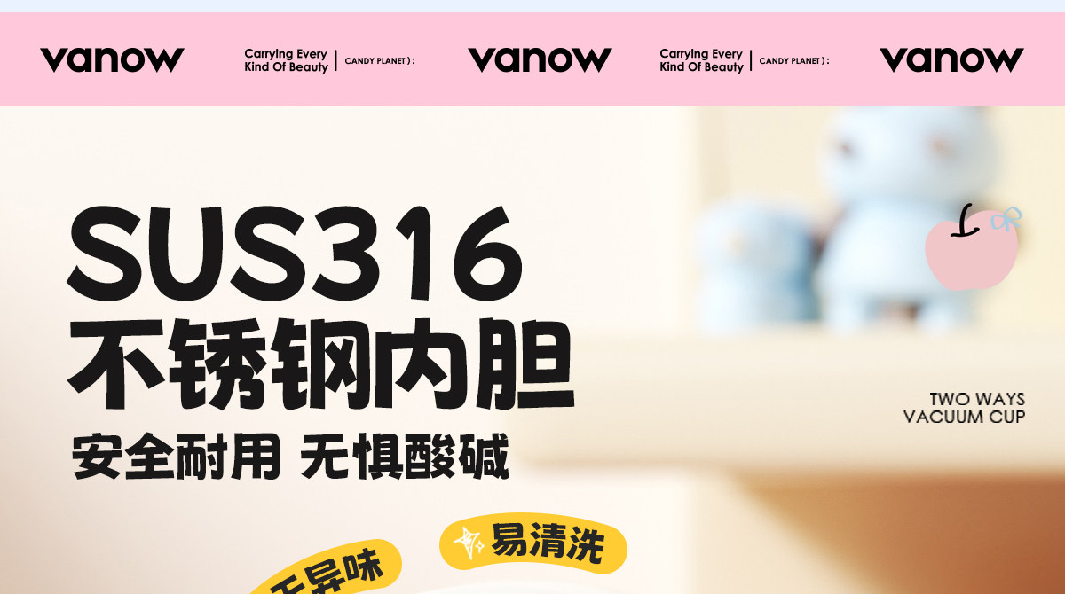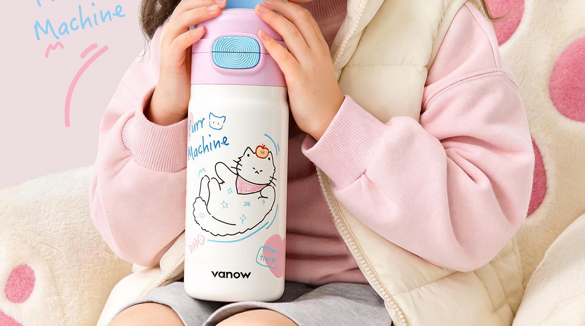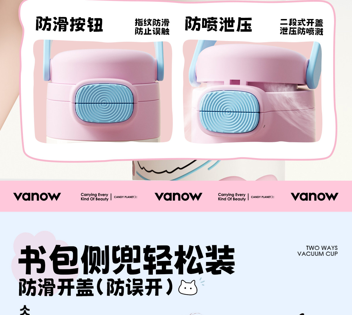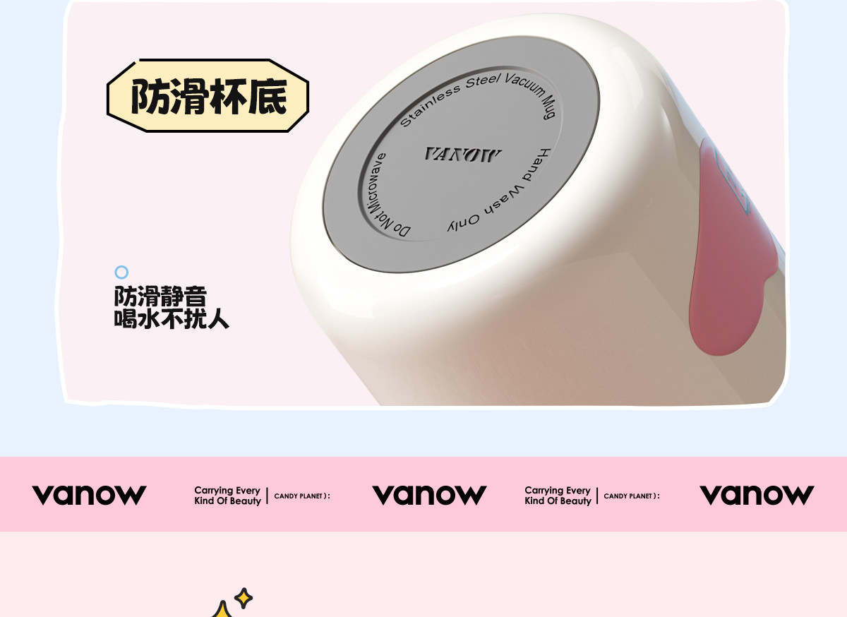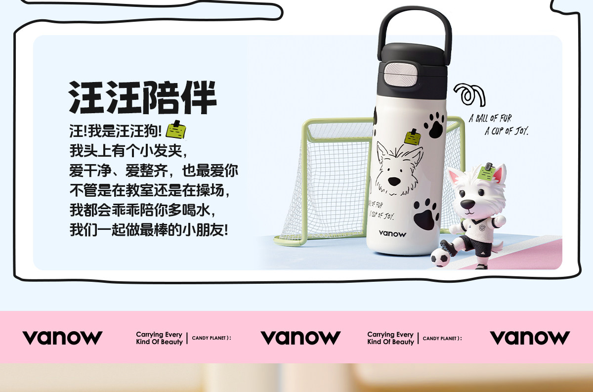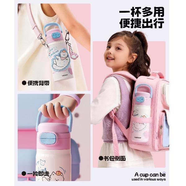 型号:VO-MQ46HL 颜色:黑色发夹狗,粉色猫咪,蓝色涂鸦狗 容量:460ml 尺寸:198*69mm 材质:316不锈钢内胆/硅橡胶/pp 产品卖点:1.科技锁温,长效保湿设计 2.百搭杯,精致出行,高品质可调节背带 3.一盖双印,随意切换 4.全身可拆,清洗无死角