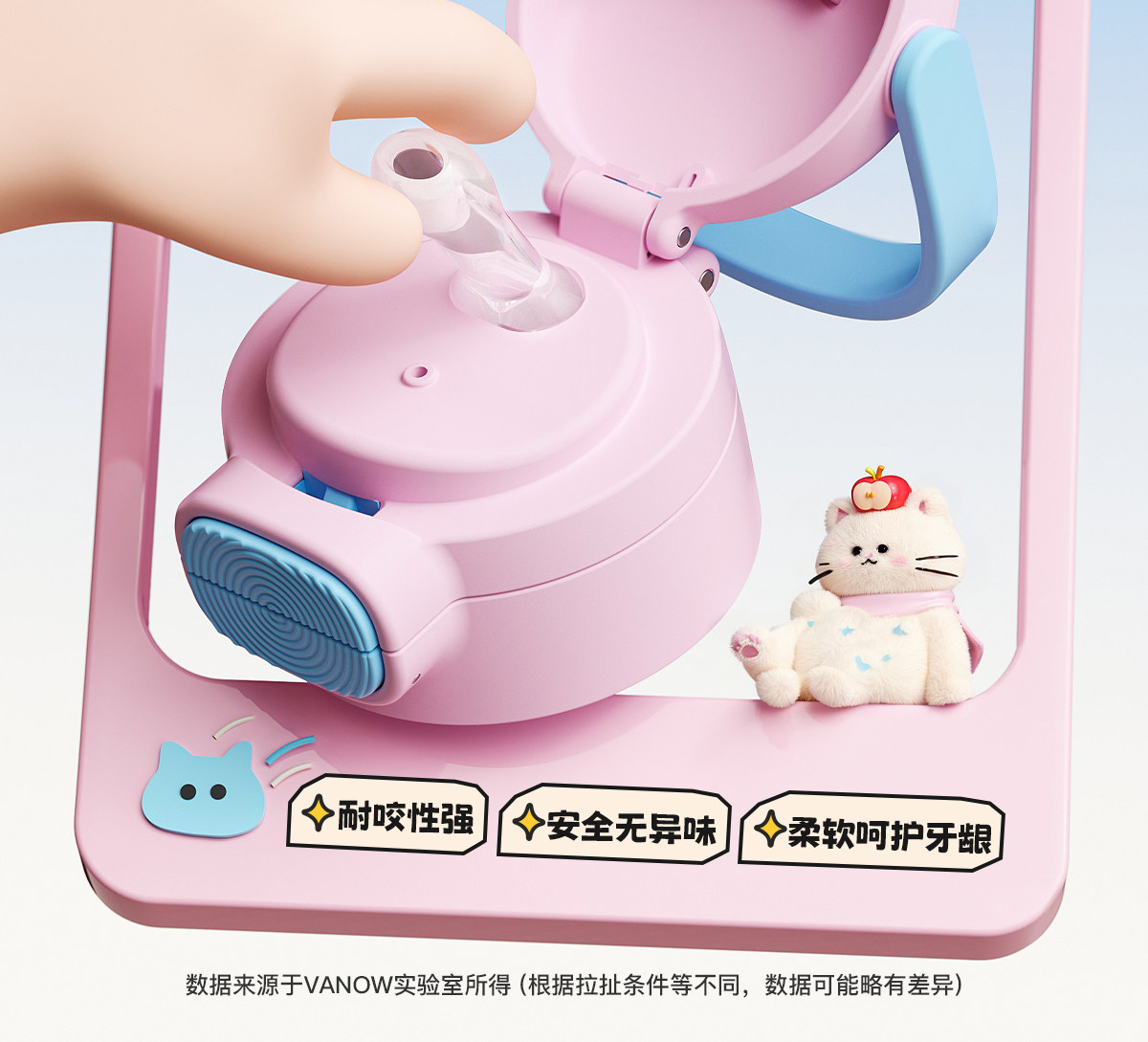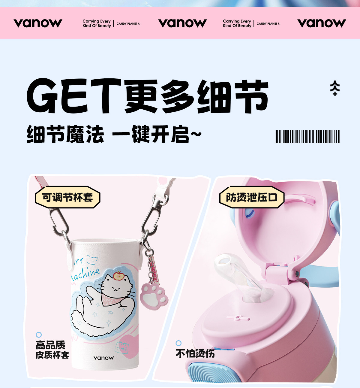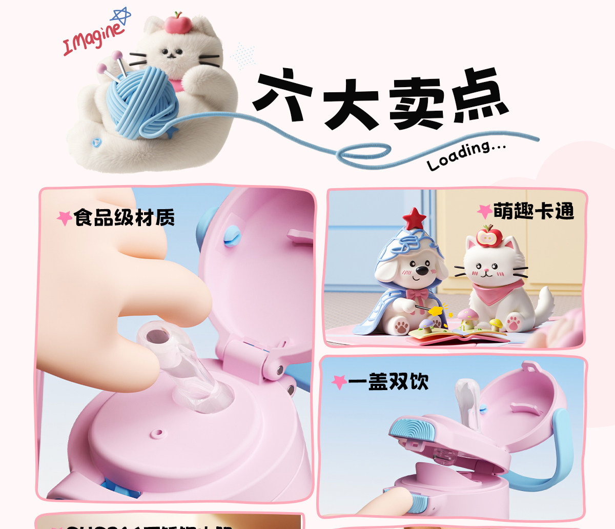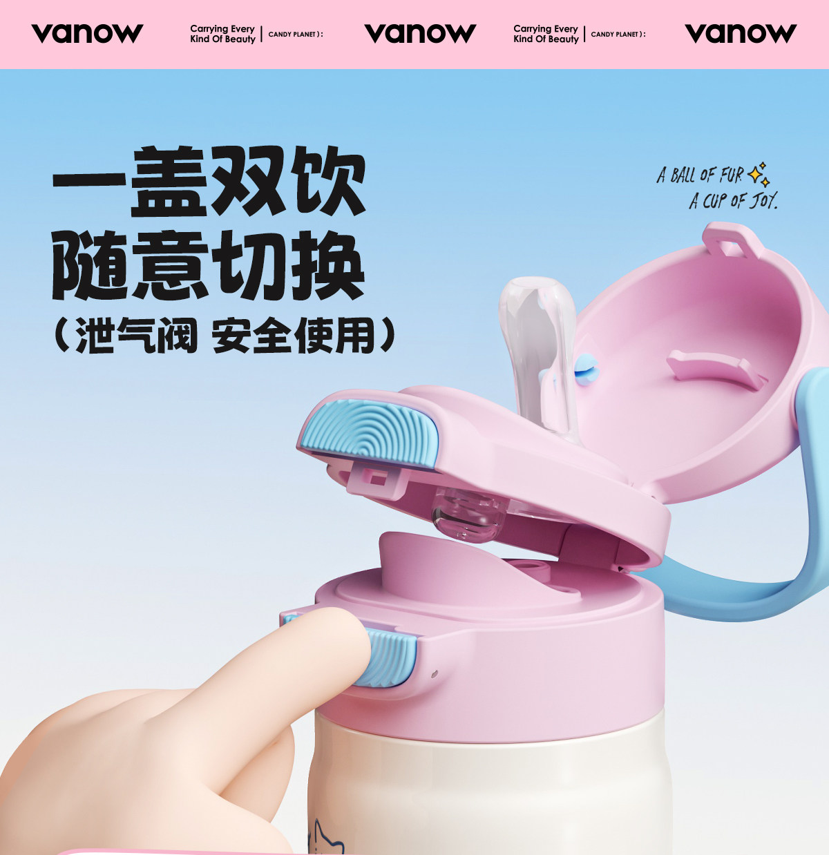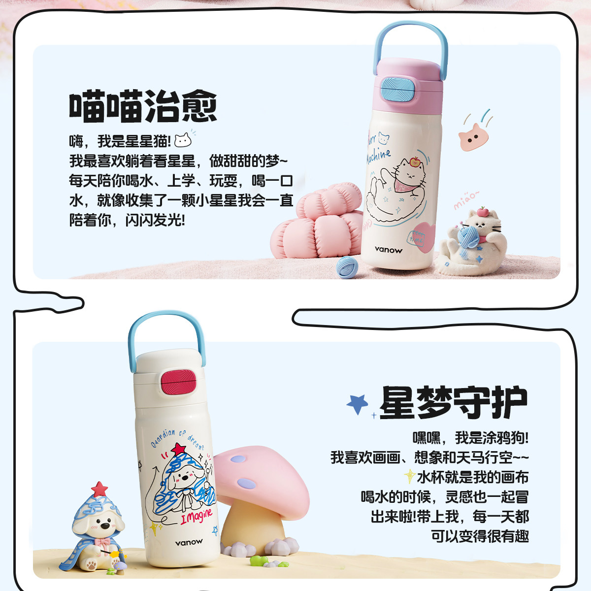 型号:VO-MQ46HL 颜色:黑色发夹狗,粉色猫咪,蓝色涂鸦狗 容量:460ml 尺寸:198*69mm 材质:316不锈钢内胆/硅橡胶/pp 产品卖点:1.科技锁温,长效保湿设计 2.百搭杯,精致出行,高品质可调节背带 3.一盖双印,随意切换 4.全身可拆,清洗无死角