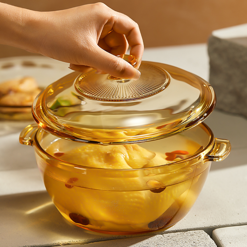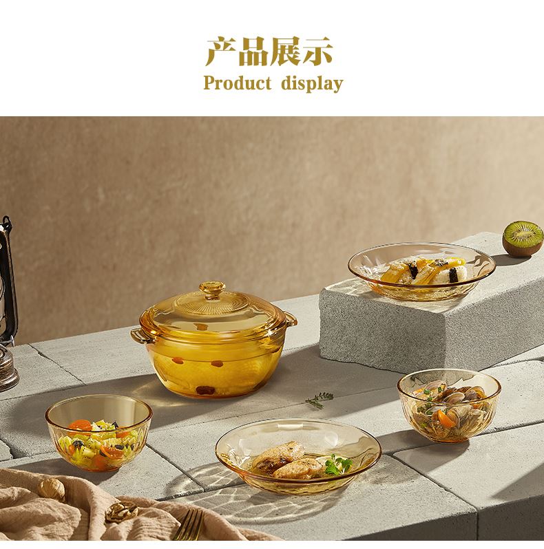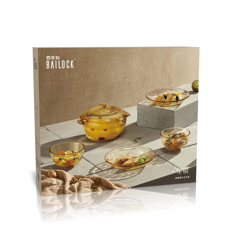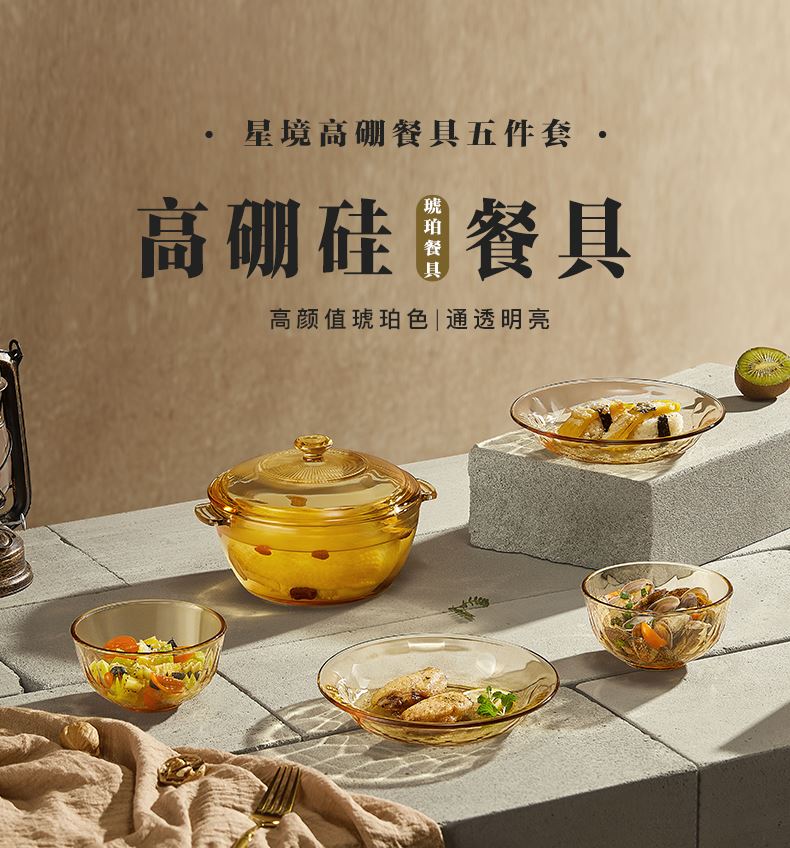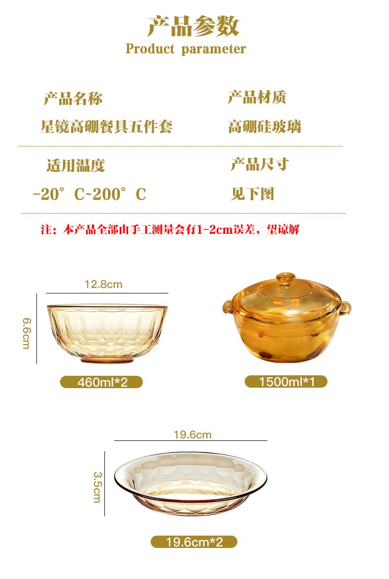 适用温度:-20°C-200°C 材 质:高硼硅玻璃 产品参数:小碗460ml*2、 盘196mm*2、高硼煲*1 彩盒尺寸:402*112*345mm 外箱尺寸:69.6*41.6*36.1cm 产品卖点:1.产品采用高硼色料玻璃材质,颜色与生俱来,永不退色。烤箱、微波炉、冰箱冷冻放心使用。2.星境高硼餐具设计理念,用线条勾勒几何切面,以面为境折射时光、徜徉星空。3.触感温润,品质卓 越,为您的餐桌增添一抹高雅。