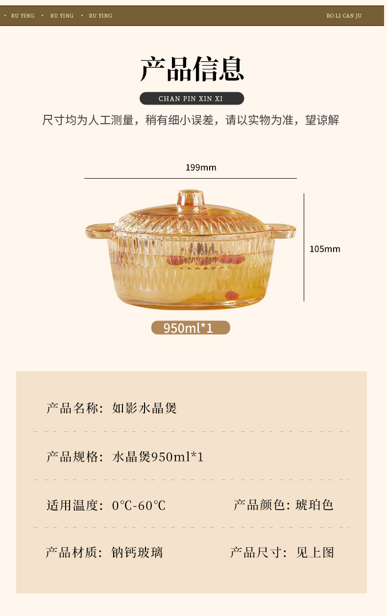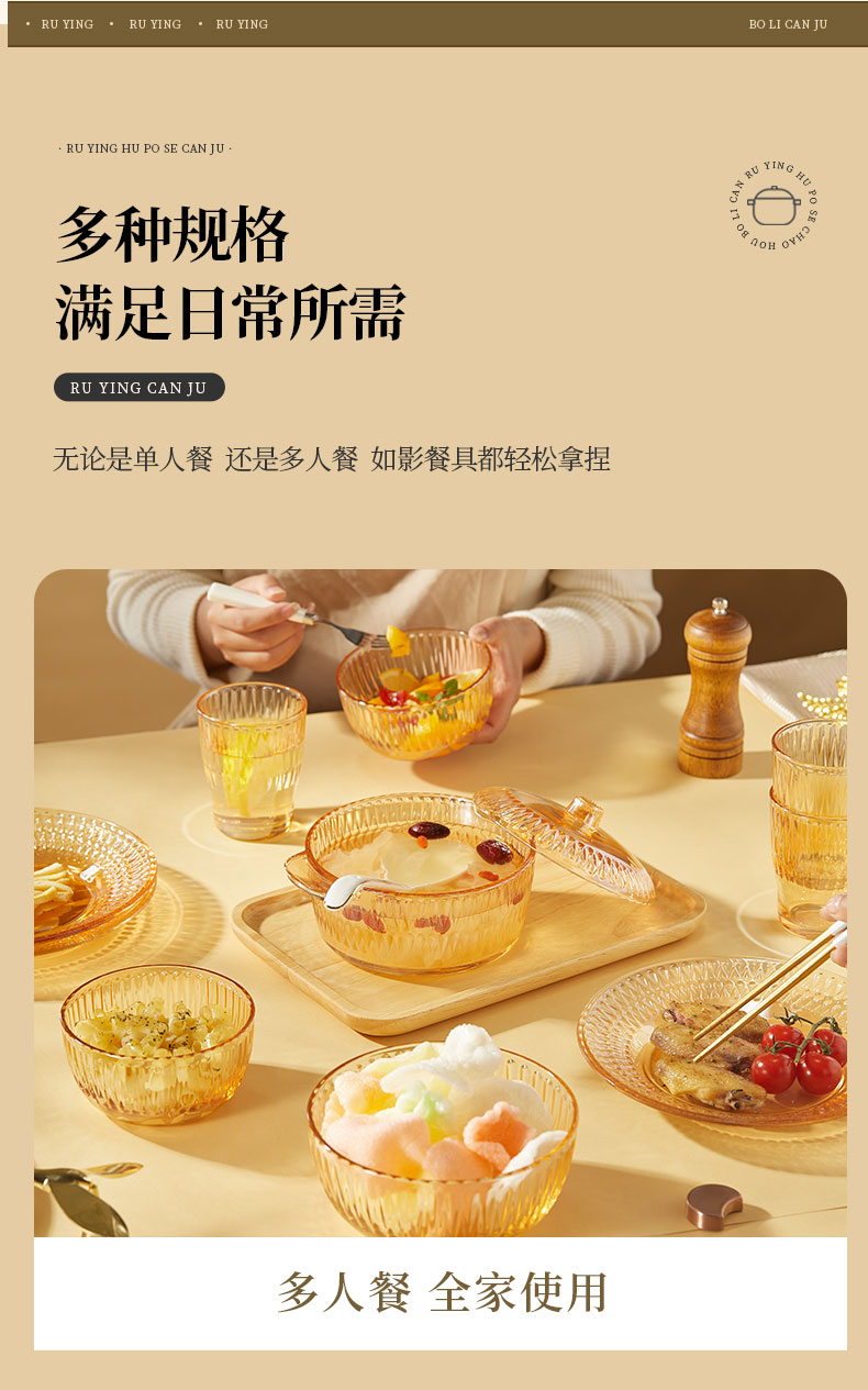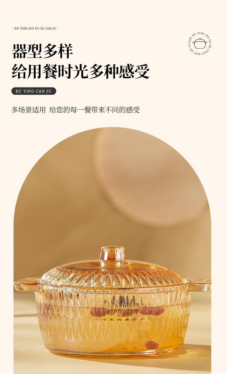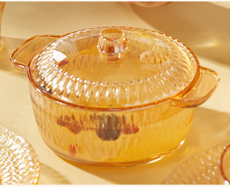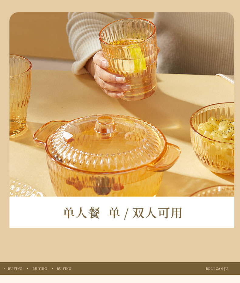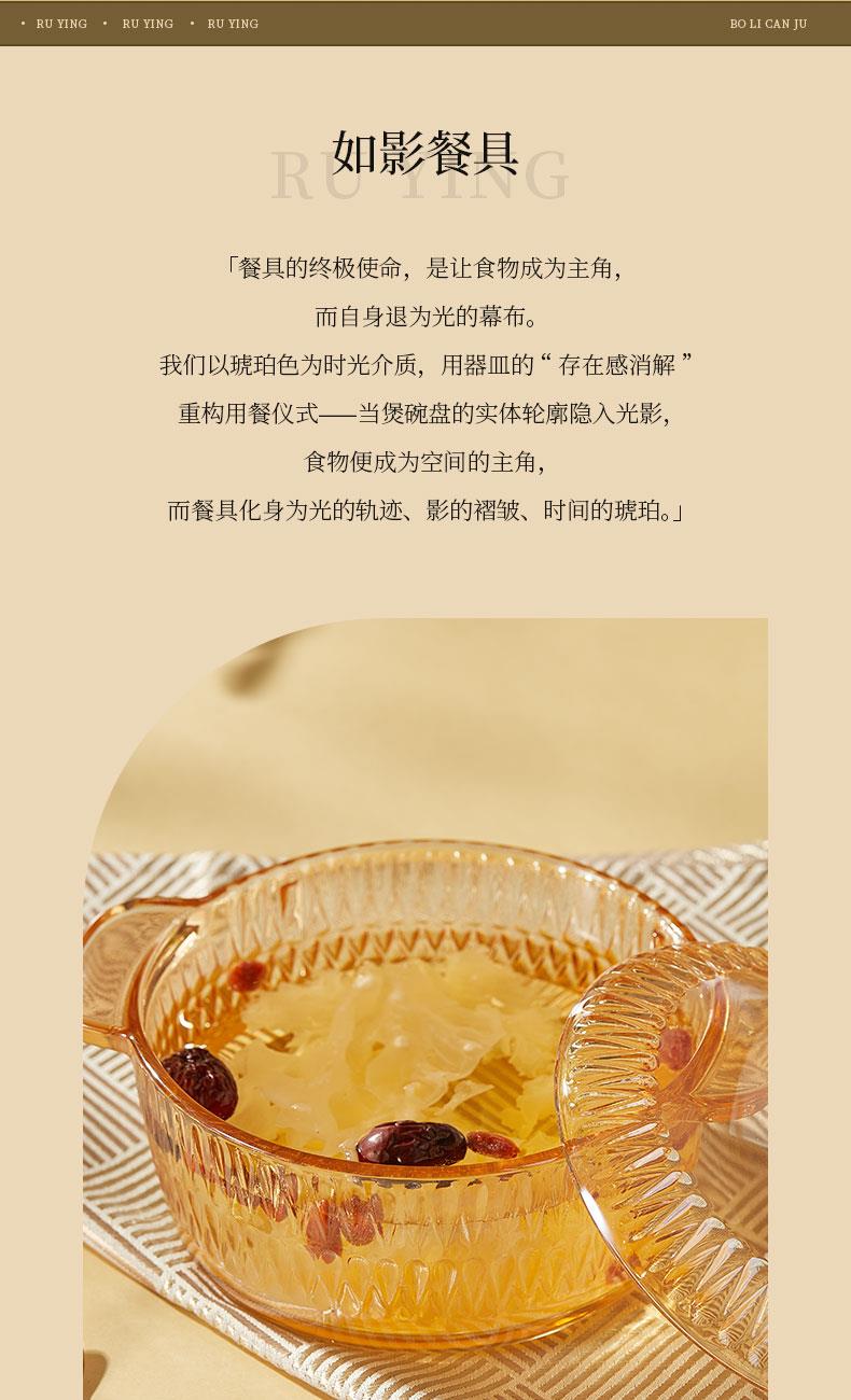 产品卖点:1、经过精心设计,采用优雅的琥珀色调,为您的餐桌增添一抹温暖的色彩。无论是日常用餐还是特殊场合,都能彰显出不凡的品味。