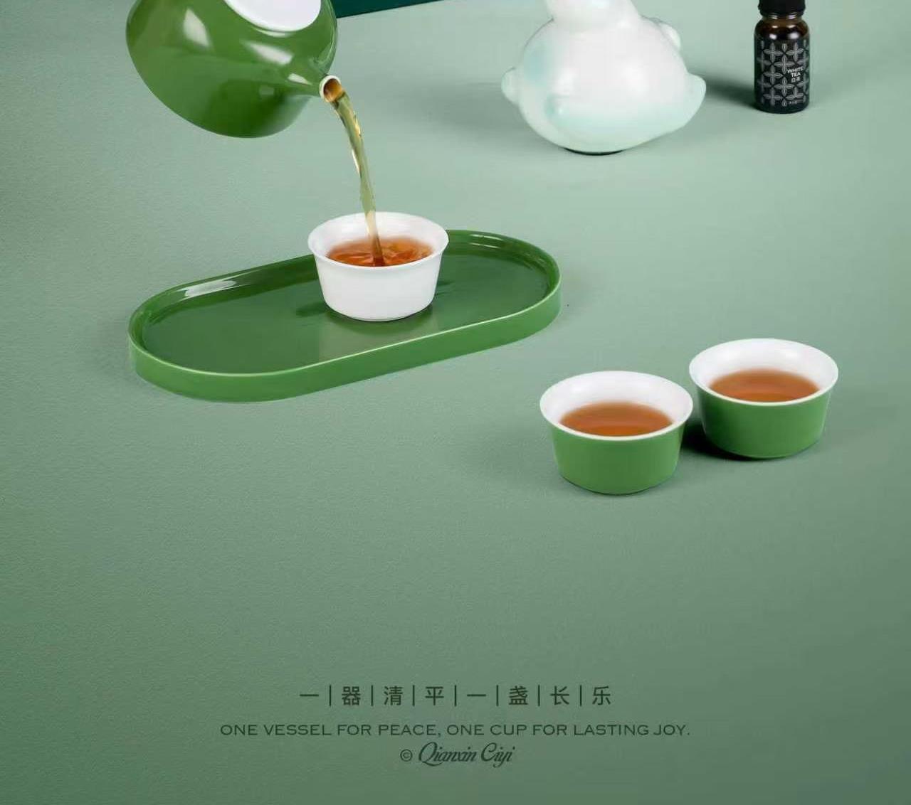 配置:茶壶*1,主人杯*1,茶杯*2,茶盘*1,摆件*1(含小绿粽扩香器),精油*1。 尺寸:茶壶12*8cm 容量160ml, 杯5.5*3cm 容量35, 茶盘17.5*9.3*1cm, 摆件8*7.5*8.5cm, 白茶精油10ml。 礼盒:42*14.5*10.5cm。