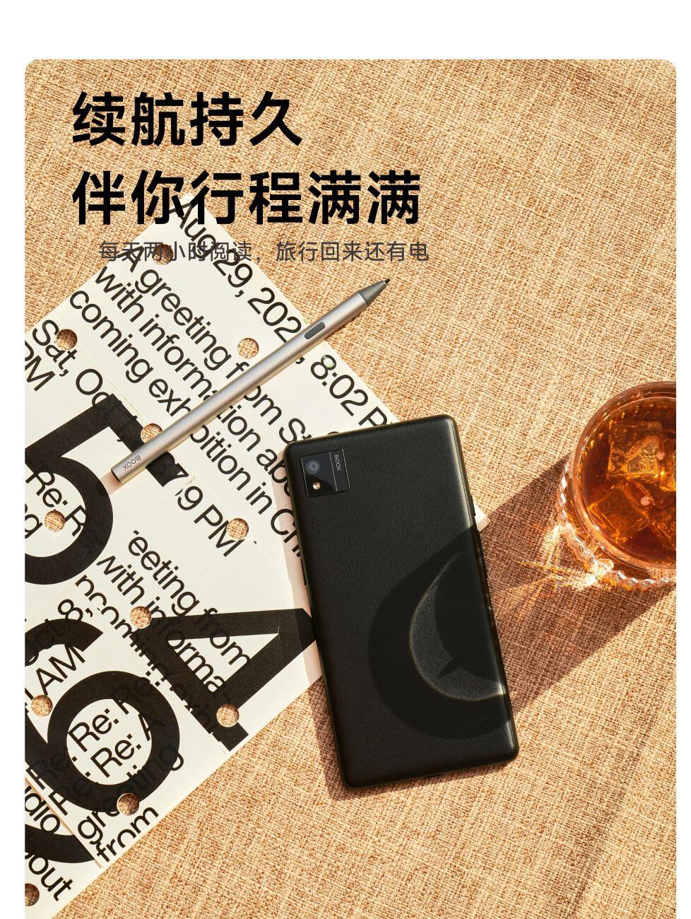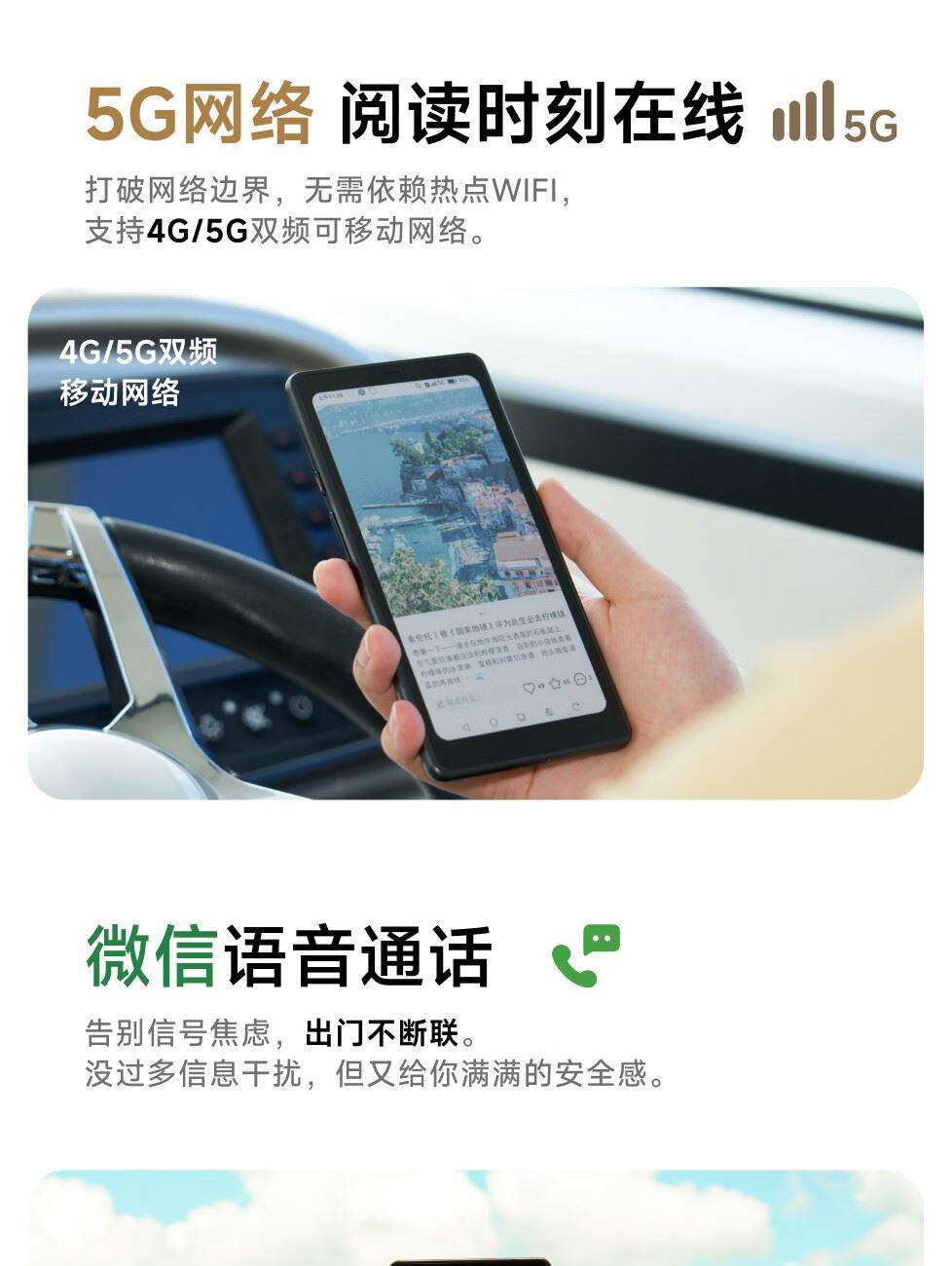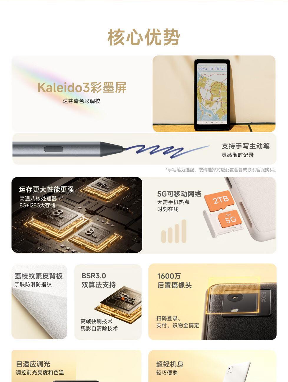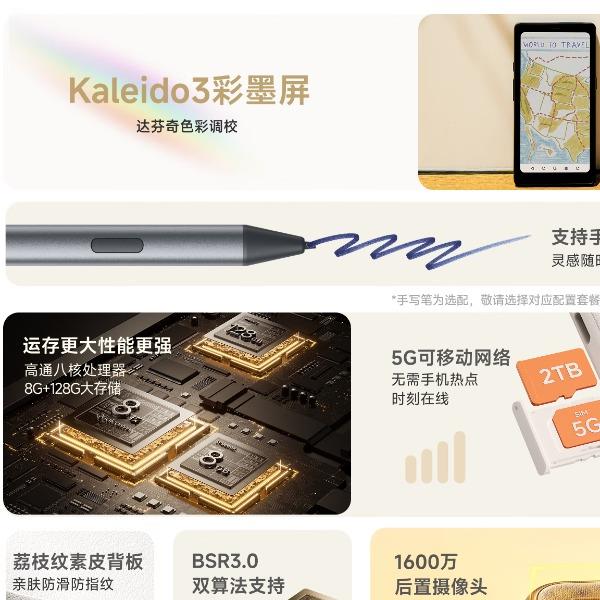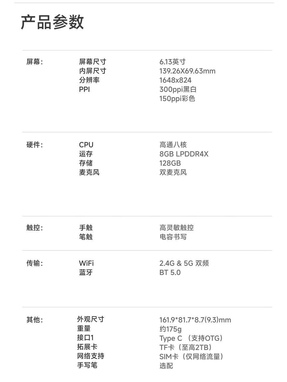 屏幕尺寸:6.13 分辨率:1648x824 300ppi黑白 150ppi彩色 CPU:高通八核2.0GHz 配置:8GB+12GB WIFI:2.4G&5G双频 蓝牙:BT5.0 重量:175g 卖点说明:运存更大性能更强高通八核处理器8G+128G大存储;打破网络边界,无需依赖热点WIFI,支持4G/5G双频可移动网络;彩墨视界,类纸护眼,无论置身何处皆赏心悦目;睿智感光,智能调光,无论置身何处皆赏心悦目