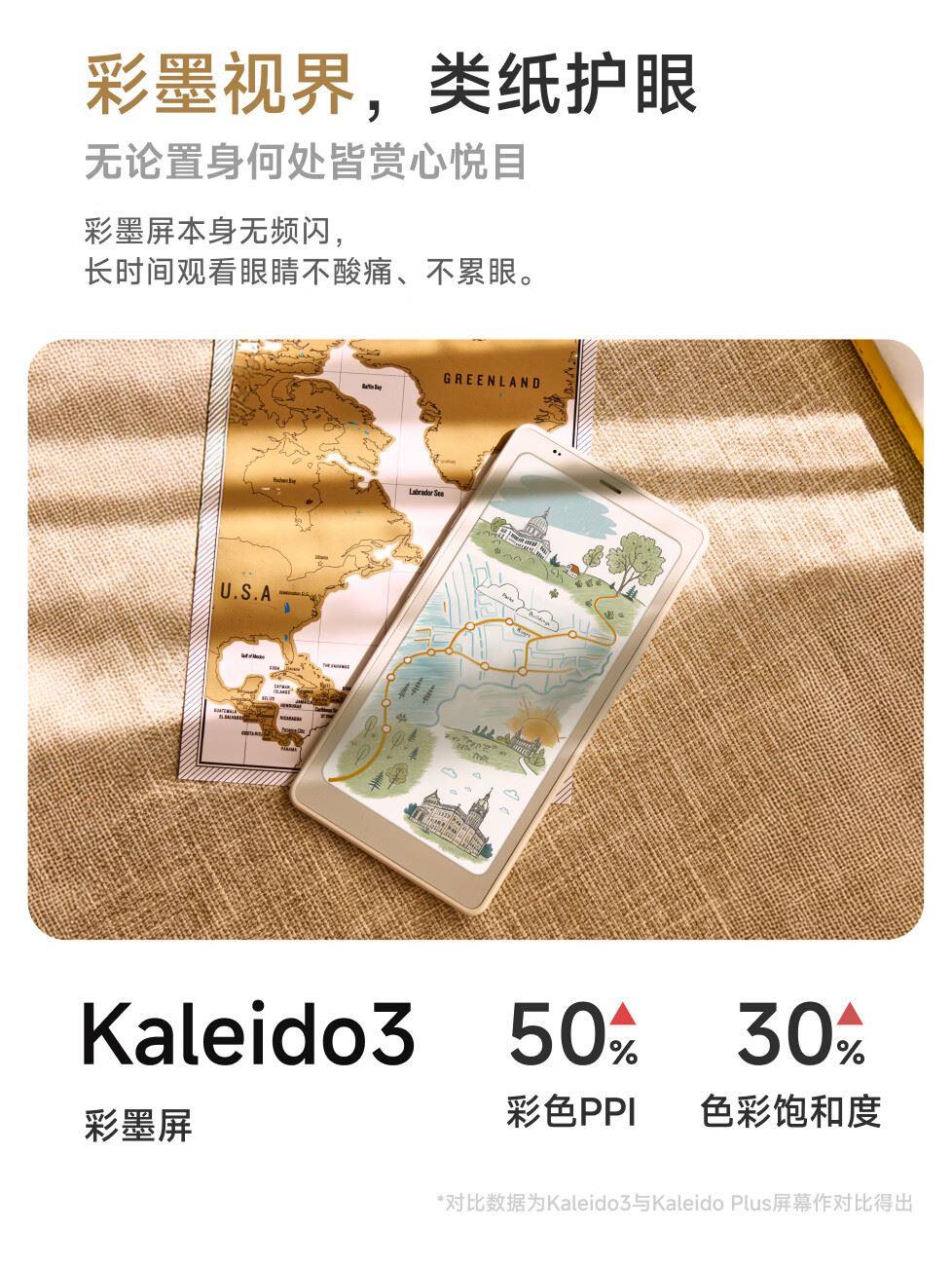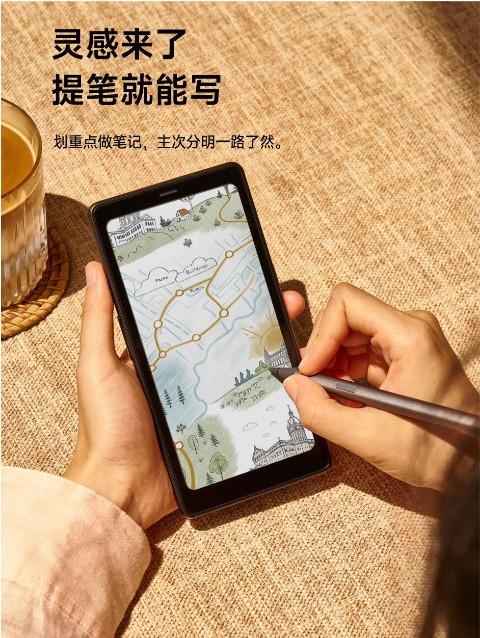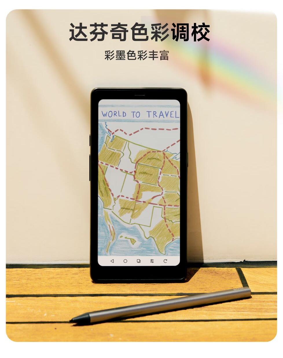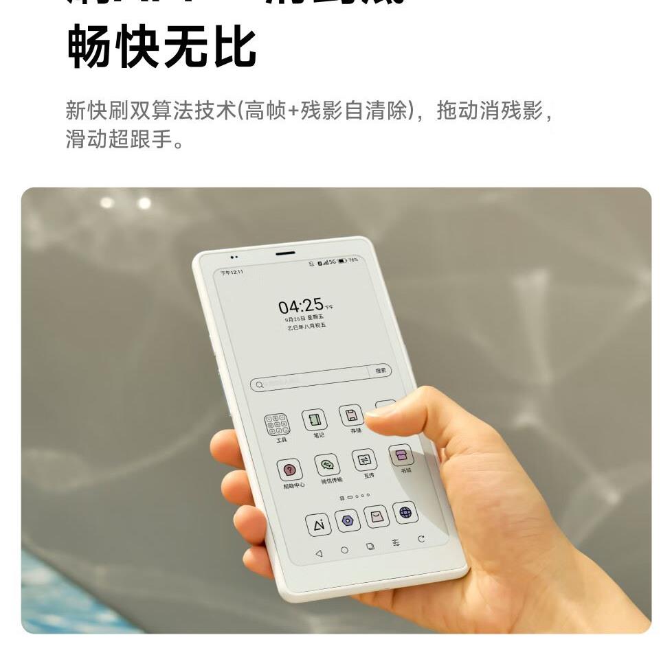 屏幕尺寸:6.13 分辨率:1648x824 300ppi黑白 150ppi彩色 CPU:高通八核2.0GHz 配置:8GB+12GB WIFI:2.4G&5G双频 蓝牙:BT5.0 重量:175g 卖点说明:运存更大性能更强高通八核处理器8G+128G大存储;打破网络边界,无需依赖热点WIFI,支持4G/5G双频可移动网络;彩墨视界,类纸护眼,无论置身何处皆赏心悦目;睿智感光,智能调光,无论置身何处皆赏心悦目
