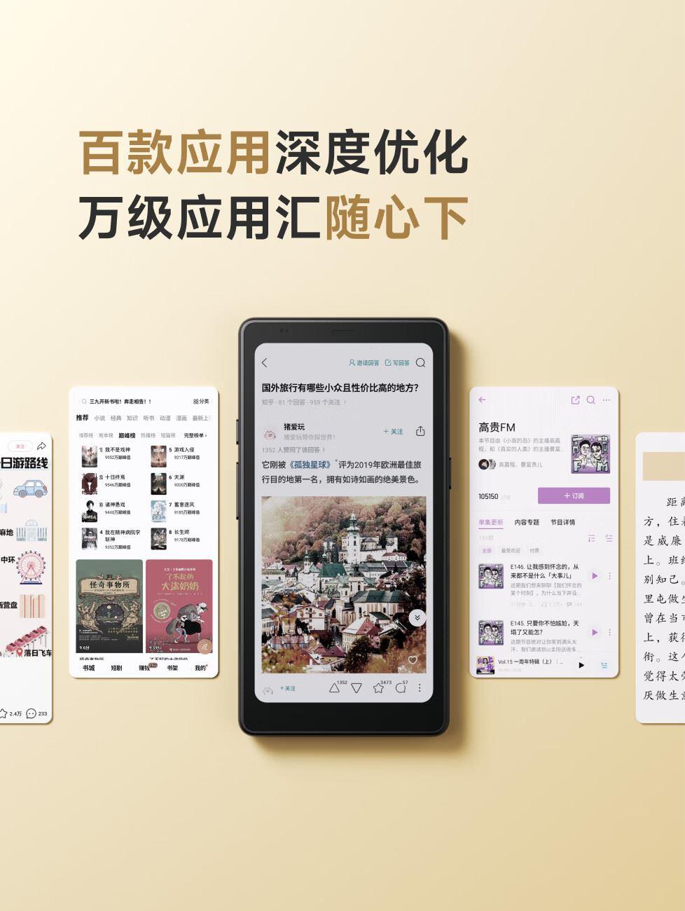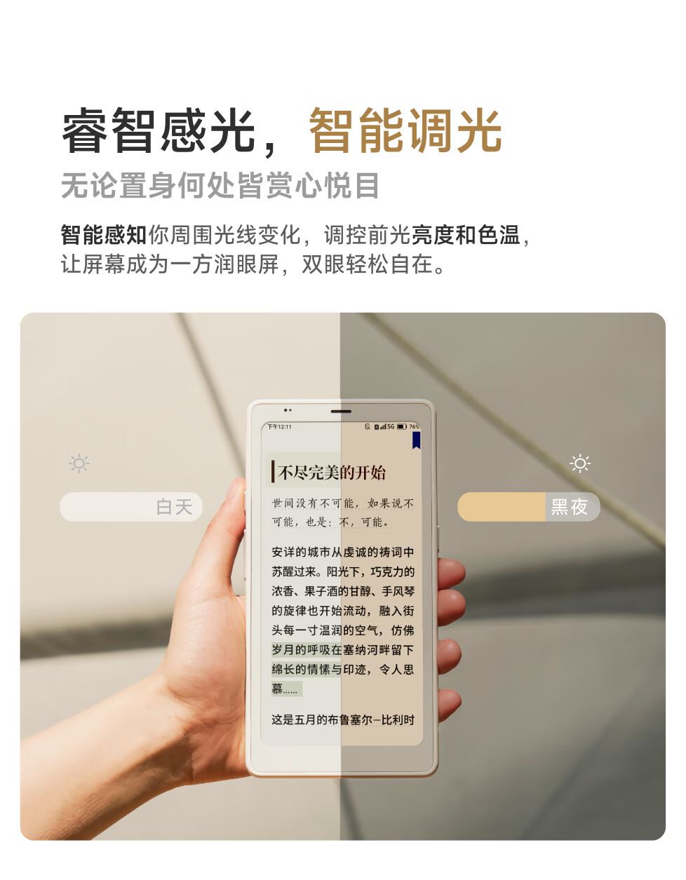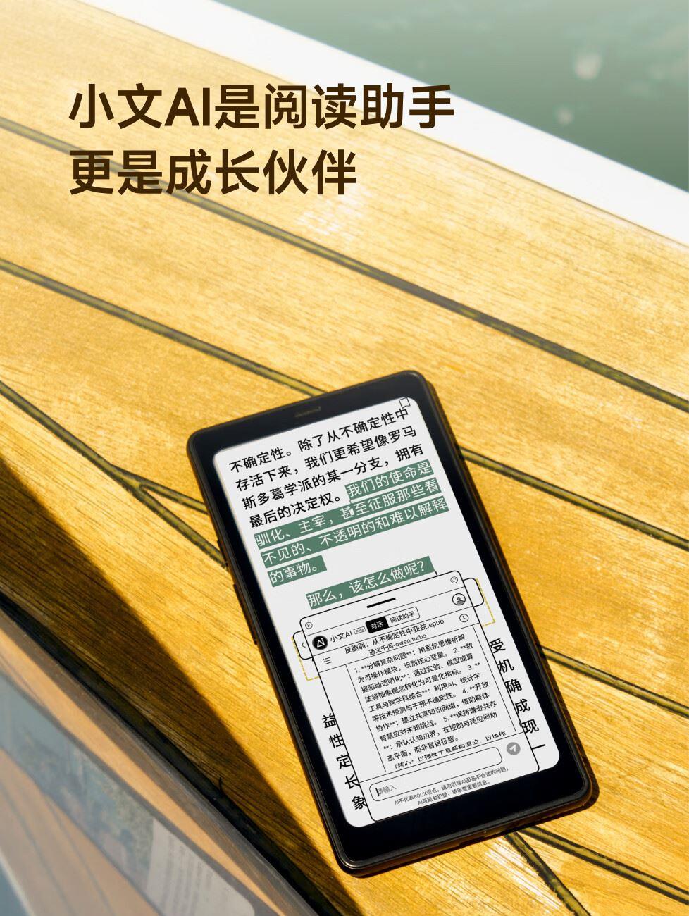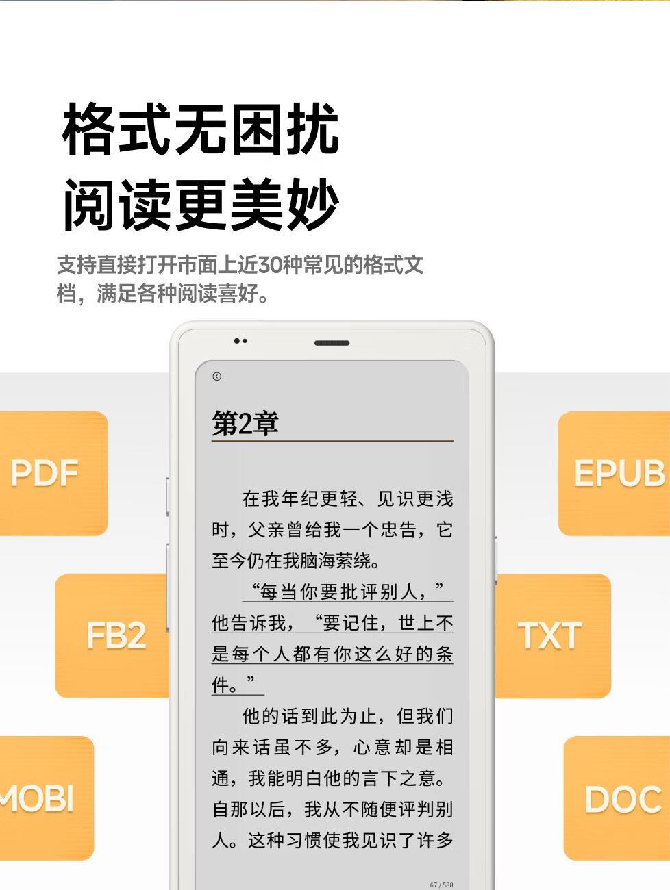 屏幕尺寸:6.13 分辨率:1648x824 300ppi黑白 150ppi彩色 CPU:高通八核2.0GHz 配置:8GB+12GB WIFI:2.4G&5G双频 蓝牙:BT5.0 重量:175g 卖点说明:运存更大性能更强高通八核处理器8G+128G大存储;打破网络边界,无需依赖热点WIFI,支持4G/5G双频可移动网络;彩墨视界,类纸护眼,无论置身何处皆赏心悦目;睿智感光,智能调光,无论置身何处皆赏心悦目