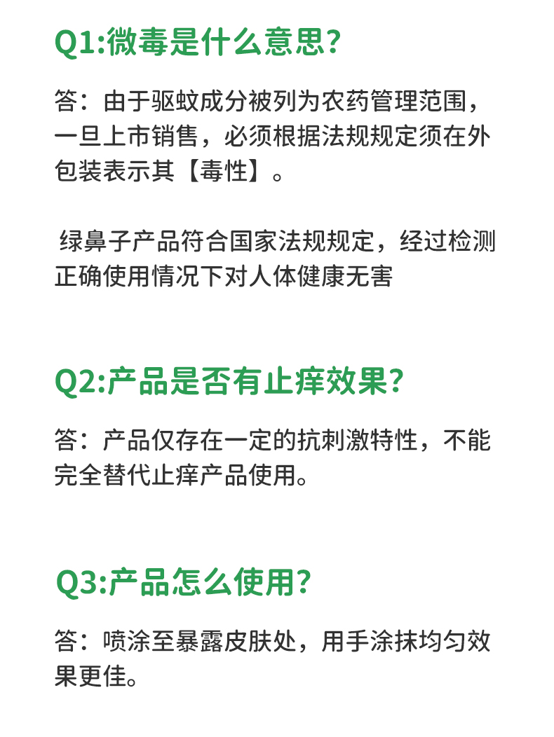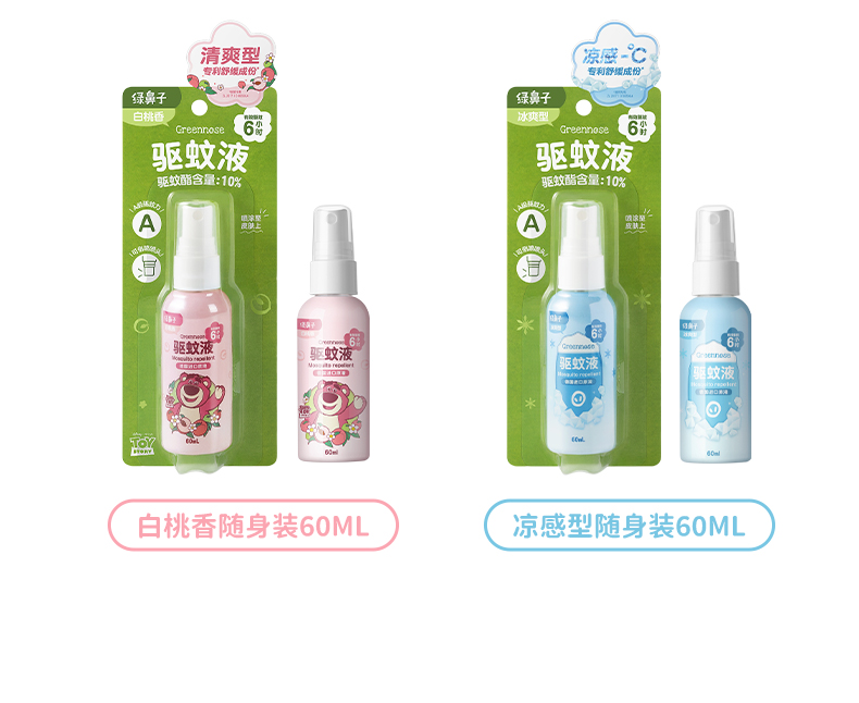 无酒精无香精款 1.无香无酒精 2.抗刺激成份 3.进口驱蚊酯;WHO-定义安全级别为U级 凉感款 1.凉感不辣肤 2.抗刺激成份 3.进口驱蚊酯;WHO-定义安全级别为U级