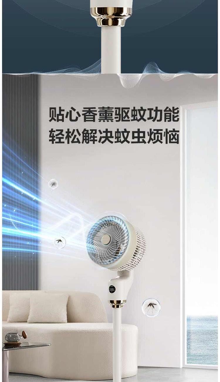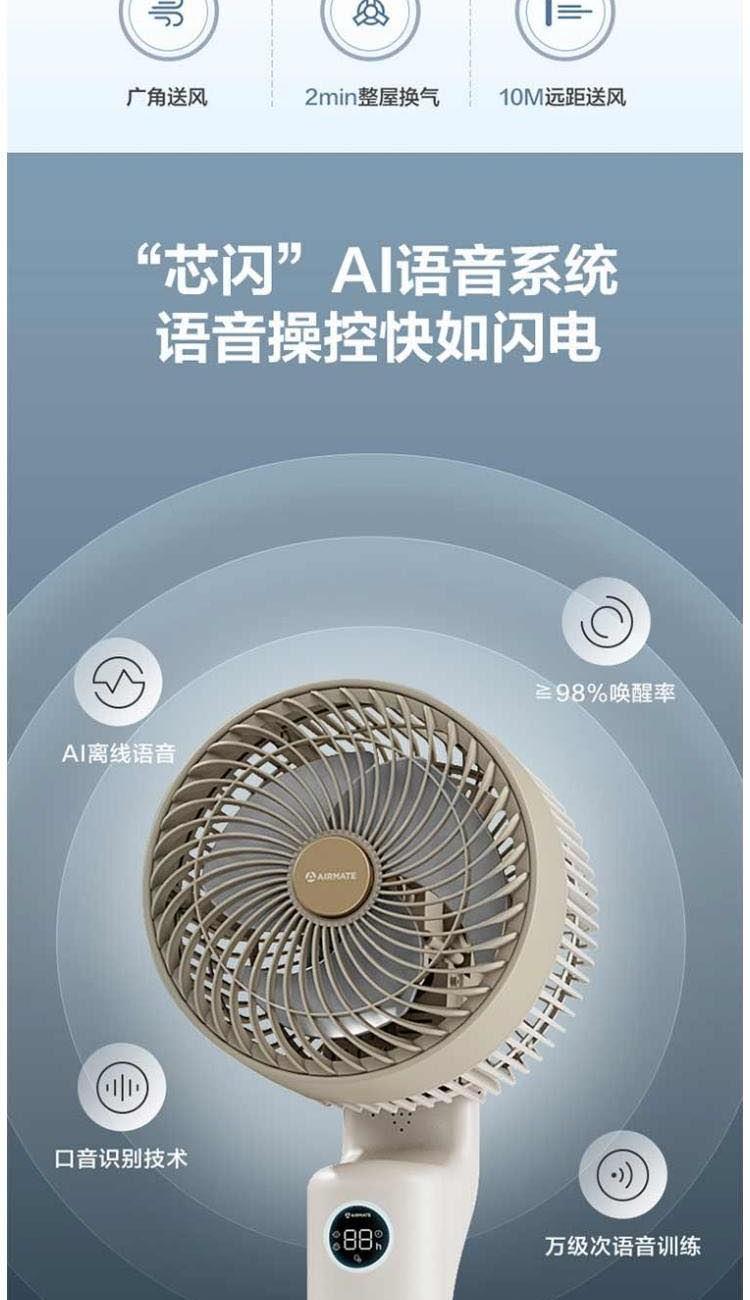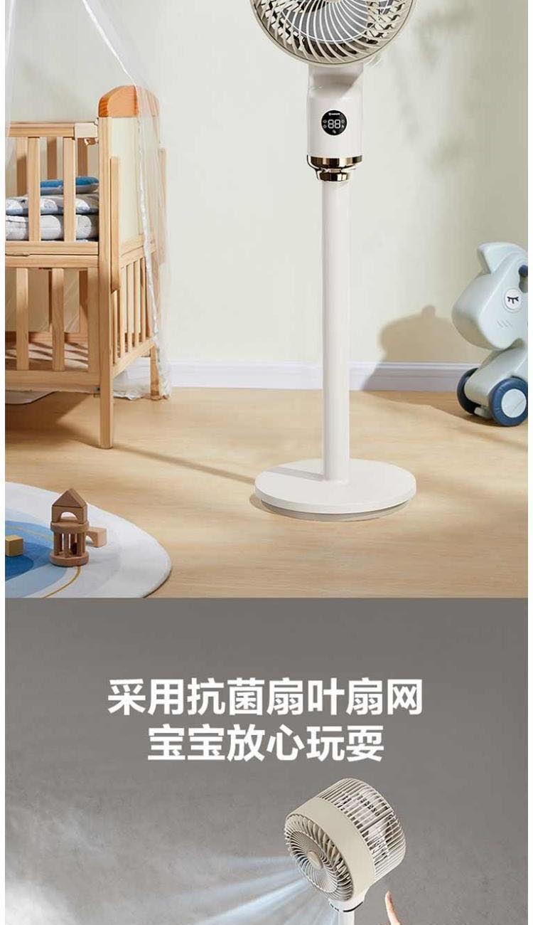 额定电压:220V~ 额定频率:50Hz 额定功率:40W 净重:3.7kg 毛重:4.5kg 外箱尺寸:595*238*32mm 1、AI语音控制,“芯闪”语音系统,语音控制快如闪电 2、台地两用,适合多个生活场景 3、手机小程序控制 4、3D立体摆风,上下自动90°循环,左右自动60°摆风,满足多种需求 5、8档风速随心调节,预约定时9H 6、采用抗 菌扇叶,宝宝放心玩耍 7、高清显示屏一目了然,记忆功能无需每次调节,30s自动息屏 8:贴心驱蚊香薰功能 轻松解决蚊虫烦恼