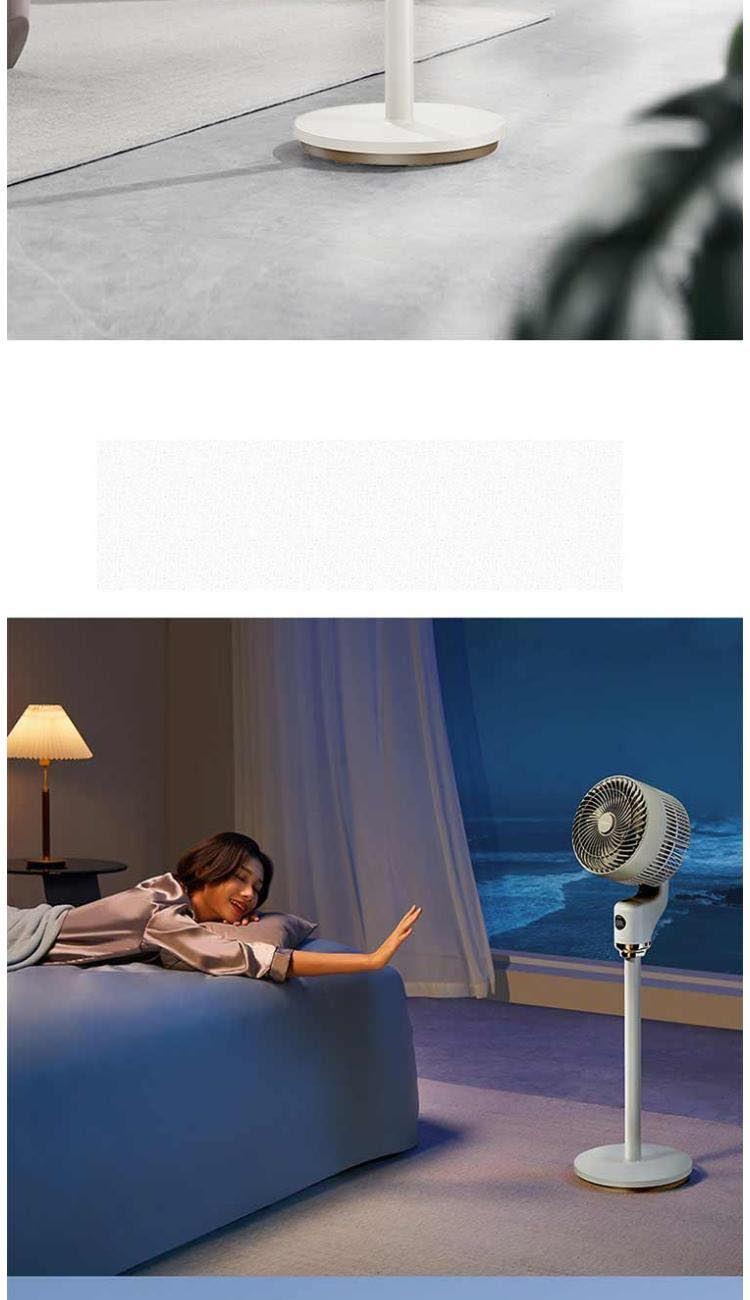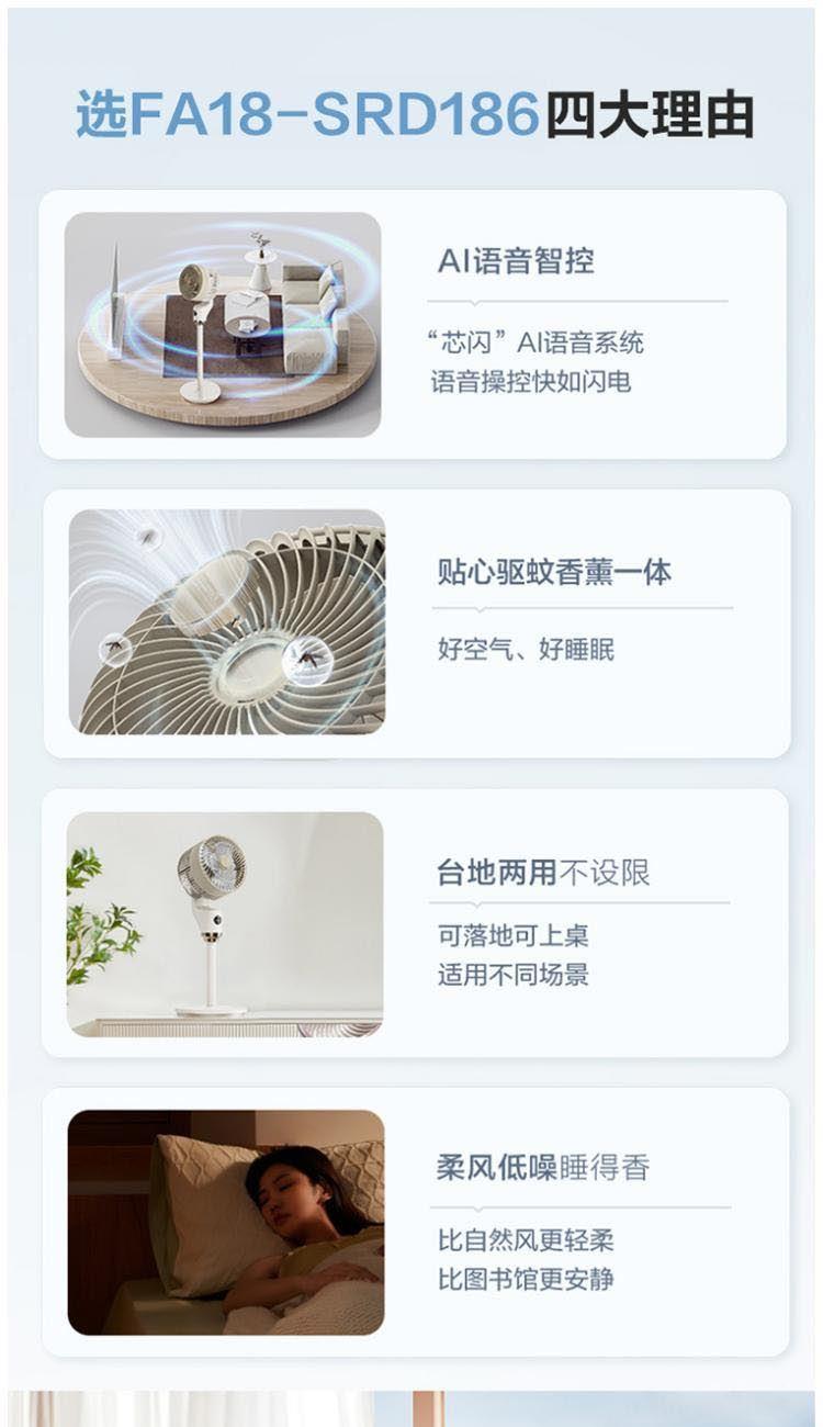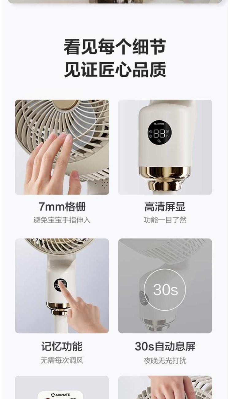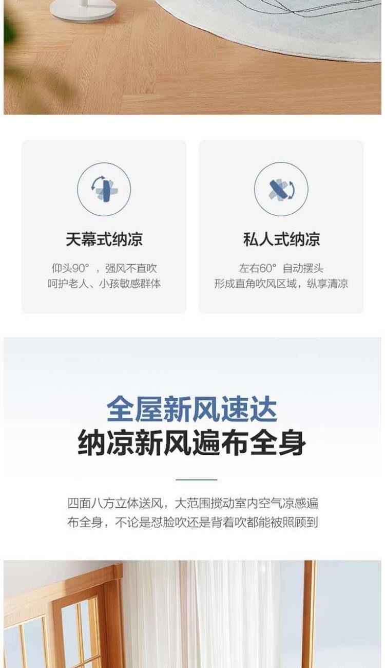 额定电压:220V~ 额定频率:50Hz 额定功率:40W 净重:3.7kg 毛重:4.5kg 外箱尺寸:595*238*32mm 1、AI语音控制,“芯闪”语音系统,语音控制快如闪电 2、台地两用,适合多个生活场景 3、手机小程序控制 4、3D立体摆风,上下自动90°循环,左右自动60°摆风,满足多种需求 5、8档风速随心调节,预约定时9H 6、采用抗 菌扇叶,宝宝放心玩耍 7、高清显示屏一目了然,记忆功能无需每次调节,30s自动息屏 8:贴心驱蚊香薰功能 轻松解决蚊虫烦恼