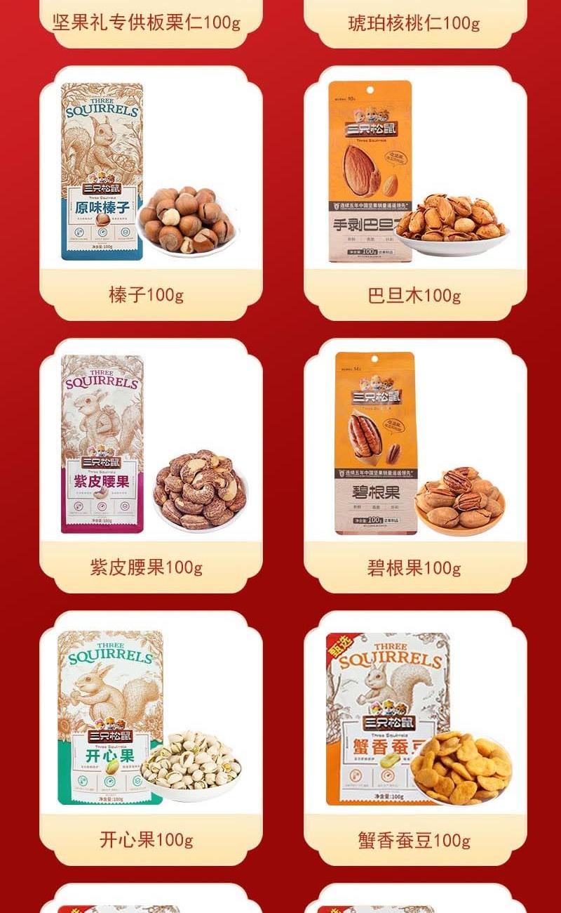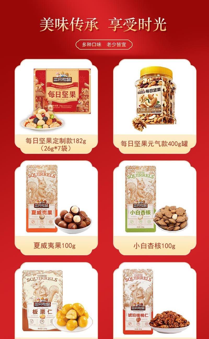 三只松鼠每日坚果定制款182g(26g*7袋) 三只松鼠每日坚果元气款400g罐装 三只松鼠夏威夷果100g 三只松鼠小白杏核100g 三只松鼠板栗仁100g 三只松鼠琥珀核桃仁100g 三只松鼠榛子100g 三只松鼠巴旦木100g 三只松鼠紫皮腰果100g(FX) 三只松鼠碧根果100g 三只松鼠开心果100g 三只松鼠蟹香蚕豆100g 三只松鼠蟹黄味瓜子仁100g 三只松鼠多味花生100g 三只松鼠灰枣75g 三只松鼠山药脆片番茄味60g 三只松鼠小圆饼奶盐味100g 三只松鼠红豆薏米水500ml 三只松鼠红豆薏米水500ml
