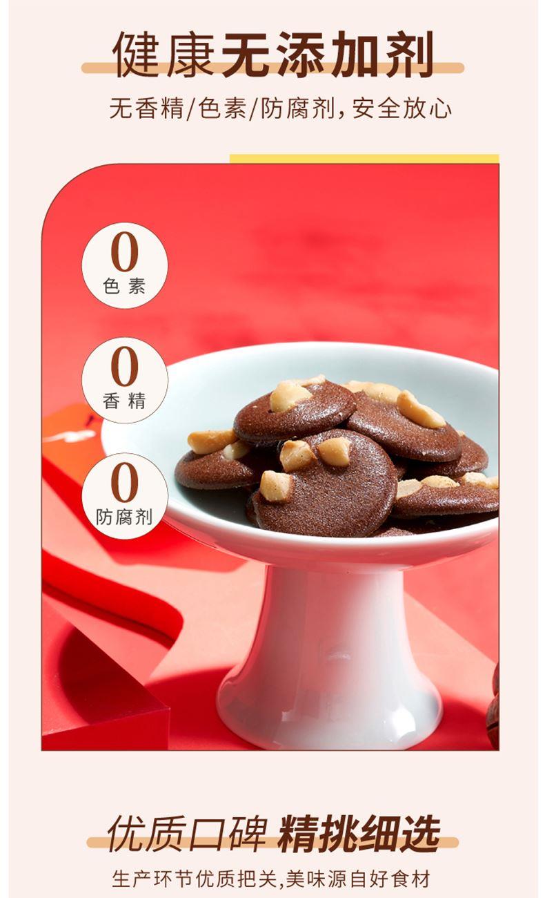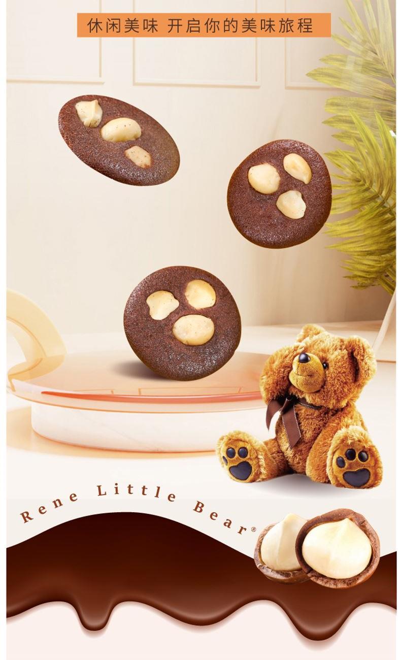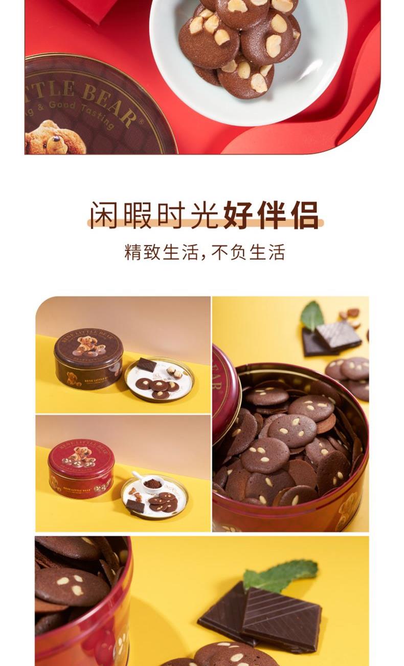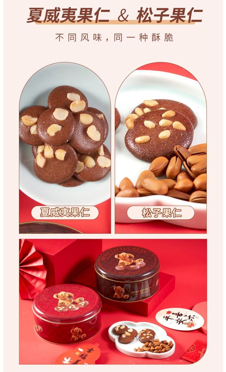 产品净含量:255g 产品保质期:8个月 产品包装:精致铁罐配精美礼品袋 产品卖点:选用进口安佳黄油、法芙娜可可粉,饱满大果仁,只用真材实料,三个零添加(膨松剂、色素、香精),无反式脂肪酸,小孩、孕妇、老人放心食用。香港小熊在全国专柜和专卖店有500多家,品质保证,售后安心。