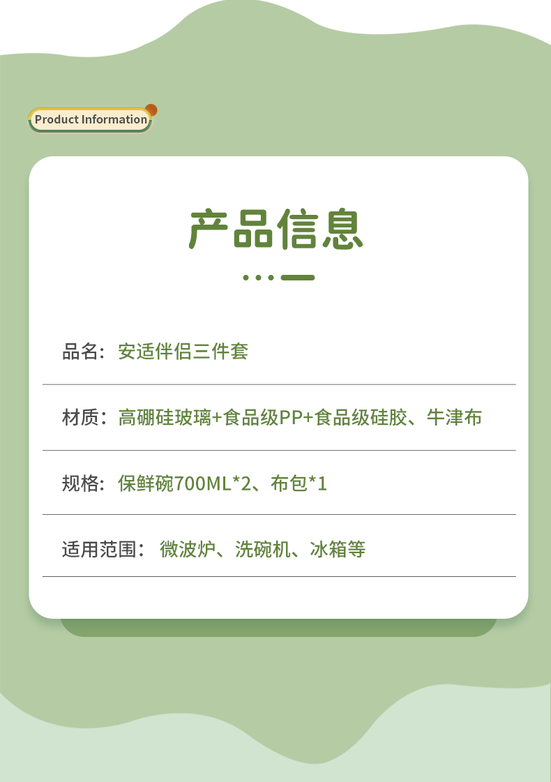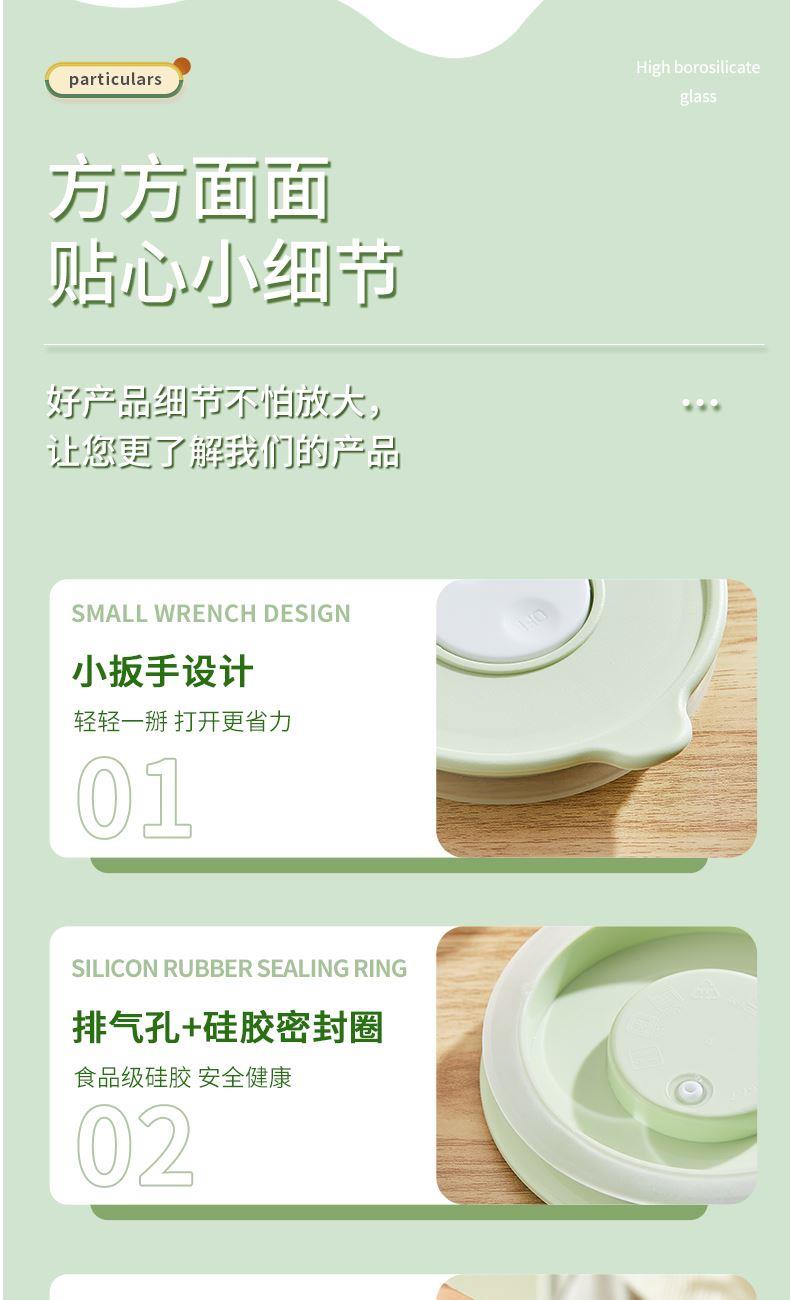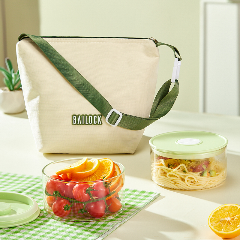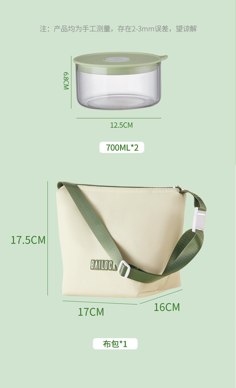 材 质:高硼硅玻璃、食品级PP、食品级硅胶、牛津布 产品参数:中保鲜盒700ml*2、布包*1 彩盒尺寸:350*89*209mm 外箱尺寸:55.8*36.4*43.6cm 产品卖点:1.产品采用高硼硅玻璃材质,通透性好,具有极 佳耐热性和耐寒性,清洗方便,不易残留细菌。 2.经过精心设计的轻量化处理,重量减轻了50%以上,大大改善了传统玻璃保鲜盒笨重的缺陷,使用更加便捷。 3. 将保温功能隐于极简时尚的包型之中,实现“带饭包”向“日常通勤包”的视觉跃升。