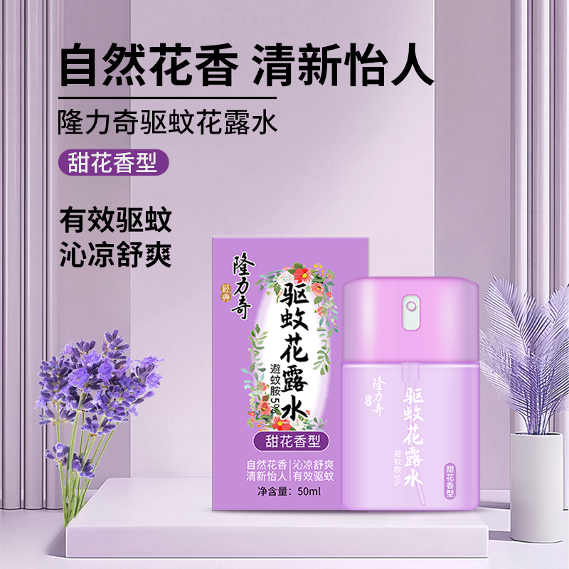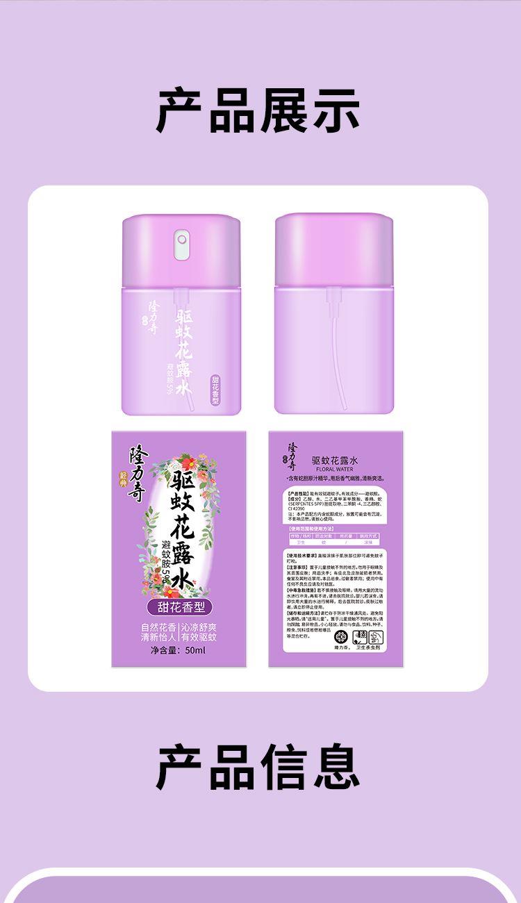隆力奇甜花香型驱蚊花露水50ml 货号:LLQ-2025050601 净含量:50ml 保 质 期:3年 功效:驱蚊止痒 提神醒脑 持久凝香 喷头设计,简单易用 外箱尺寸:313*217*235mm 产品卖点: 1.天然甜花香氛,驱蚊同时舒缓安神; 2.草本温和配方,快速止痒不刺激肌肤3.长效防护12小时,清爽便携全家适用。