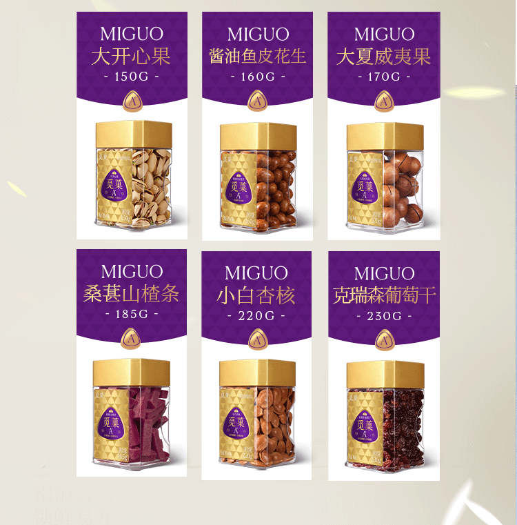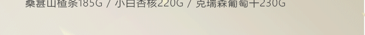 大开心果150g 大夏威夷果170g 小白杏核220g 酱油鱼皮花生160g 桑葚山楂条185g 克瑞生葡萄干 230g