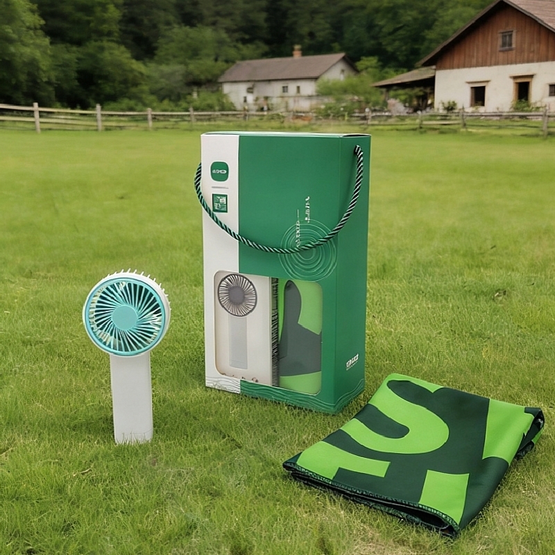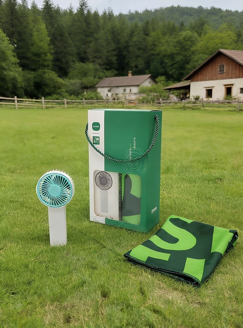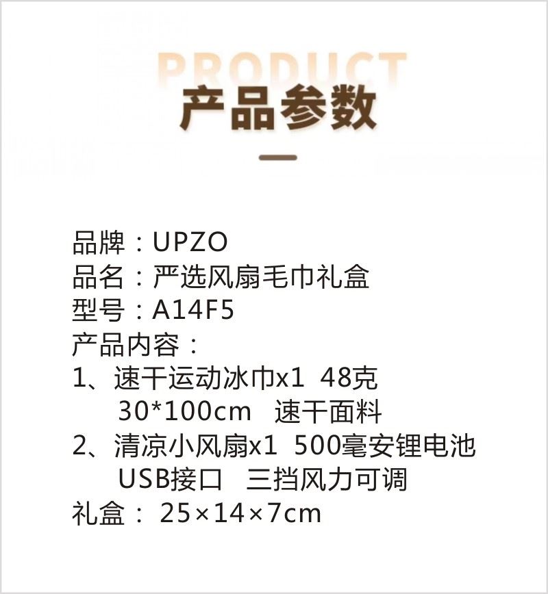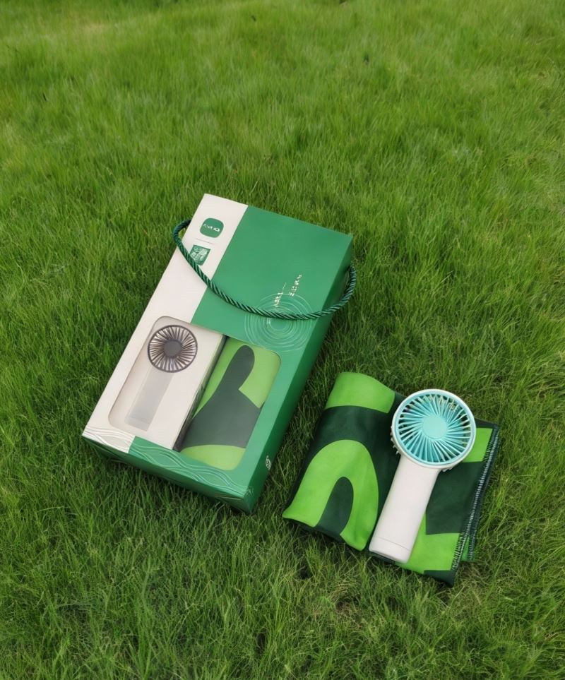 型号:A14F5 产品内容: 1、速干运动冰巾*1 48克 规格:30*100CM 材质:速干面料 2、清凉小风扇*1 500毫安锂电池 USB接口 (续航时间90分钟左右 三挡风力可调) 礼盒规格:25*14*7CM 七彩运动冰巾精选冷感面料结合数码印花工艺 清凉小风扇 500毫安 续航90分钟左右 风力三挡