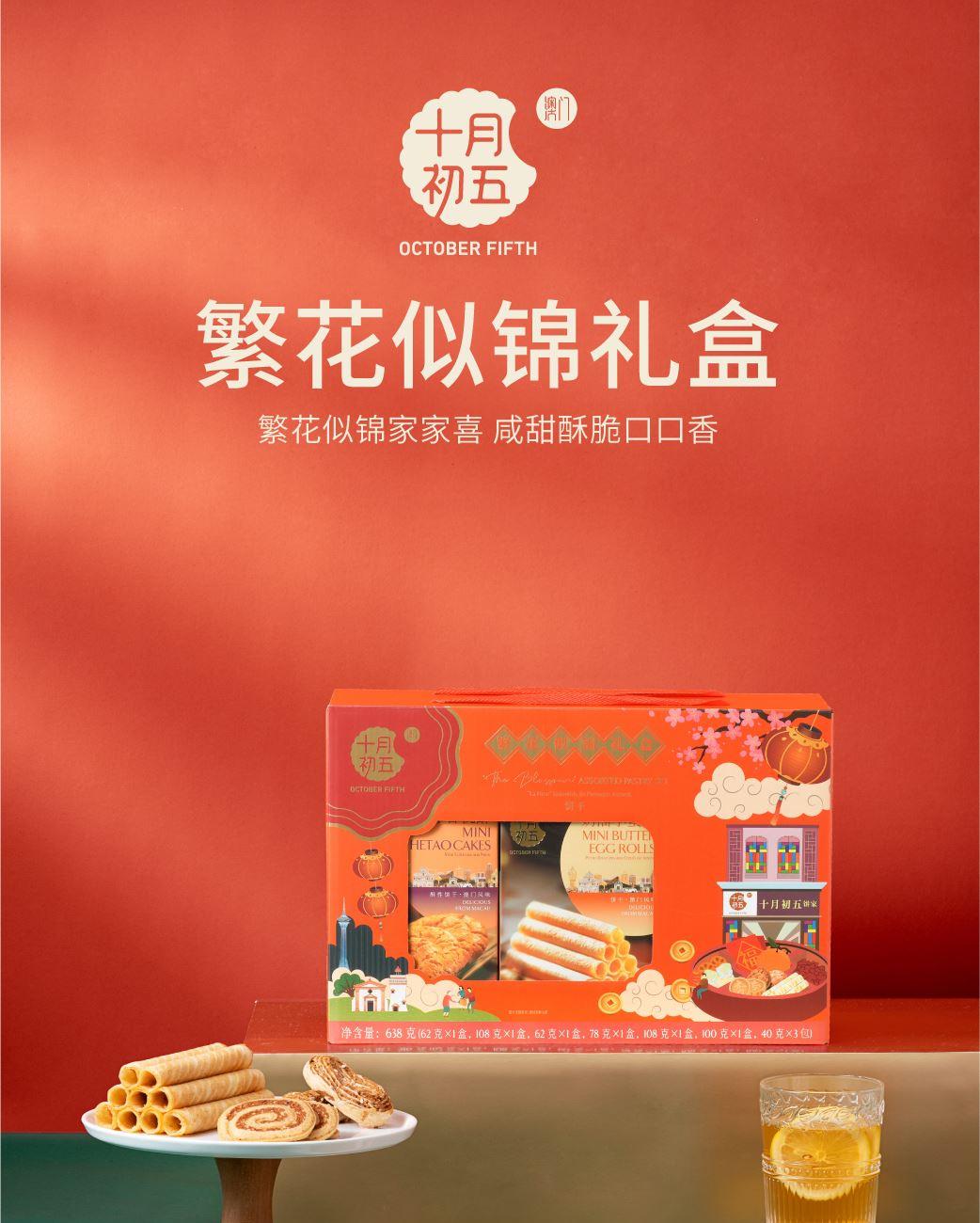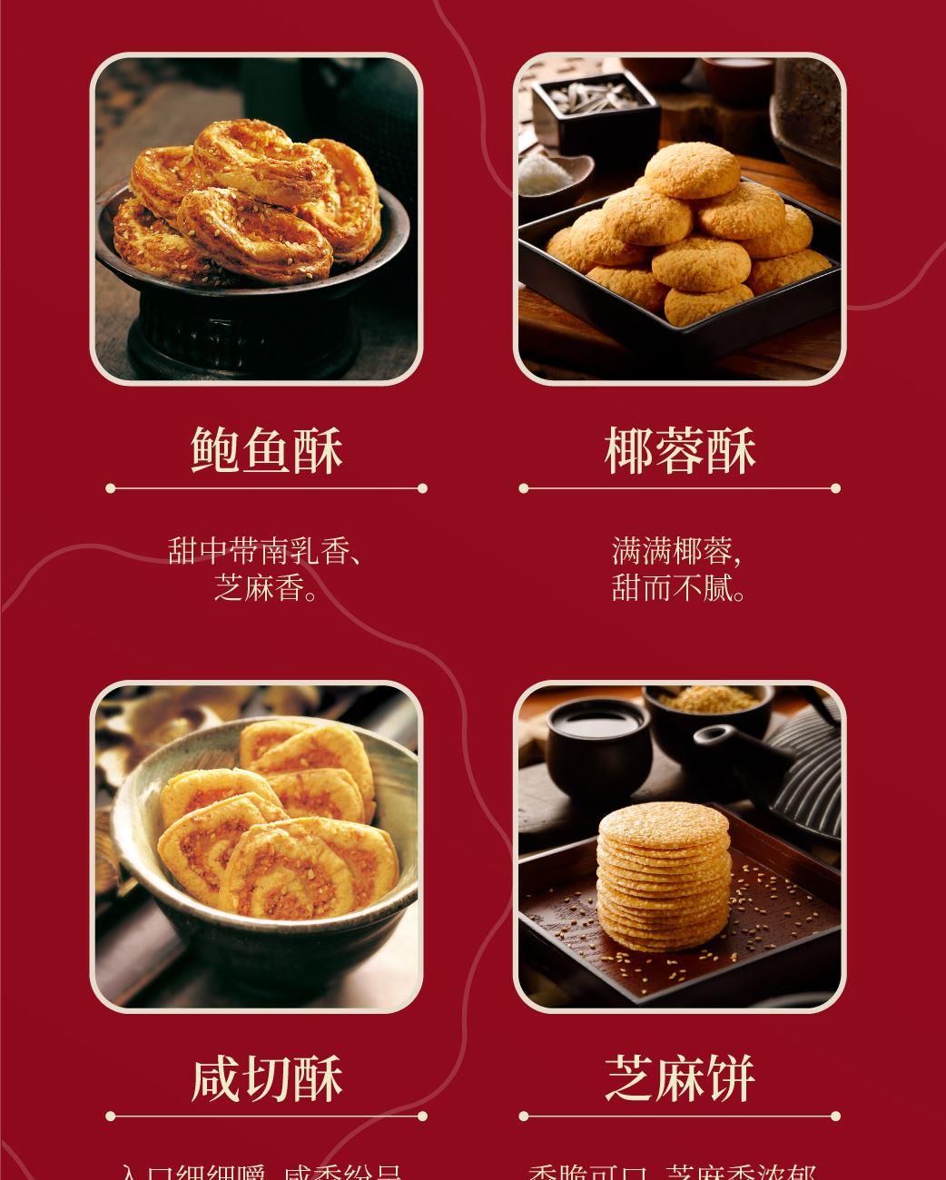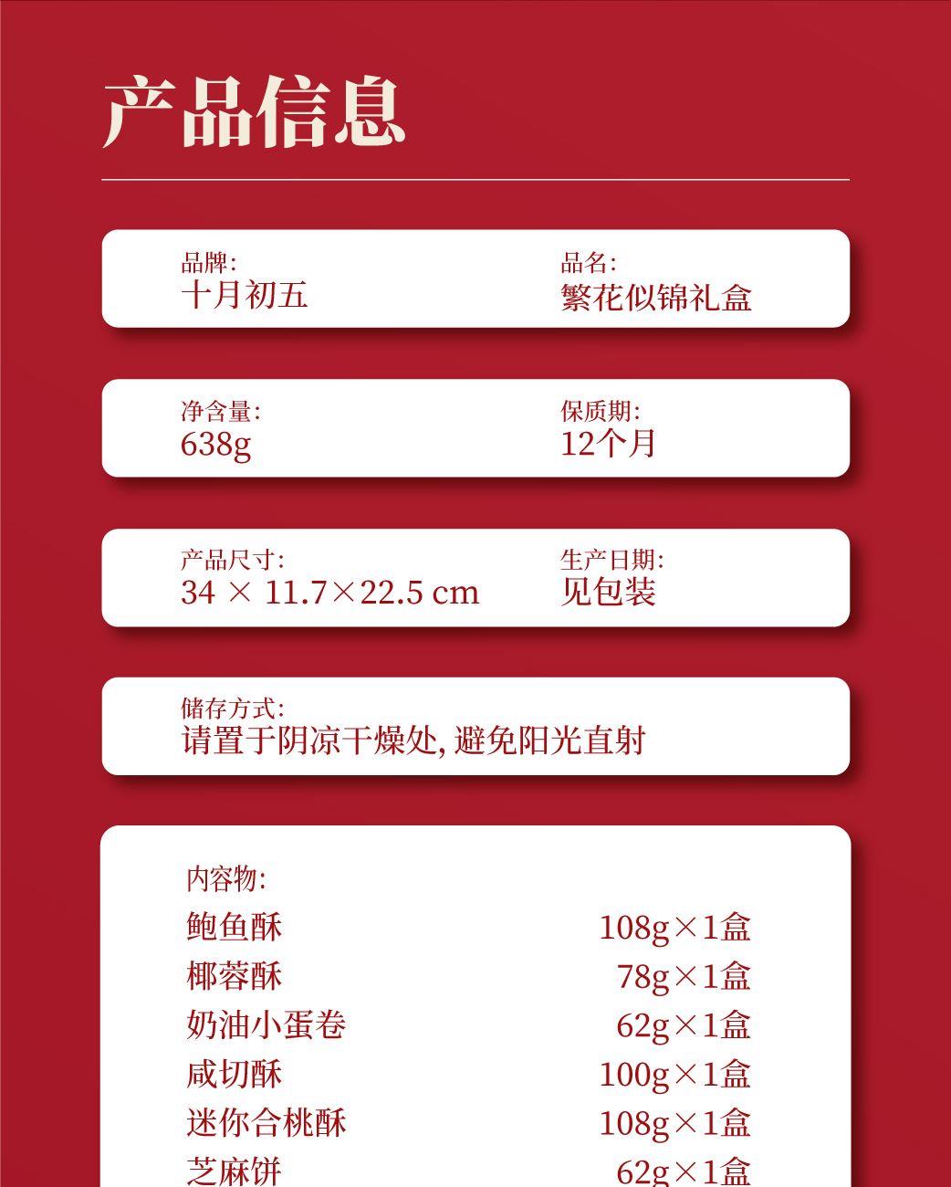 十月初五繁花似锦礼盒 净含量:638g 62g芝麻饼X1盒 108g鲍鱼酥X1盒 62g奶油小蛋卷X1盒 78g椰蓉酥X1盒 108g迷你合桃酥X1盒 100g咸切酥X1盒 40g小口曲奇(生椰拿铁味)X3包