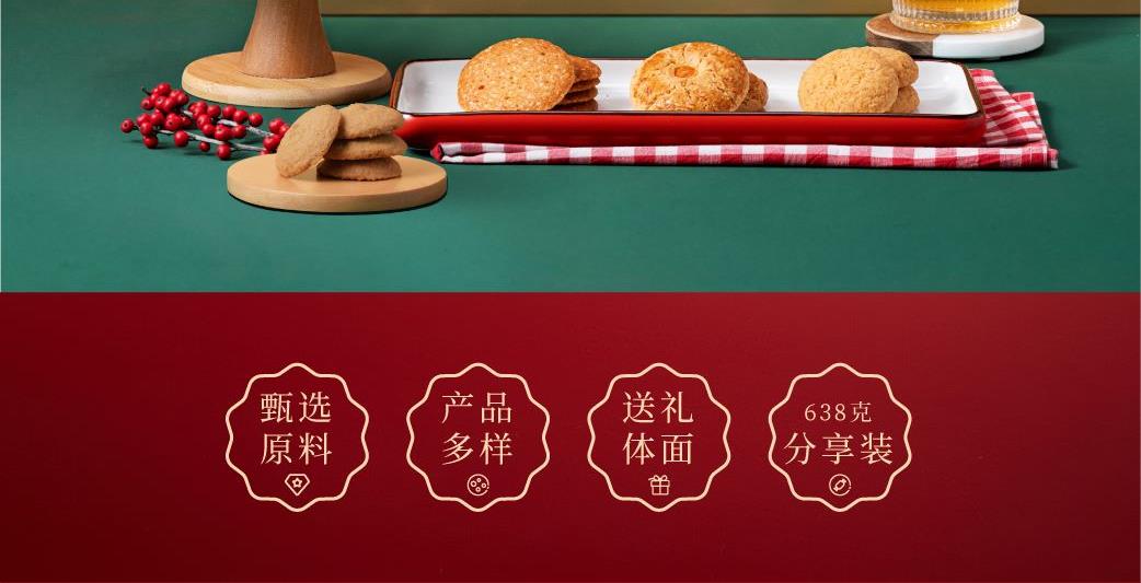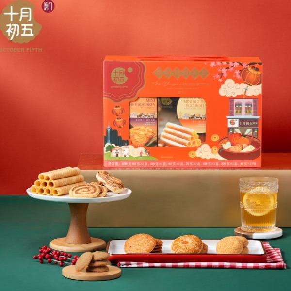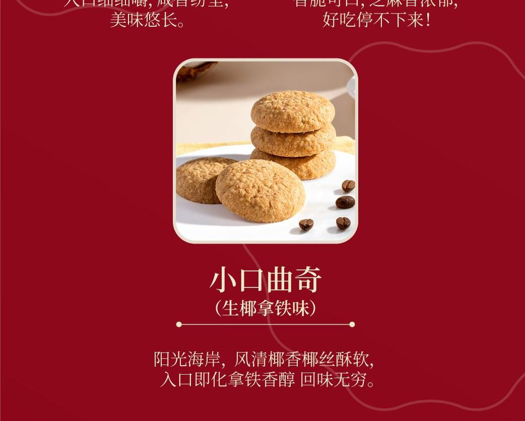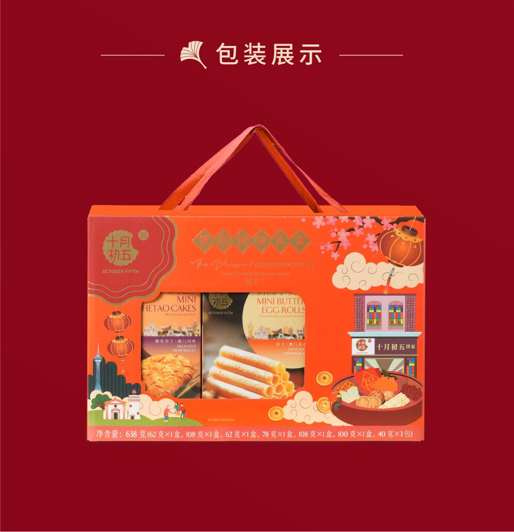 十月初五繁花似锦礼盒 净含量:638g 62g芝麻饼X1盒 108g鲍鱼酥X1盒 62g奶油小蛋卷X1盒 78g椰蓉酥X1盒 108g迷你合桃酥X1盒 100g咸切酥X1盒 40g小口曲奇(生椰拿铁味)X3包