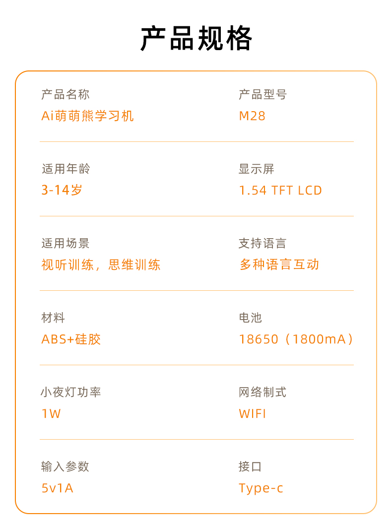 产品型号:M28 产品净重:290/300/345g 产品尺寸:198*117*116.8(不同IP尺寸不同) 彩盒尺寸:195*220*132mm 产品颜色:白色,蓝色,粉色 材质:ABS+硅胶 适用人群:3-11岁 音响喇叭:4Ω3W 待机时长:6-8小时 电池:18650 1800mA 显示屏:1.54寸 TFT LCD 输入:5V1A 充电端口:TYPE-C 网络制式:LTE-TDD,LTE-FDD 网络支持:4G移动/电信/联通 卖点: 1.连接 豆包 deepseek 通义千问 三大AI模板,孩子想学的应有尽有。 2.语音唤醒 。 3.温馨小夜灯 语音开关灯。 4.智能闹钟