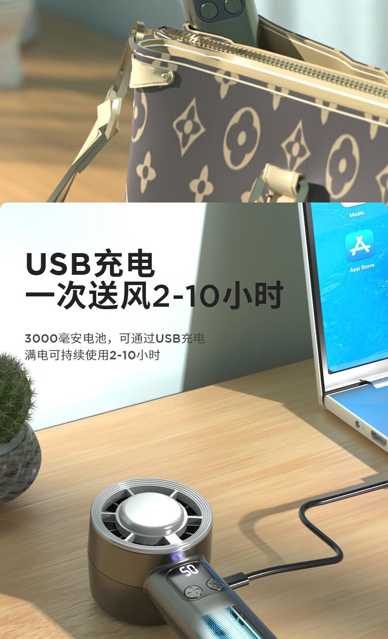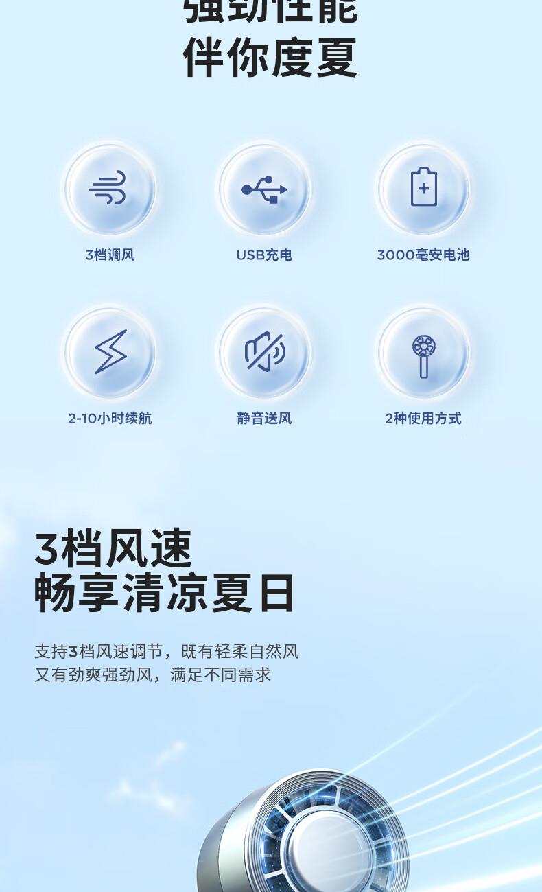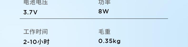 功率:8W 毛重:0.4kg 档位:3档 产品尺寸: 228*115*61mm 3档风速调节 USB快速充电 半导体制冷 轻音送风 小巧便携
