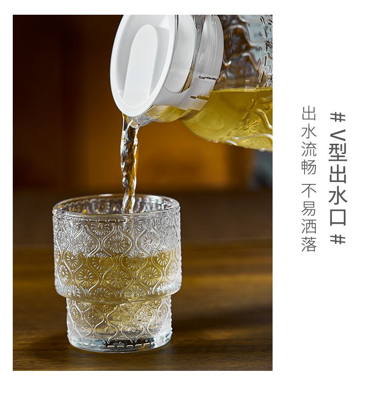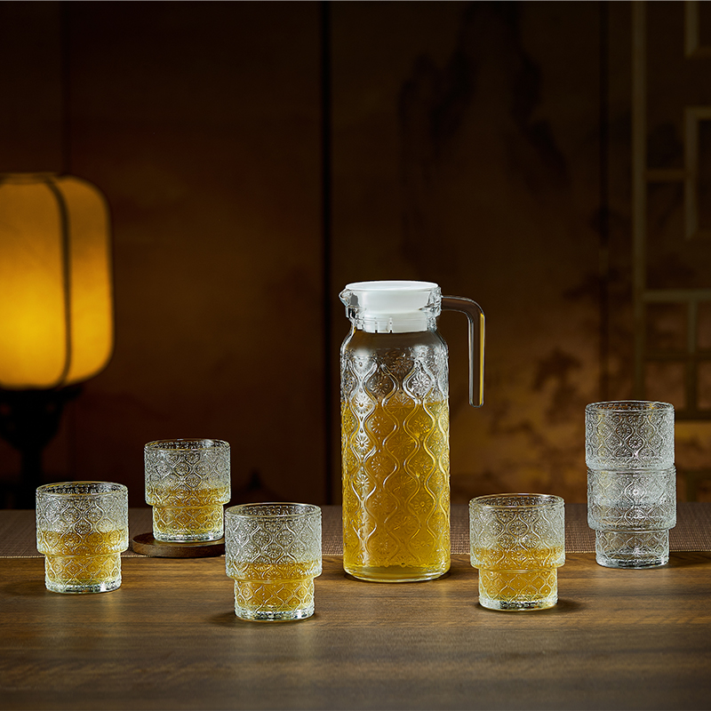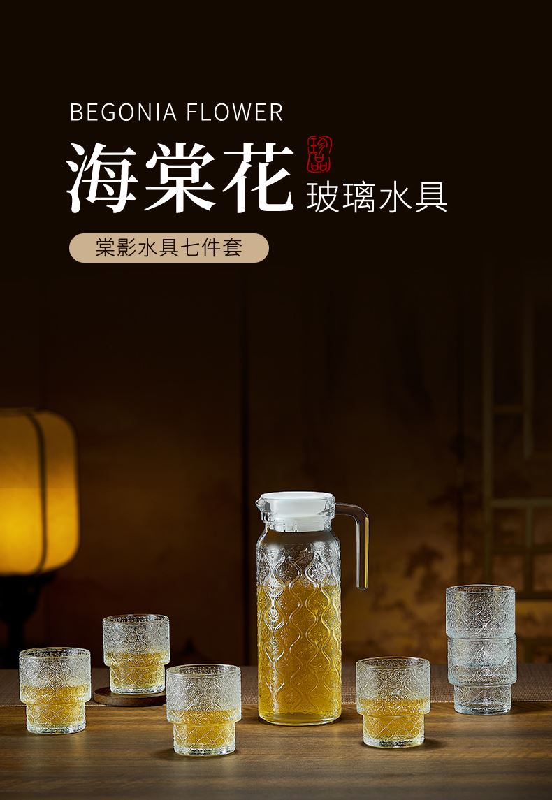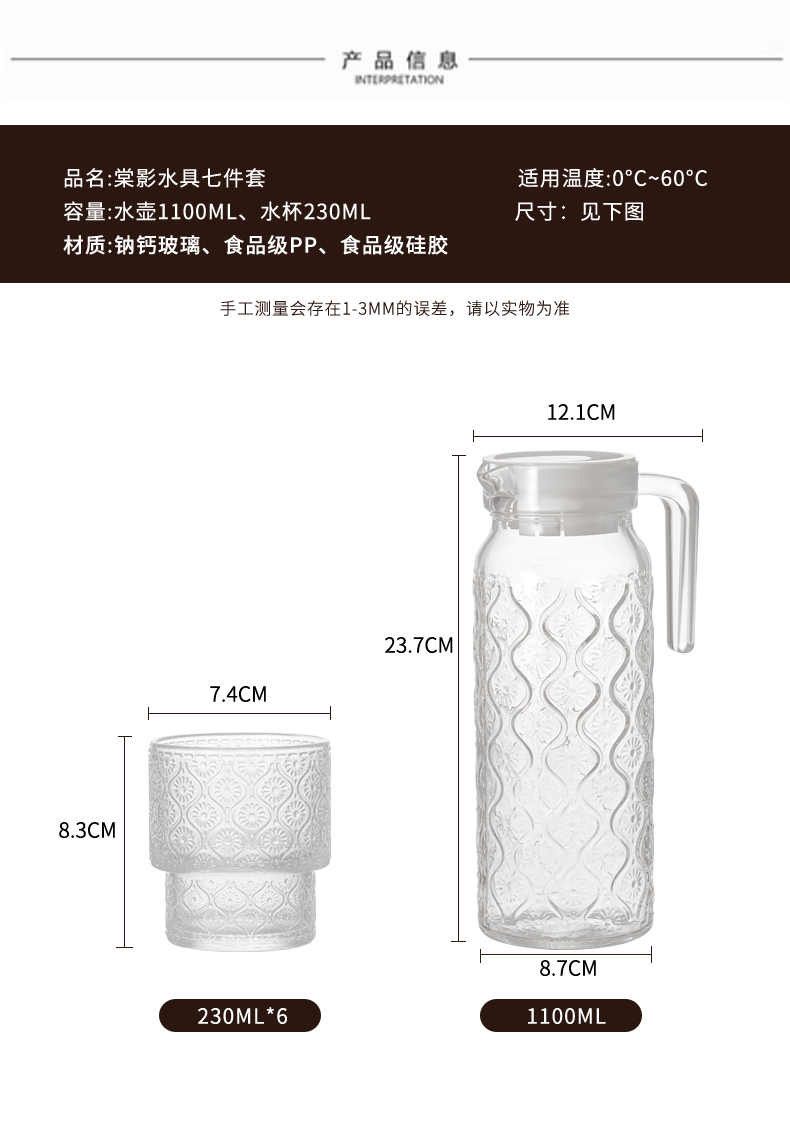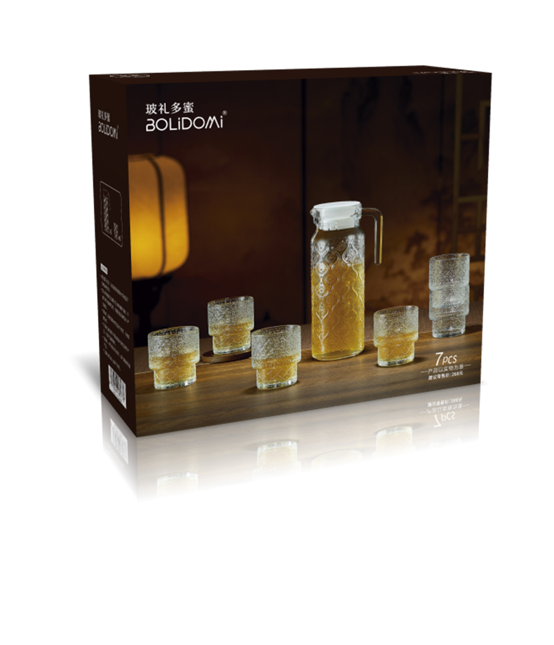 【组合】:水杯230ml*6、水壶1100ml*1 【材质】:高白料钠钙玻璃、食品级PP、食品级硅胶 【彩盒尺寸】:301*98*267mm 【外箱尺寸】:41.2*31.5*55.2cm 【毛重】:18.9KG 产品卖点:1本产品采用无铅玻璃材质,保证每一滴水都无毒无害,符合国际食品安全标准,确保消费者健康。 2、融入中国传统窗花元素,巧妙结合现代审美与传统文化,精致的纹理设计让每个细节都充满艺术感,适合作为家居装饰或礼品赠 送。 3、在同类市场中,本套装无论从材质、设计还是工艺上都具有超高性价比,满足企业客户和批发需求,是礼品行业的理想选择。