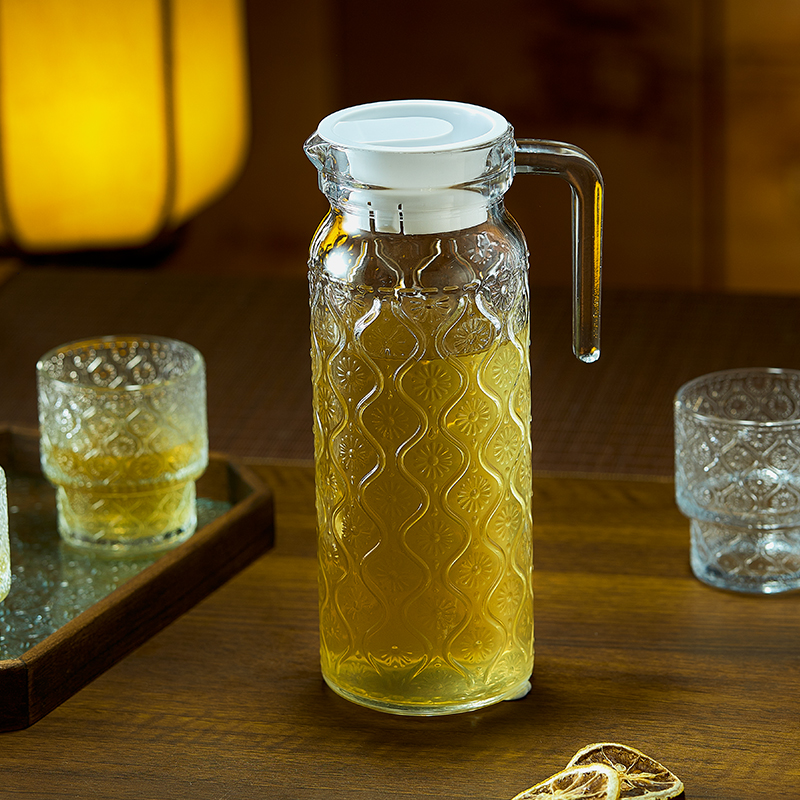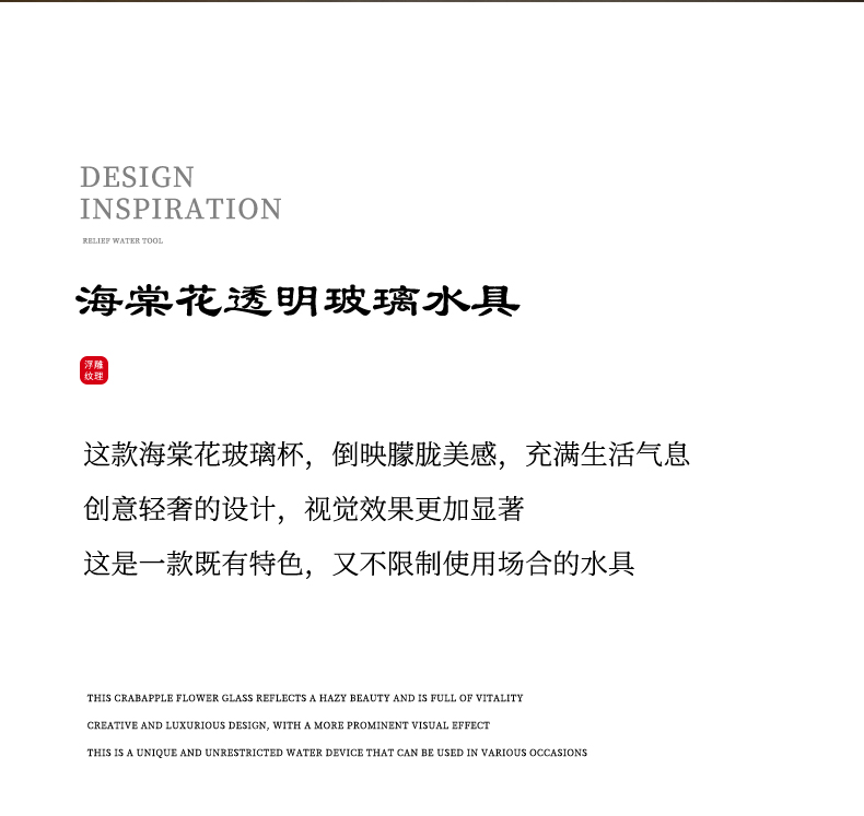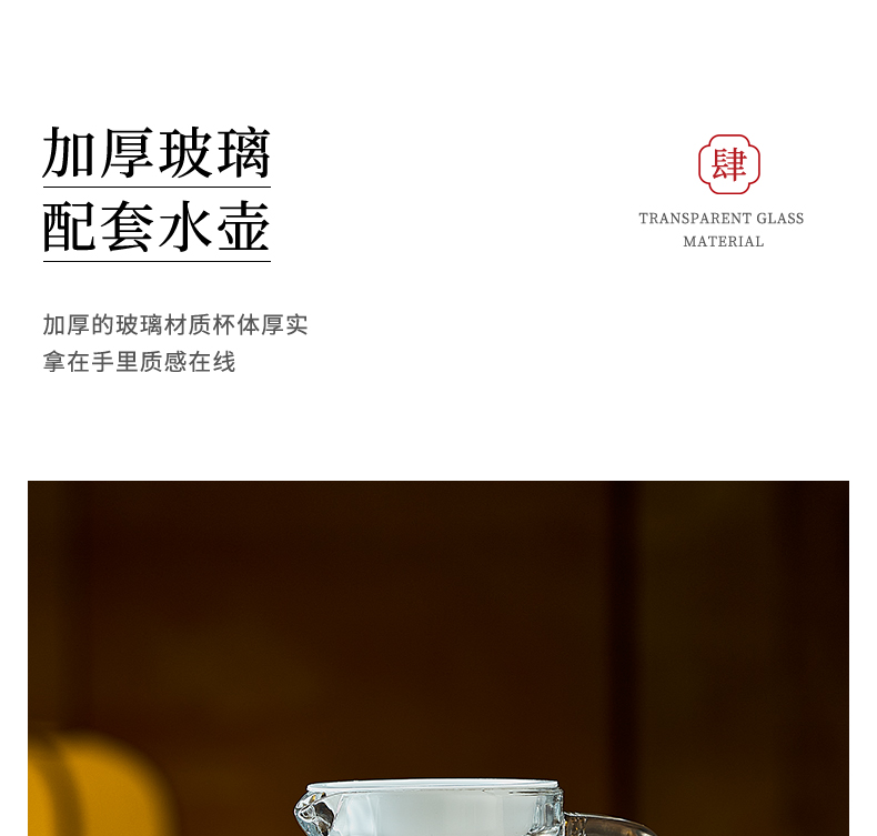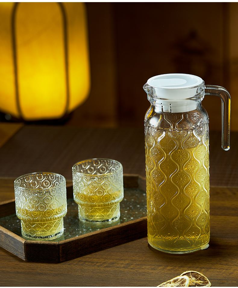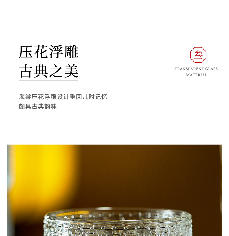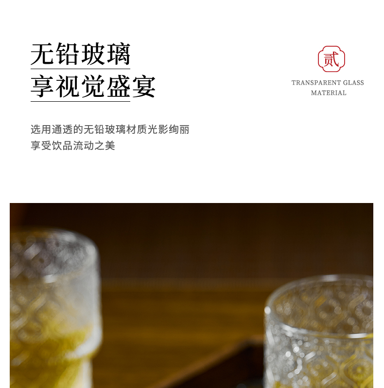 【组合】:水杯230ml*6、水壶1100ml*1 【材质】:高白料钠钙玻璃、食品级PP、食品级硅胶 【彩盒尺寸】:301*98*267mm 【外箱尺寸】:41.2*31.5*55.2cm 【毛重】:18.9KG 产品卖点:1本产品采用无铅玻璃材质,保证每一滴水都无毒无害,符合国际食品安全标准,确保消费者健康。 2、融入中国传统窗花元素,巧妙结合现代审美与传统文化,精致的纹理设计让每个细节都充满艺术感,适合作为家居装饰或礼品赠 送。 3、在同类市场中,本套装无论从材质、设计还是工艺上都具有超高性价比,满足企业客户和批发需求,是礼品行业的理想选择。