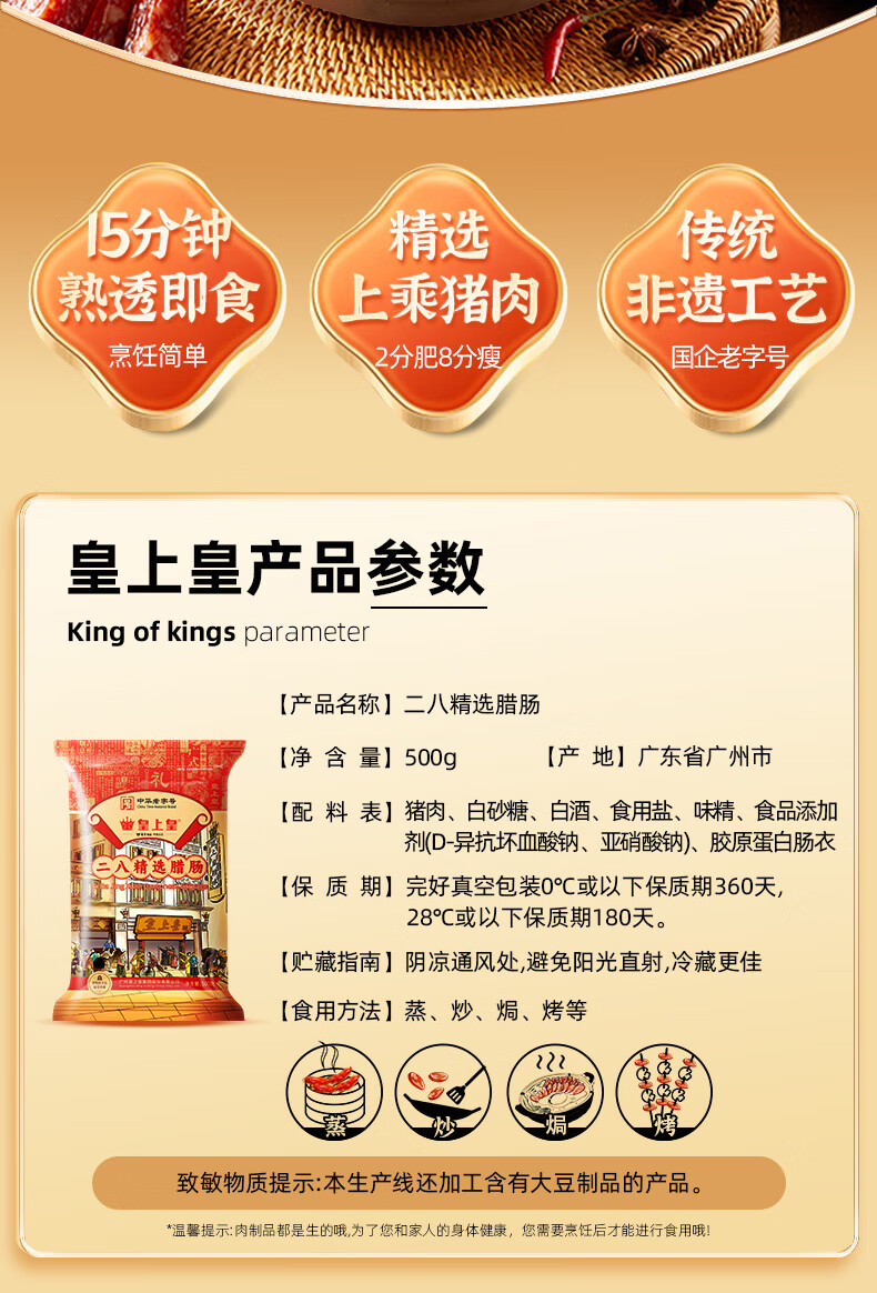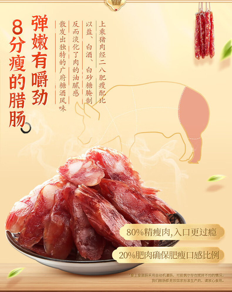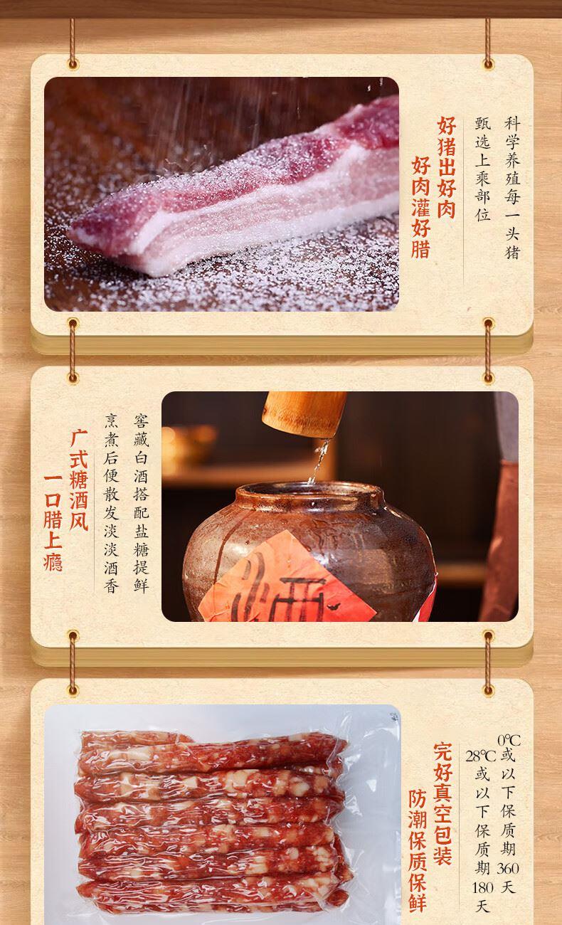 产地:广东 特产品类:广式腊肠 包装形式:袋装 食用方法:烹饪食用 加工工艺:烘干