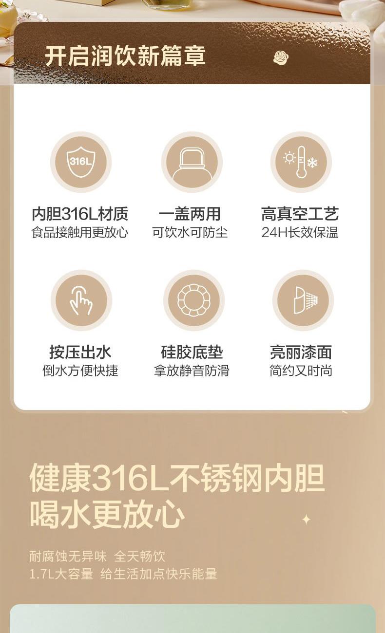 产品型号:RWS17P12Q-W 产品规格:1.7L 彩盒尺寸:143.5x143.5X280 产品净重:0.81kg 产品颜色:白色、蓝色、粉色 1、内胆316L材质,食品接触用更放心。 2、一盖两用,可饮水可防尘。 3、高真空工艺,24H长效保温。 4、按压出水,倒水方便快捷。 5、硅胶底垫拿放,静音防滑。 6、亮丽漆面,简约又时尚。