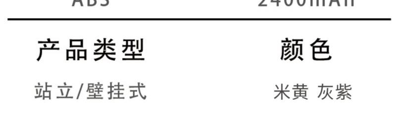 产品颜色:米黄 灰紫 产品尺寸:18.8*10.2*20.5cm 产品材质:ABS+电子元件+电池 输入电流:5V/1A 电池容量:2400mAH 功 率:5w 使用时间:1-5小时 产品重量:564g 特点: 五档运行 持久续航 挂立两用 解放双手 无刷电机 无极变速 智能数显 触摸控制