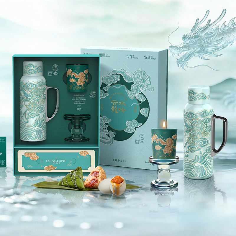 配置 · ① 陶瓷内胆焖壶×1把(820ml) (SUS-316内胆丨304外壳丨内胆/杯盖内壁喷瓷) ② 香氛蜡烛杯×1只(约170g-乌木沉香) ③ 玻璃烛台架×1个 ④ 发芽糙米粽×2只(100g/只) ⑤ 超大海鸭蛋×2只(80g/只) ⑥ 端午礼卡×1份 ⑦ 云水龙吟礼盒×1套(含袋) 尺寸 · 380×275×95mm