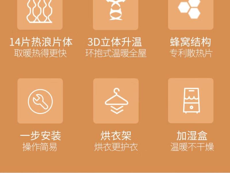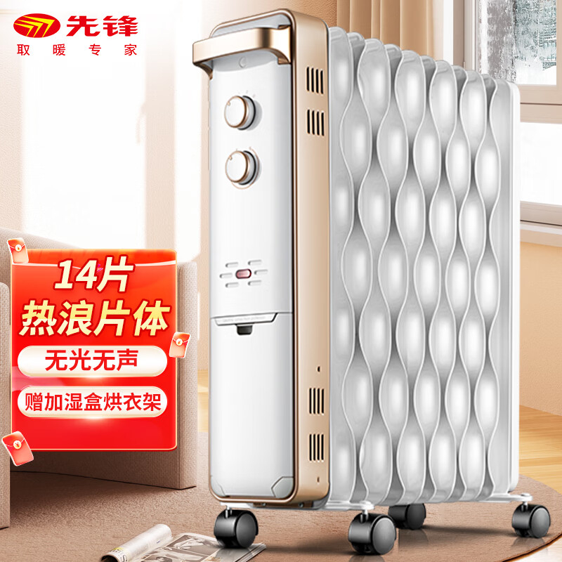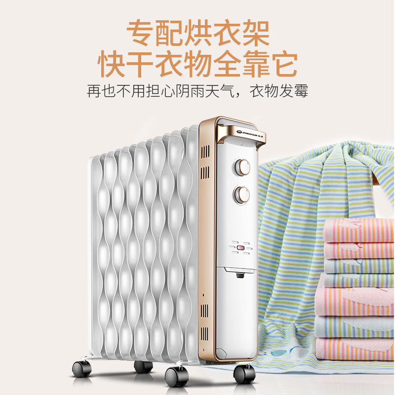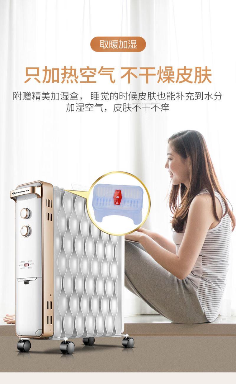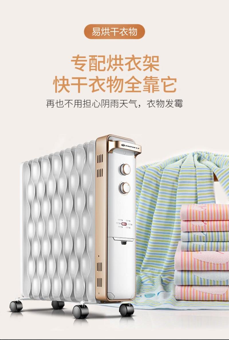 采暖面积:22-28 平方米。 额定电压:220V/50Hz。 产品重量:14.32kg 产品特点 散热片数量:14 片,散热面积大,能够快速提升室内温度,使室内温暖舒适。 晾衣架功能:支持晾衣架功能,可在取暖的同时烘干小件物品,如毛巾、袜子等,方便实用。 加湿盒:配备加湿盒,在干燥的冬季取暖时,可以有效增加室内空气湿度 采用热浪型设计,热效高,升温迅速,能够快速为用户营造温暖的环境