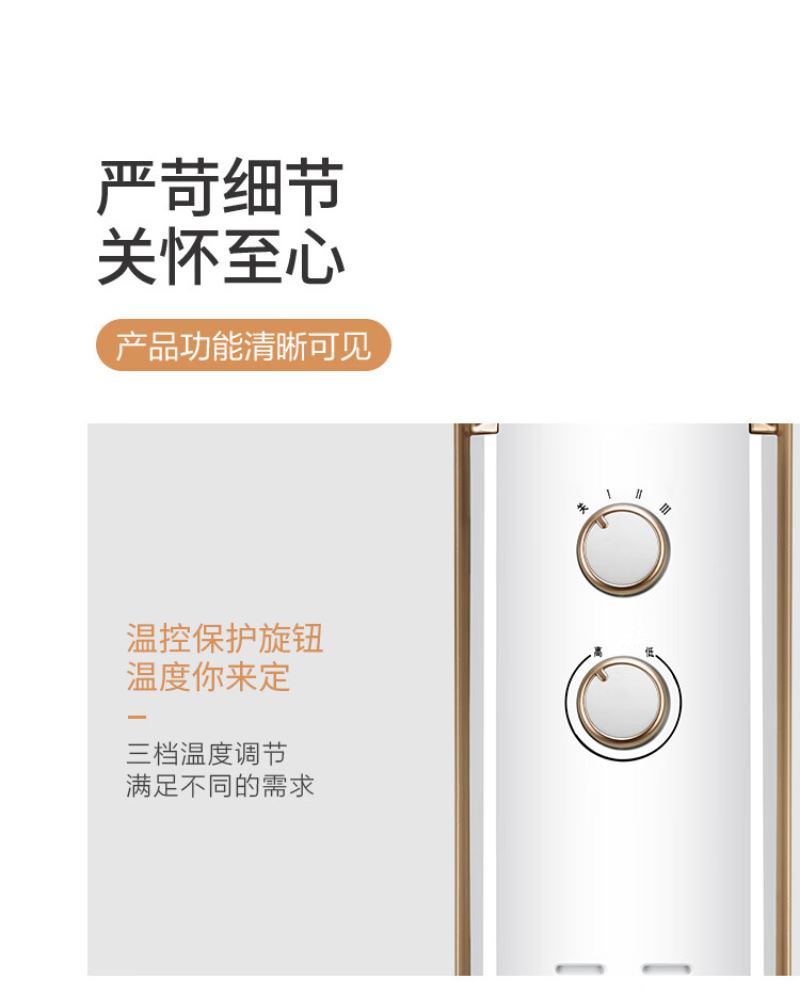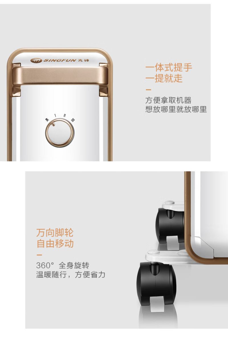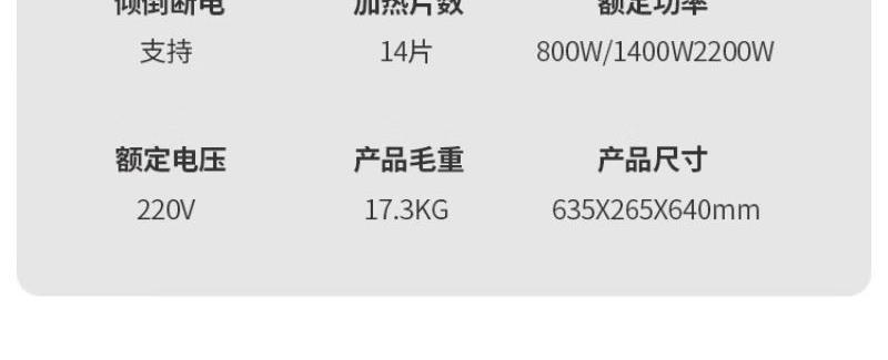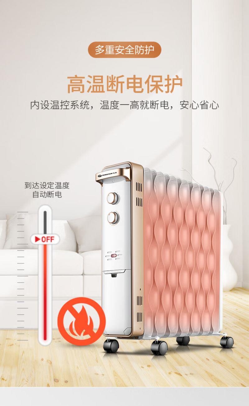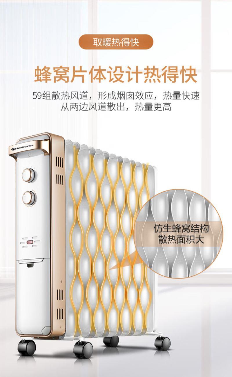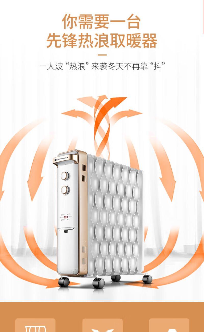 采暖面积:22-28 平方米。 额定电压:220V/50Hz。 产品重量:14.32kg 产品特点 散热片数量:14 片,散热面积大,能够快速提升室内温度,使室内温暖舒适。 晾衣架功能:支持晾衣架功能,可在取暖的同时烘干小件物品,如毛巾、袜子等,方便实用。 加湿盒:配备加湿盒,在干燥的冬季取暖时,可以有效增加室内空气湿度 采用热浪型设计,热效高,升温迅速,能够快速为用户营造温暖的环境