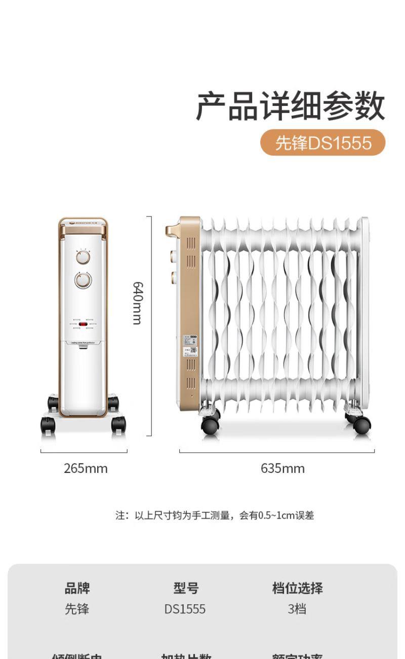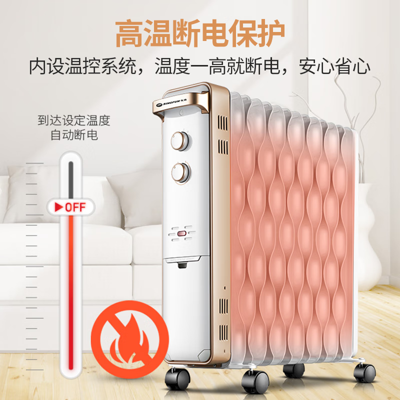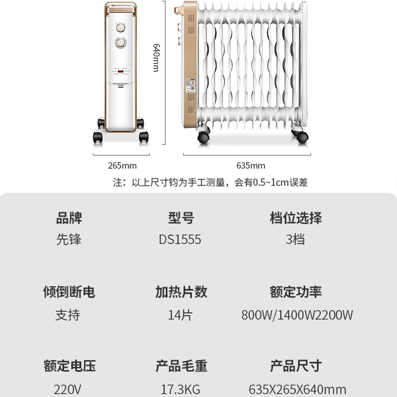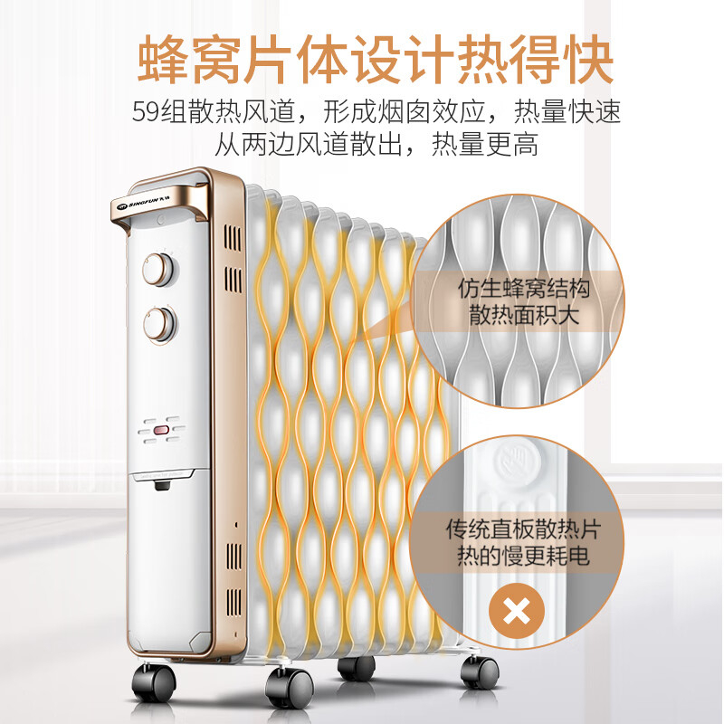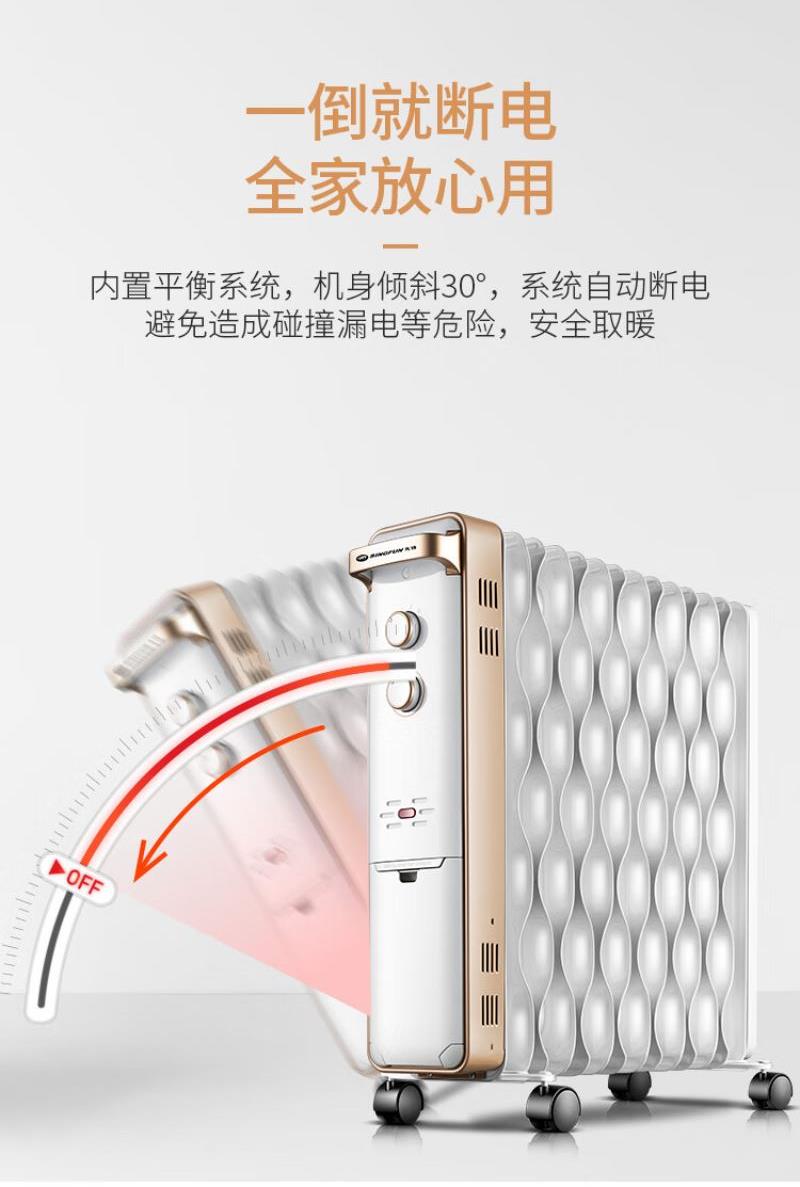 采暖面积:22-28 平方米。 额定电压:220V/50Hz。 产品重量:14.32kg 产品特点 散热片数量:14 片,散热面积大,能够快速提升室内温度,使室内温暖舒适。 晾衣架功能:支持晾衣架功能,可在取暖的同时烘干小件物品,如毛巾、袜子等,方便实用。 加湿盒:配备加湿盒,在干燥的冬季取暖时,可以有效增加室内空气湿度 采用热浪型设计,热效高,升温迅速,能够快速为用户营造温暖的环境