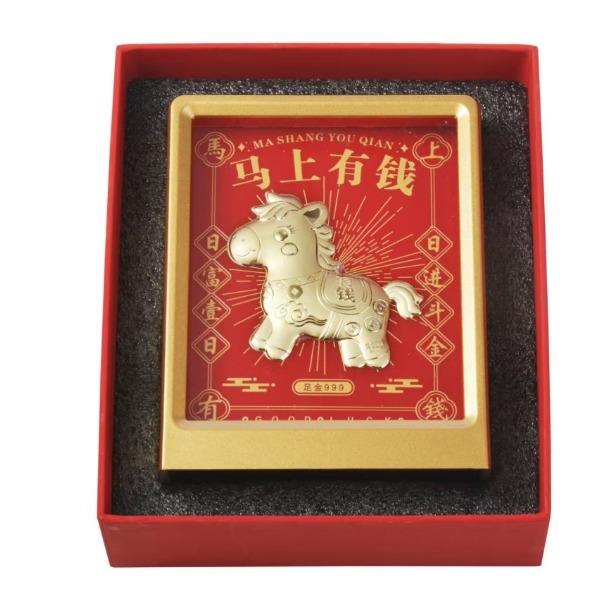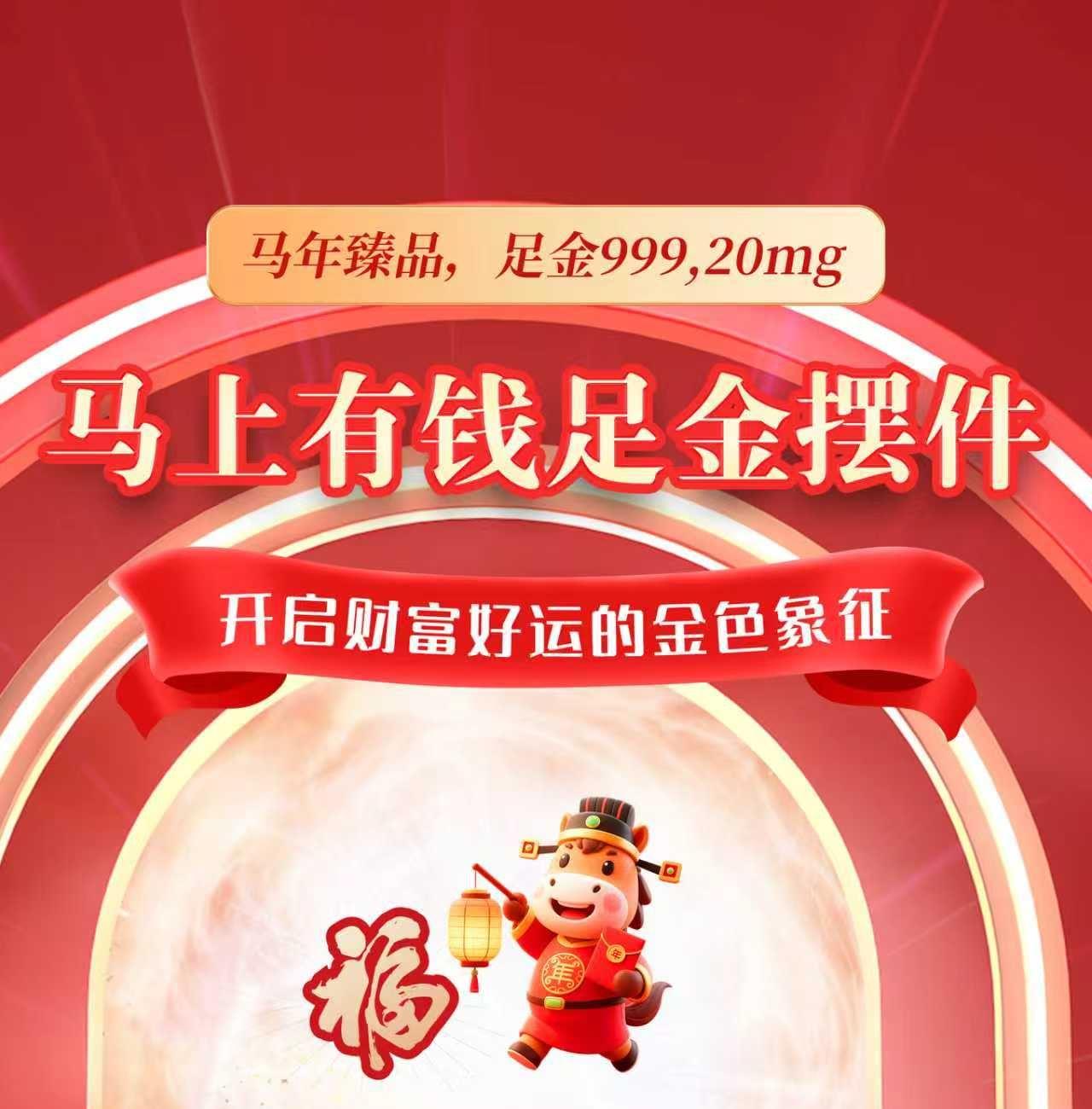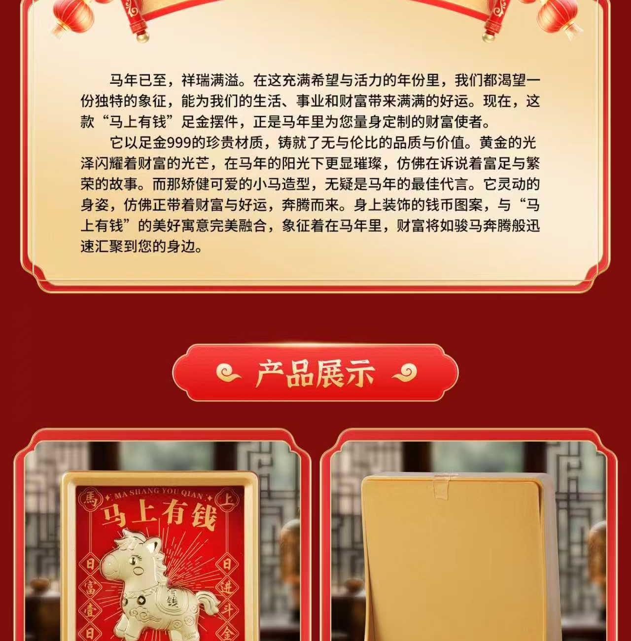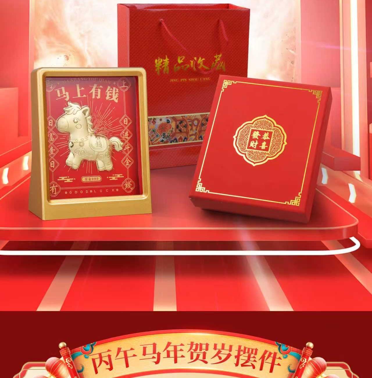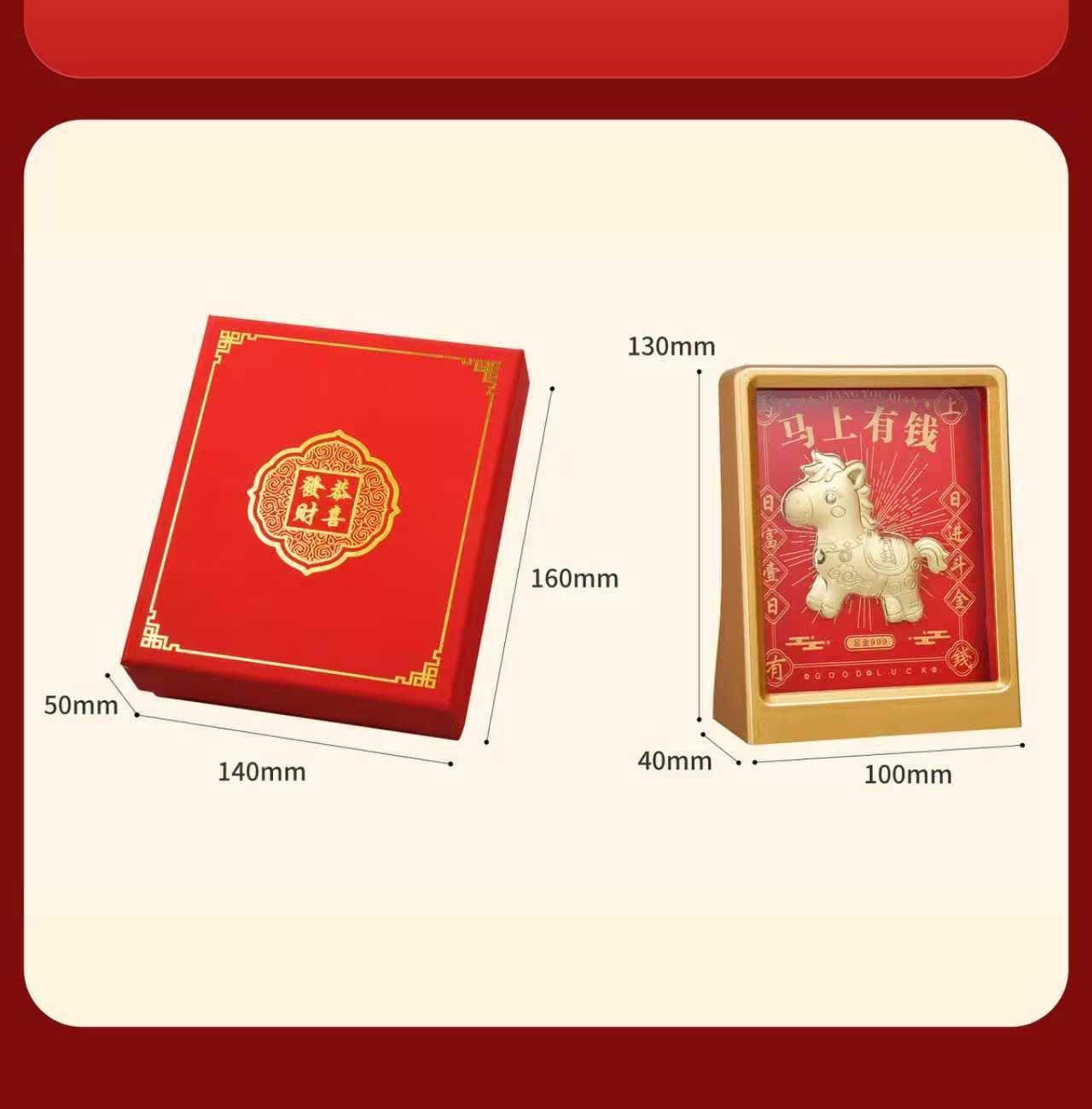 产品配置:礼盒手提+摆件+证书 产品材质:含金 产品尺寸:100x130x40mm 包装盒尺寸:140x160x50mm 马年已至,祥瑞满溢。在这充满希望与活力的年份里,我们都渴望一份独特的象征,能为我们的生活、事业和财富带来满满的好运。 现在,这款“马上有钱”足金摆件,正是马年里为您量身定制的财富使者。
