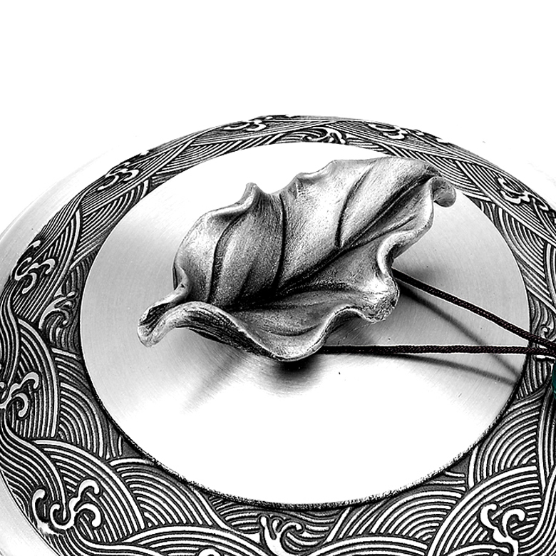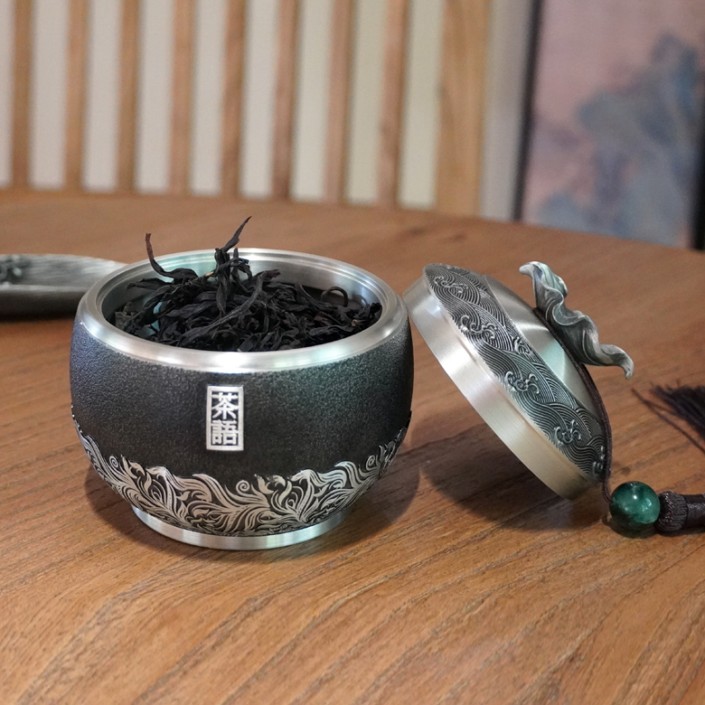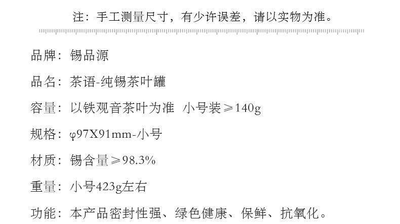 产 品:茶语-纯锡茶叶罐 规 格:φ97*91mm-小号 容 量: 小号装约140g (铁观音) 重 量: 423g 左右-小号 ✅纯锡锁香:锡含量≥98.3% 高纯锡材质,防潮密封储茶,持久锁住茶叶鲜醇,越存越香。 ✅国风美学:罐身高浮雕茶叶叶片组合设计图案,罐盖外圈水纹环绕,树叶提手+流苏玉珠,还原东方雅致意境,兼具实用与观赏价值。 ✅ 匠心工艺:磨砂哑光罐身搭配亮银浮雕,触感温润,细节考究,彰显品质感。 ✅专属定制:支持罐身罐盖罐底刻字 / 印章定制,打造不一样的茶器,礼赠自藏皆相宜。 ✅实用耐用:密封结构严密,不易氧化变形,可长久陪伴茶事,成为岁月里的存茶伙伴。