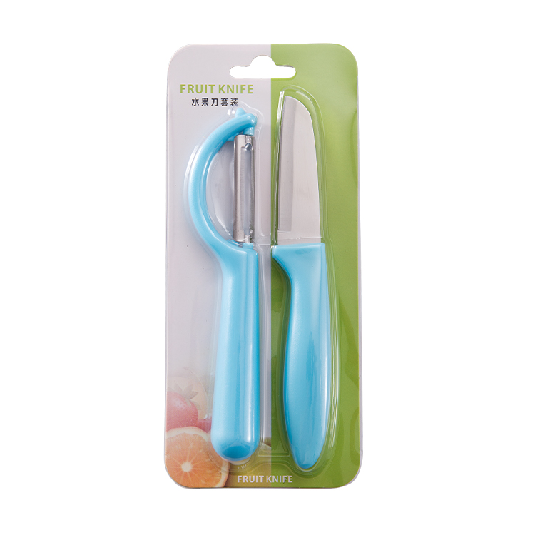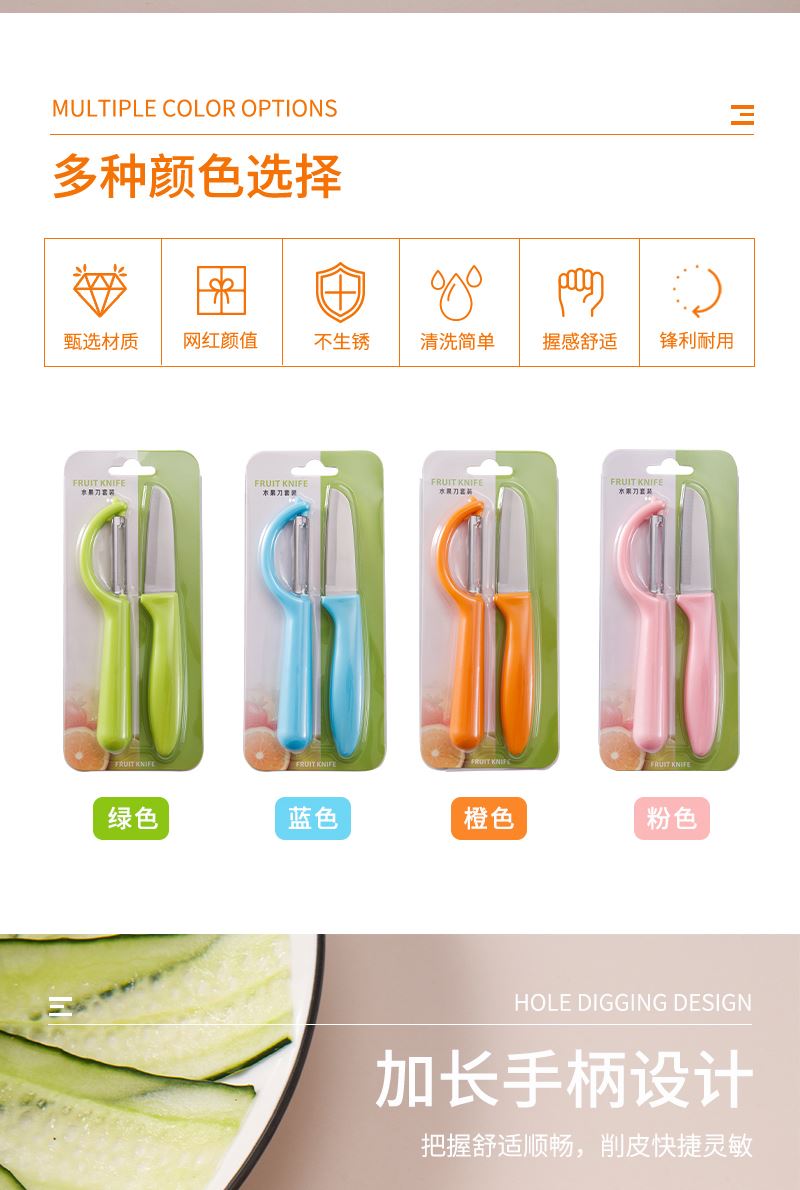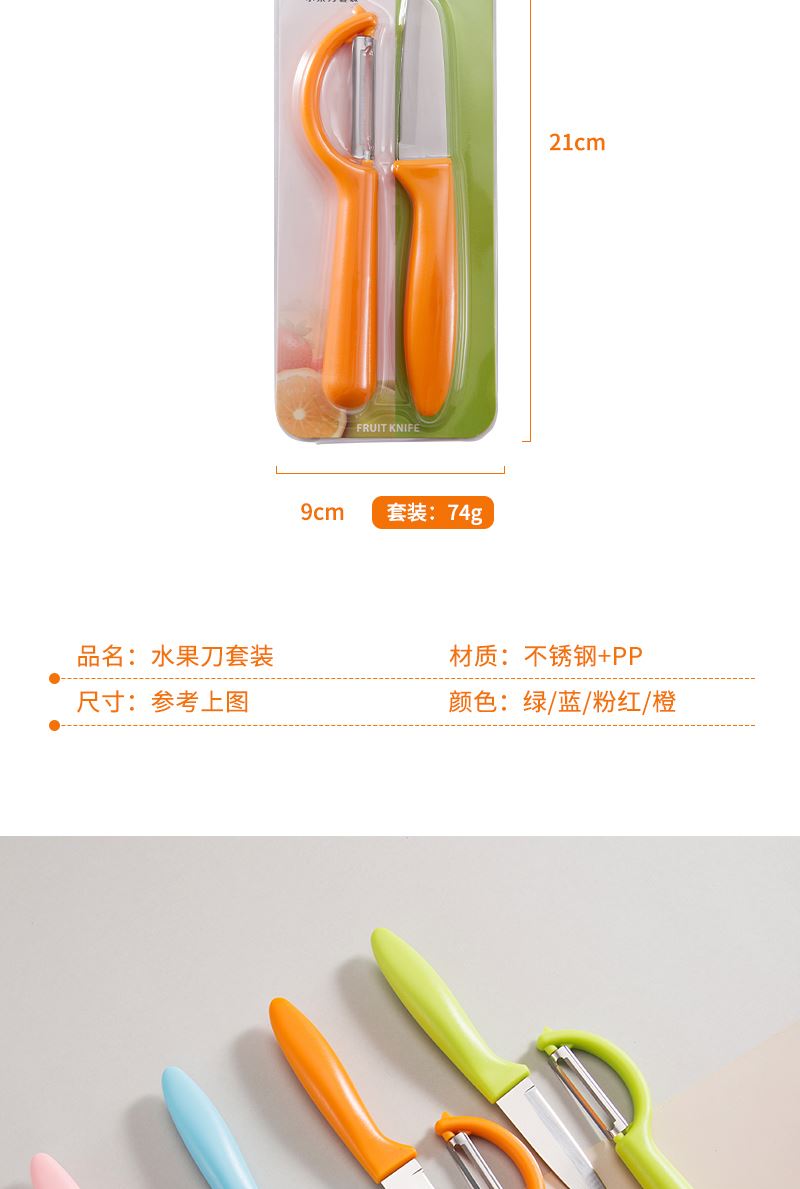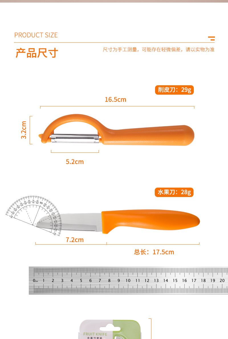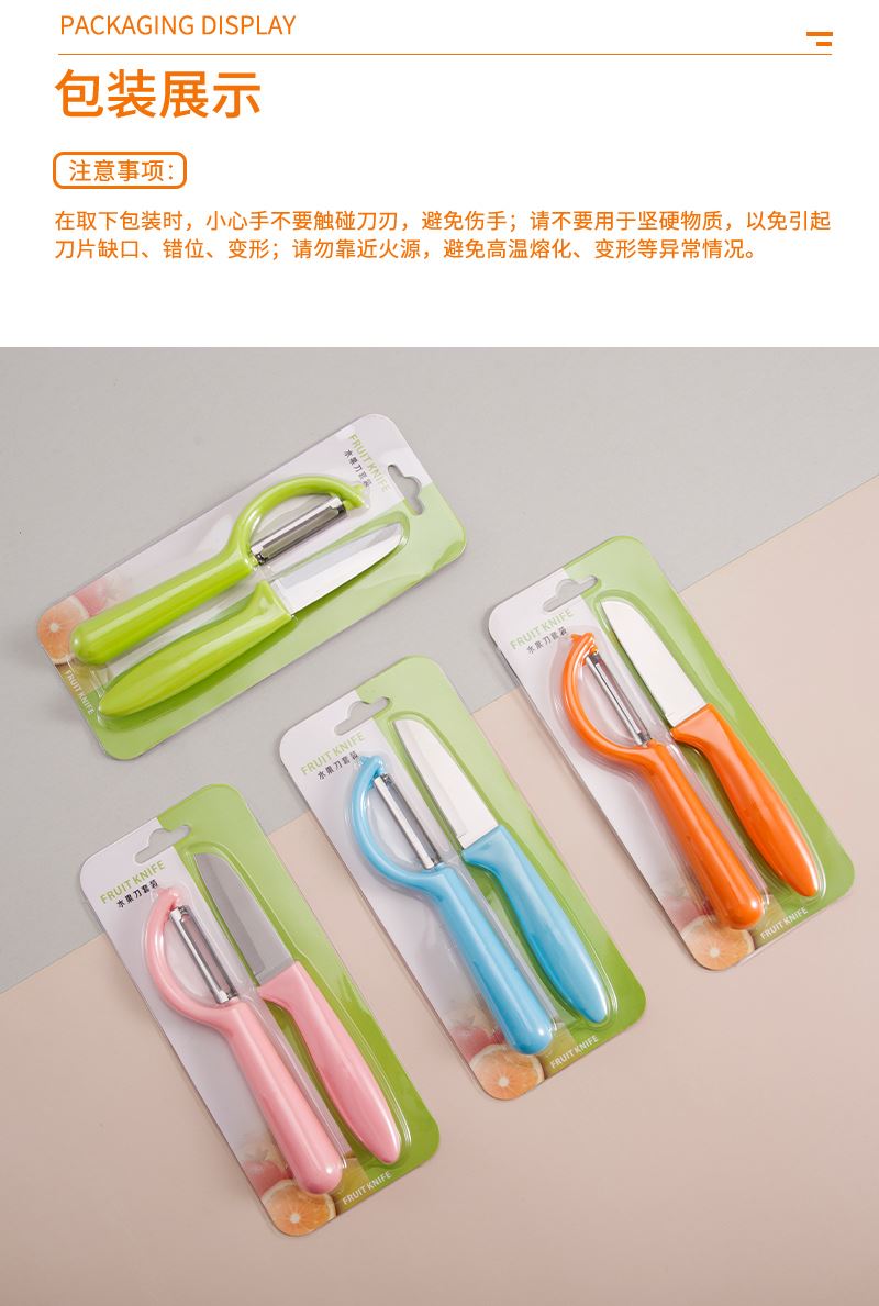 产品组合:水果刀 瓜刨 产品规格: 水果刀:17.5 削皮器:16.5*3.2m 材 质:PP 陶瓷 包 装:吸卡 重量/套: 72g