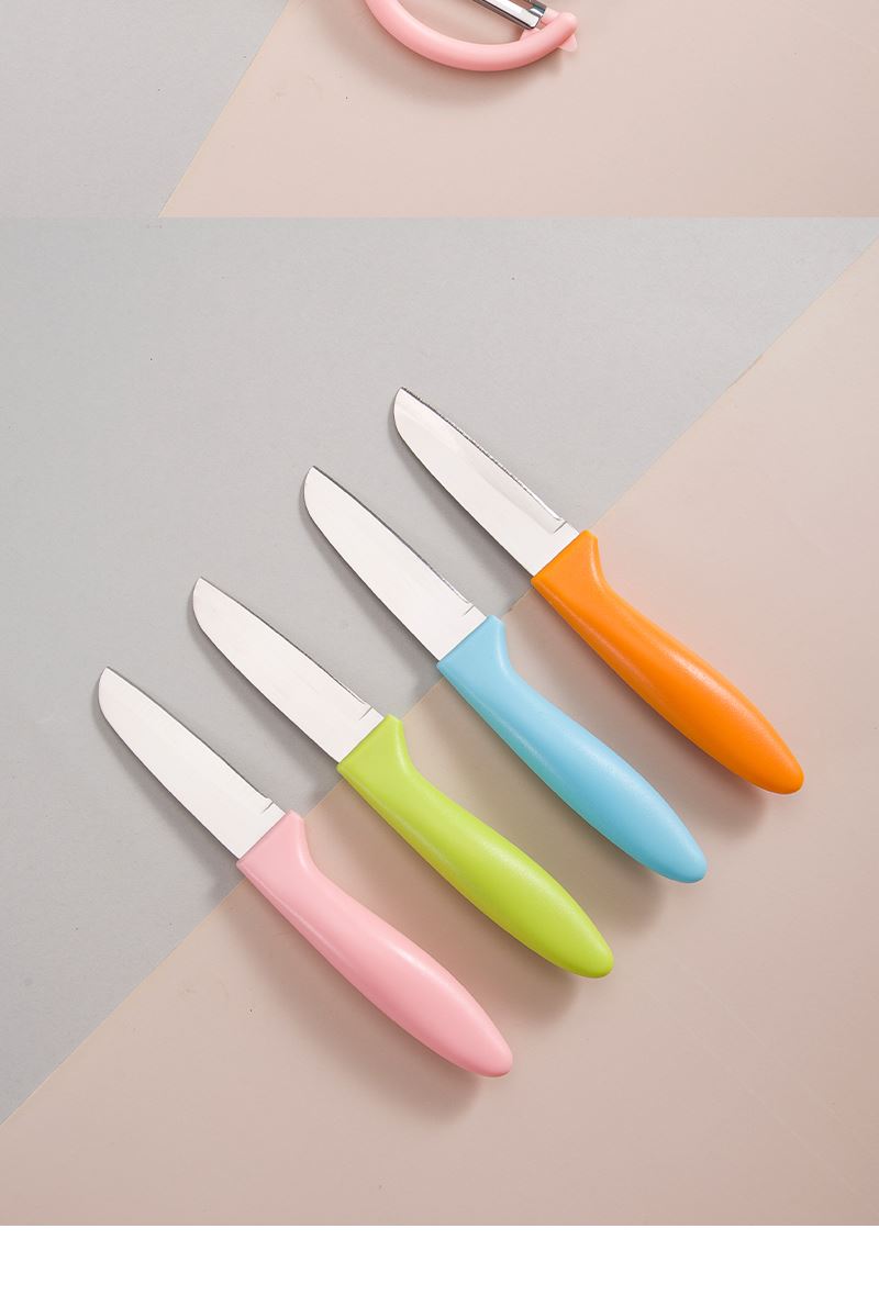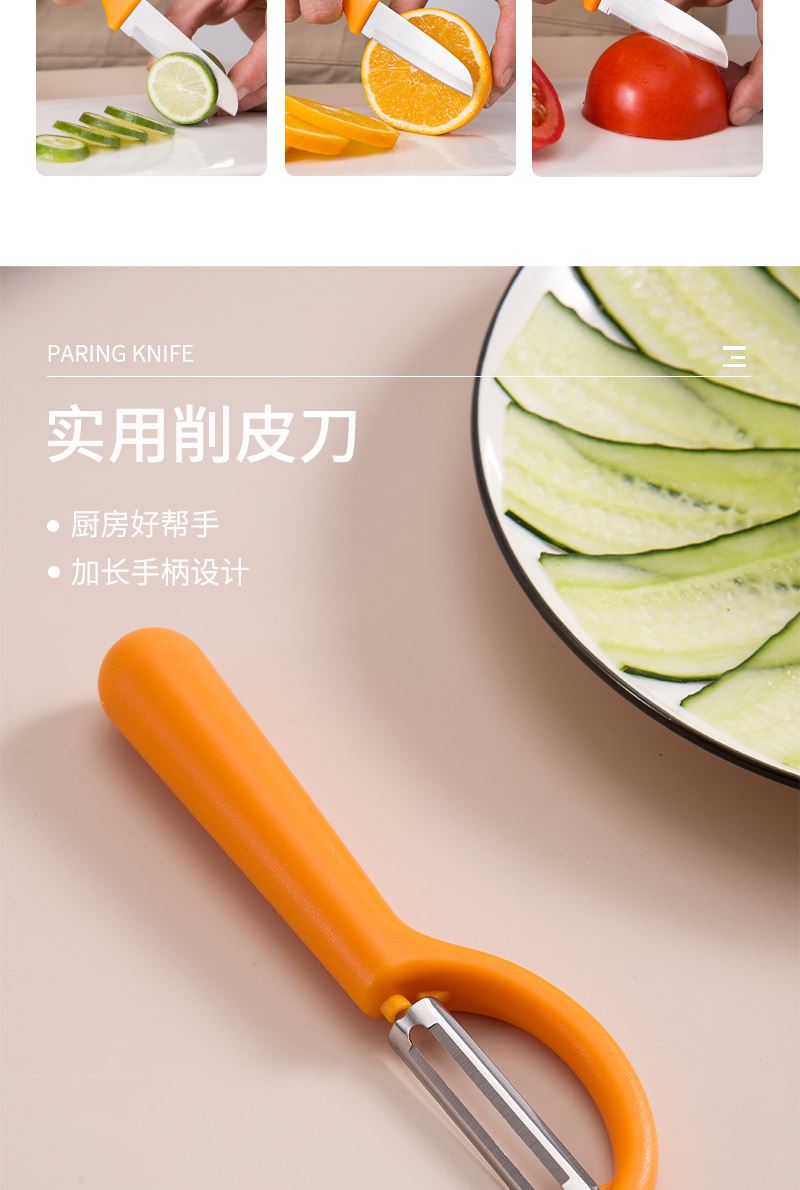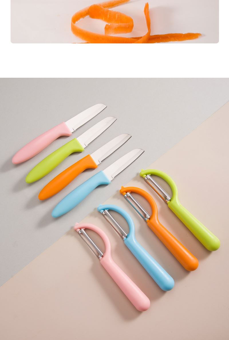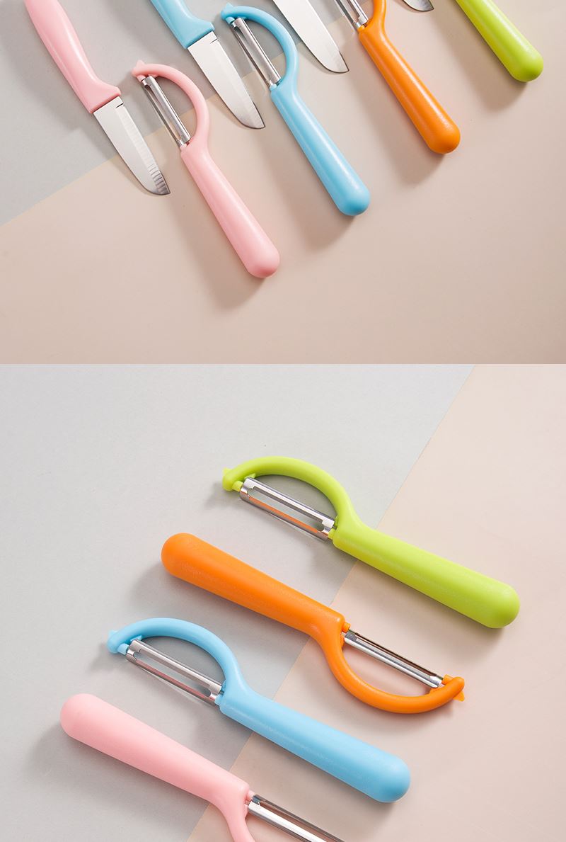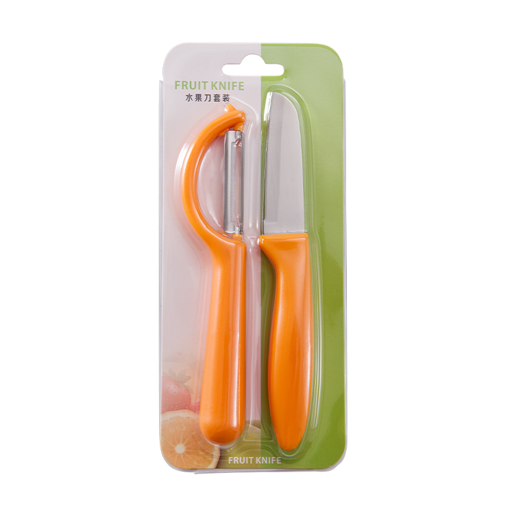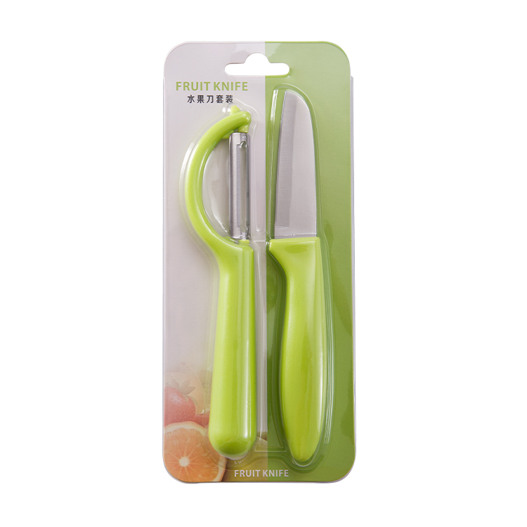 产品组合:水果刀 瓜刨 产品规格: 水果刀:17.5 削皮器:16.5*3.2m 材 质:PP 陶瓷 包 装:吸卡 重量/套: 72g