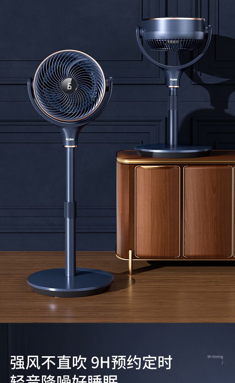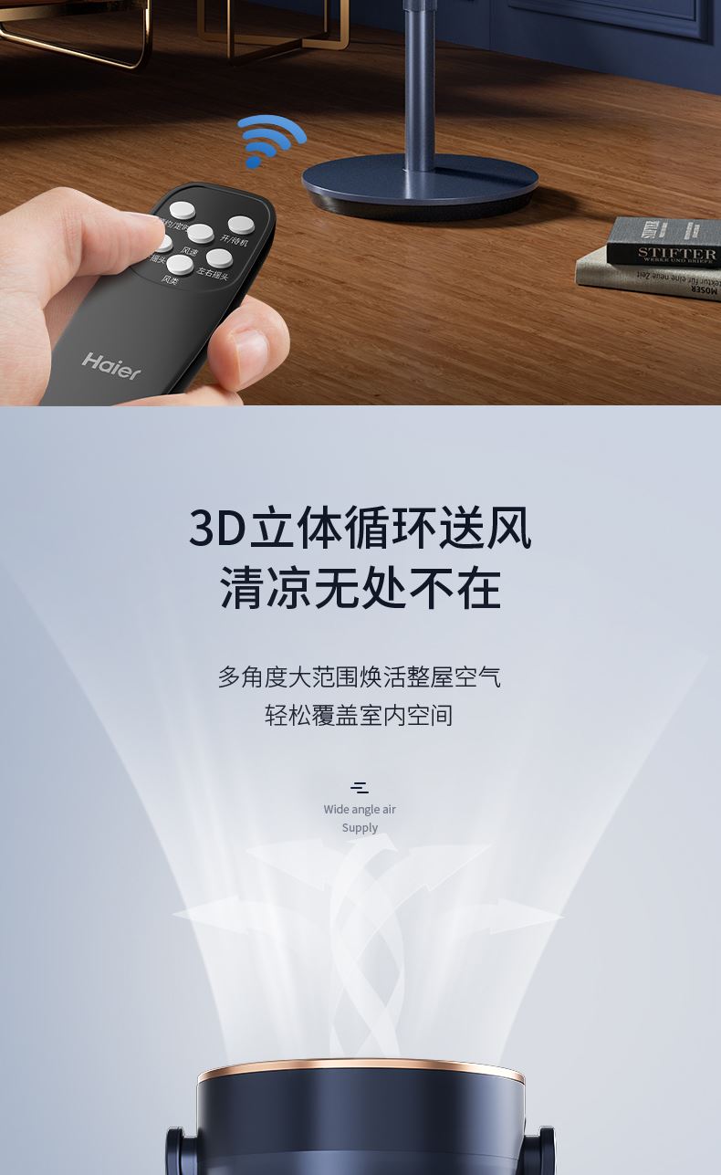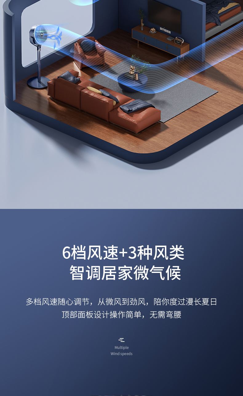 台地两用设计,适配多场景摆放 3D 立体摇头,全屋空气快速循环 6 档风速 + 3 种风类,风感舒适柔和 遥控 + 9 小时定时,操作便捷省心 轻音低噪运行,节能省电更安全