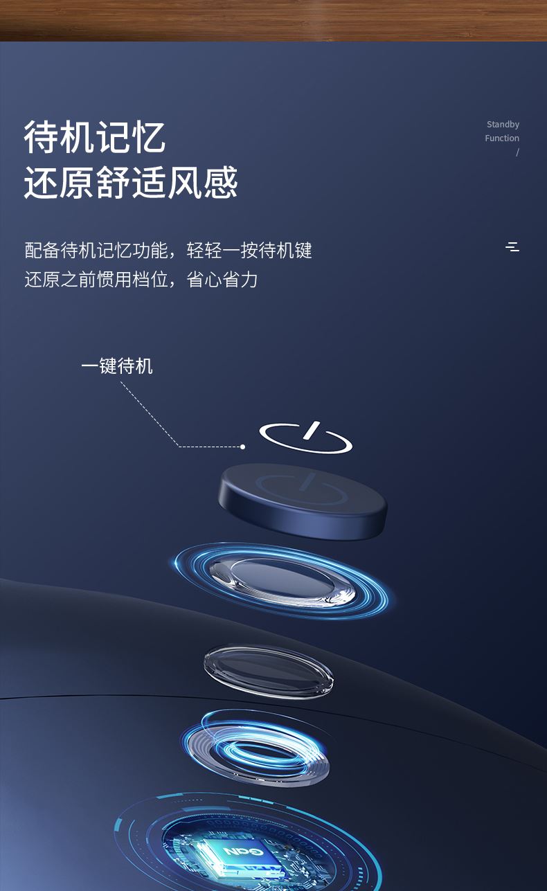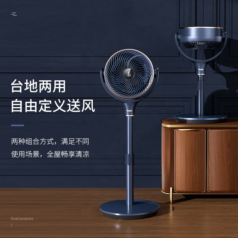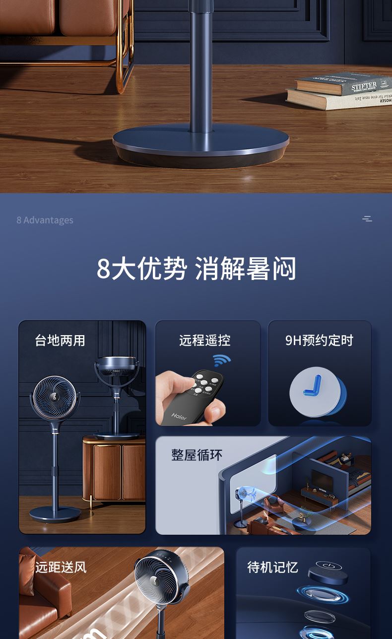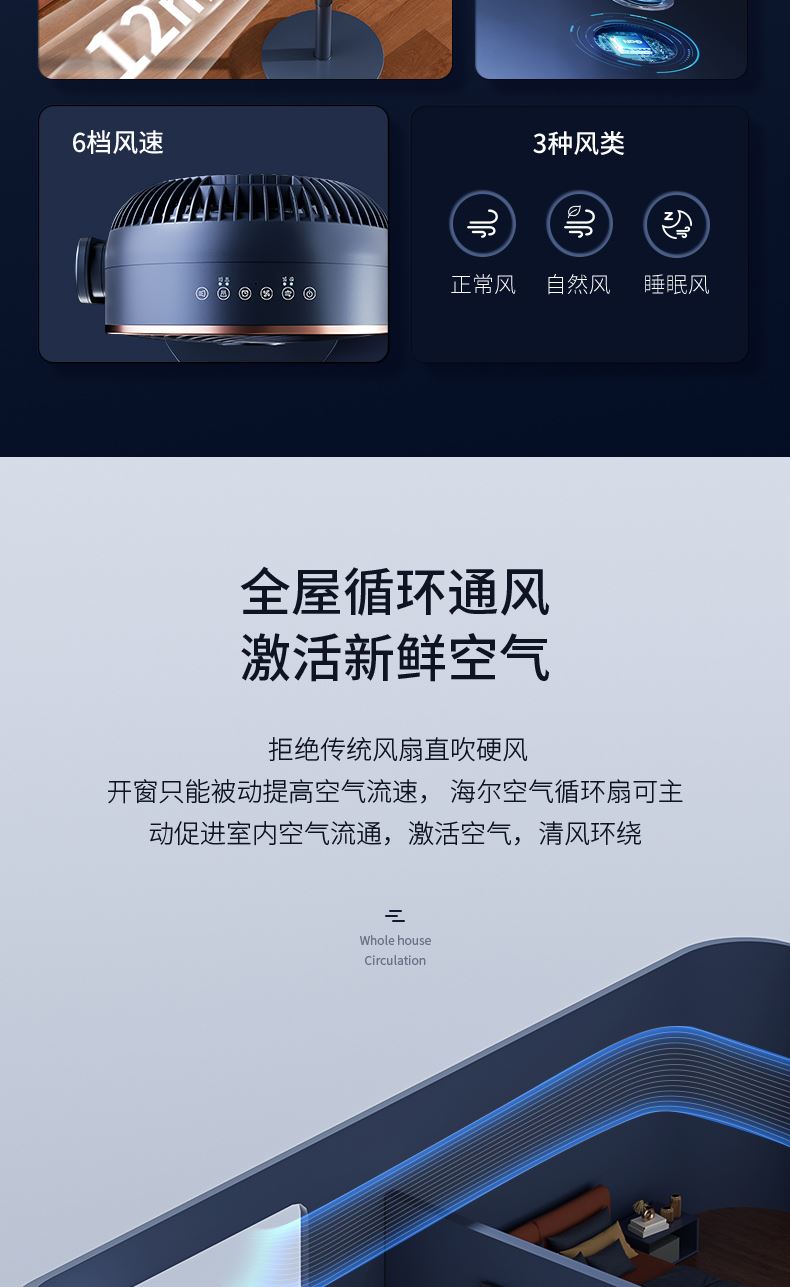 台地两用设计,适配多场景摆放 3D 立体摇头,全屋空气快速循环 6 档风速 + 3 种风类,风感舒适柔和 遥控 + 9 小时定时,操作便捷省心 轻音低噪运行,节能省电更安全