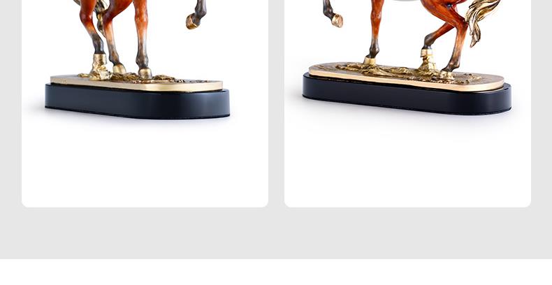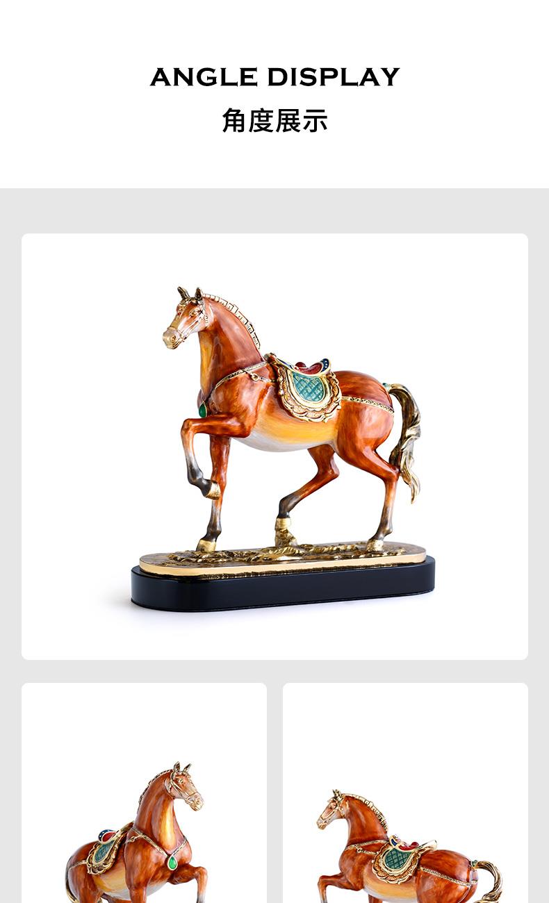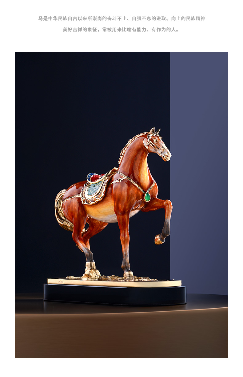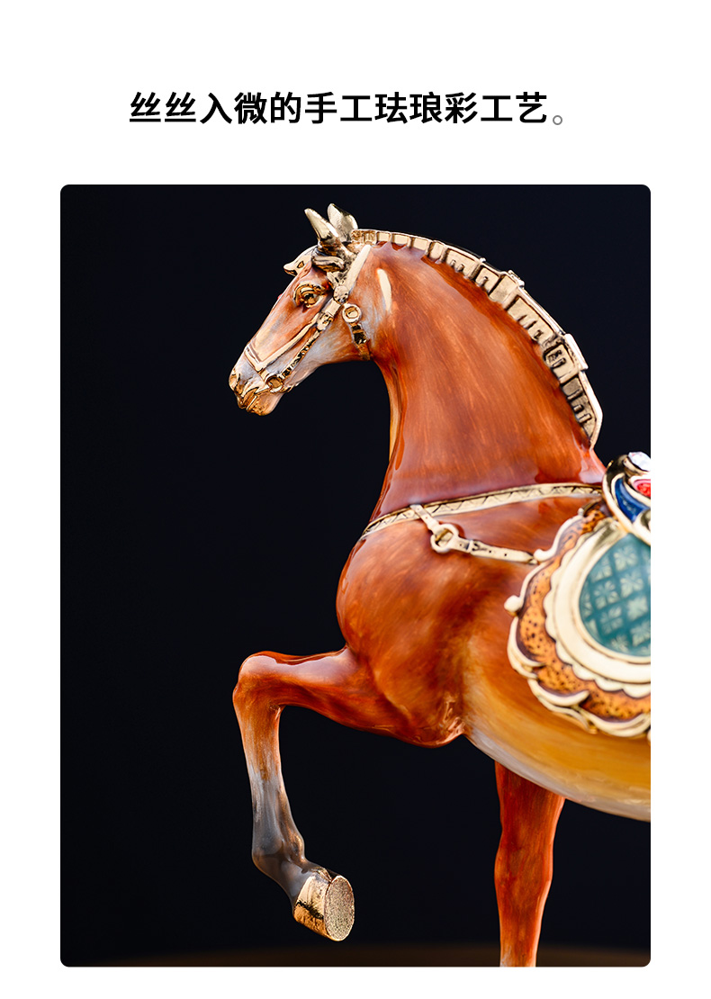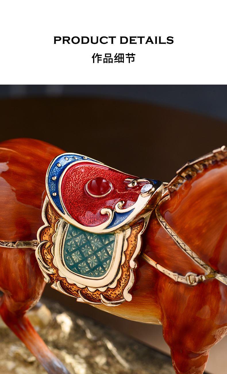 规格:21x8x20cm 包装:26x26x11cm 作品灵感源自盛唐时期的富贵马,马的身姿矫健 可日行千里 寓意身康体健 事业步步高升 财运飞黄腾达等。骏马底座为双层设计 上层为镀金合金板,辅以一层巧艺匠心的金色装饰物。下层为黑色大理石 大理石揉汇白色纹理 精致大气