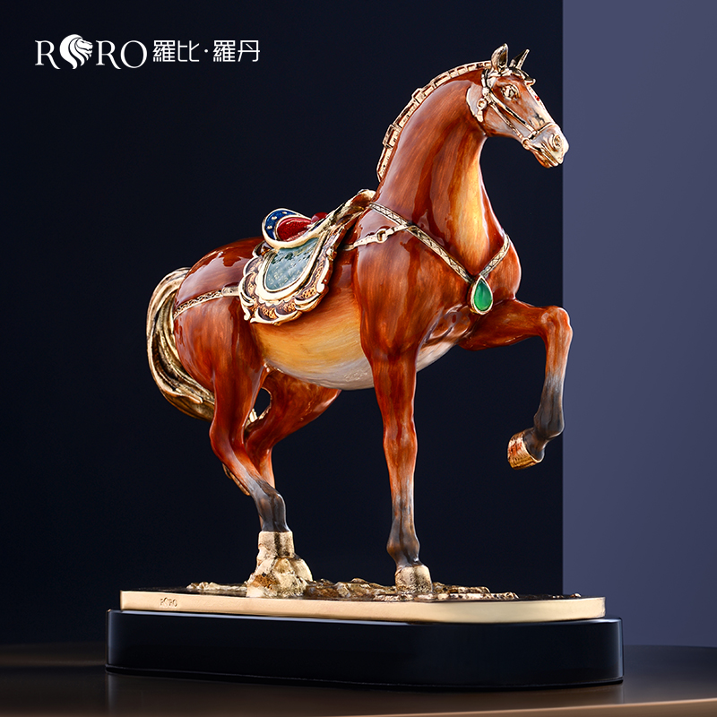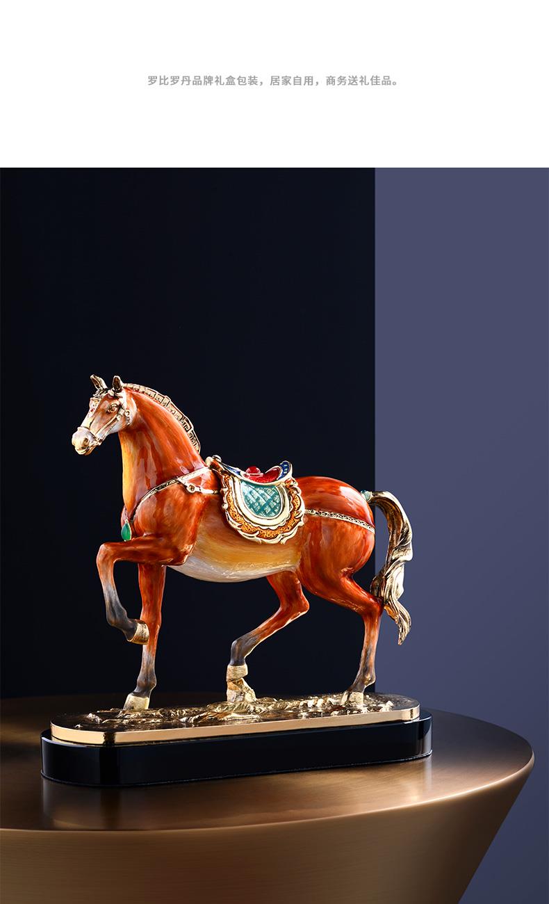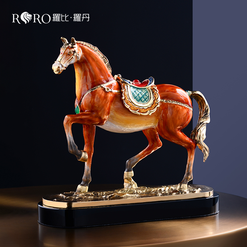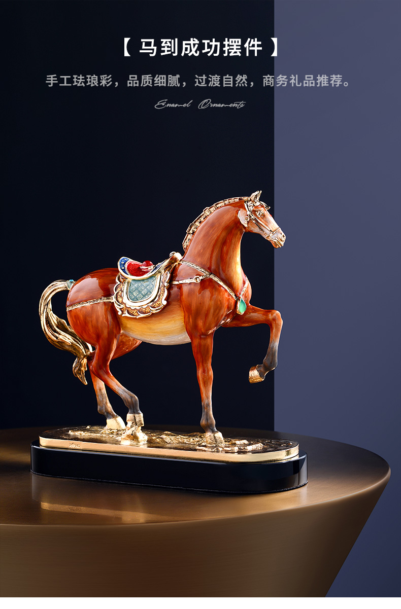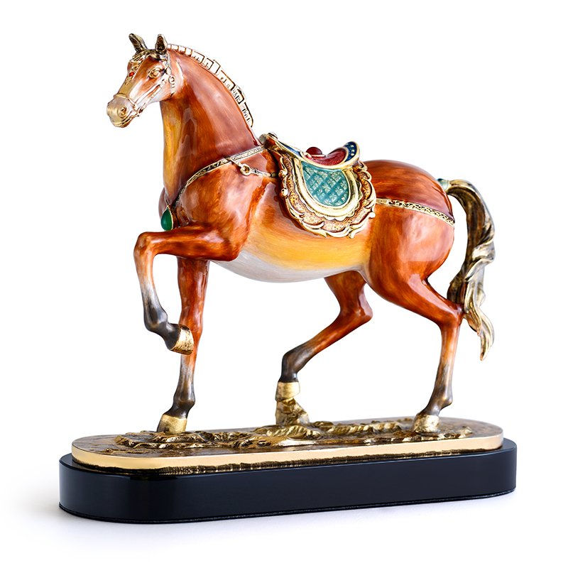 规格:21x8x20cm 包装:26x26x11cm 作品灵感源自盛唐时期的富贵马,马的身姿矫健 可日行千里 寓意身康体健 事业步步高升 财运飞黄腾达等。骏马底座为双层设计 上层为镀金合金板,辅以一层巧艺匠心的金色装饰物。下层为黑色大理石 大理石揉汇白色纹理 精致大气