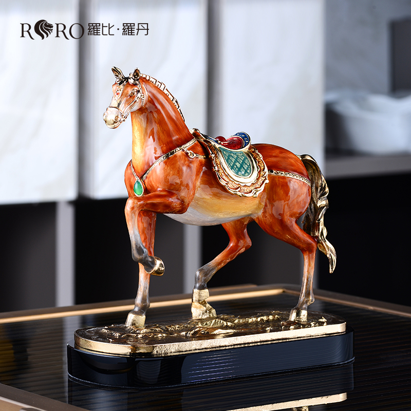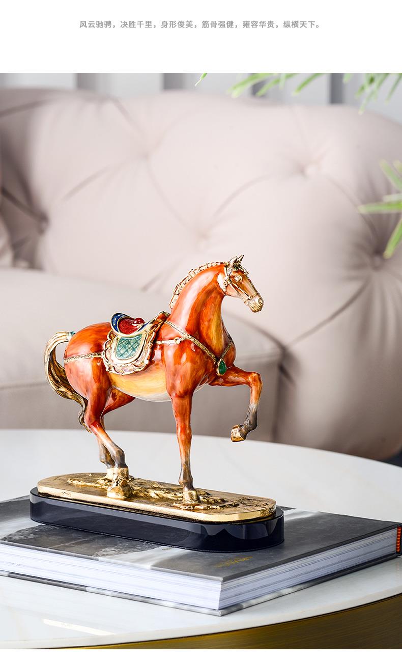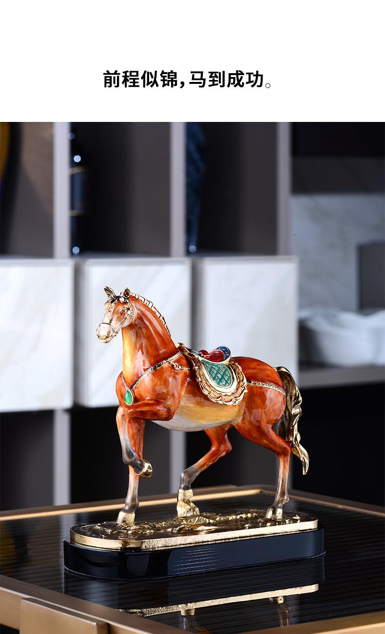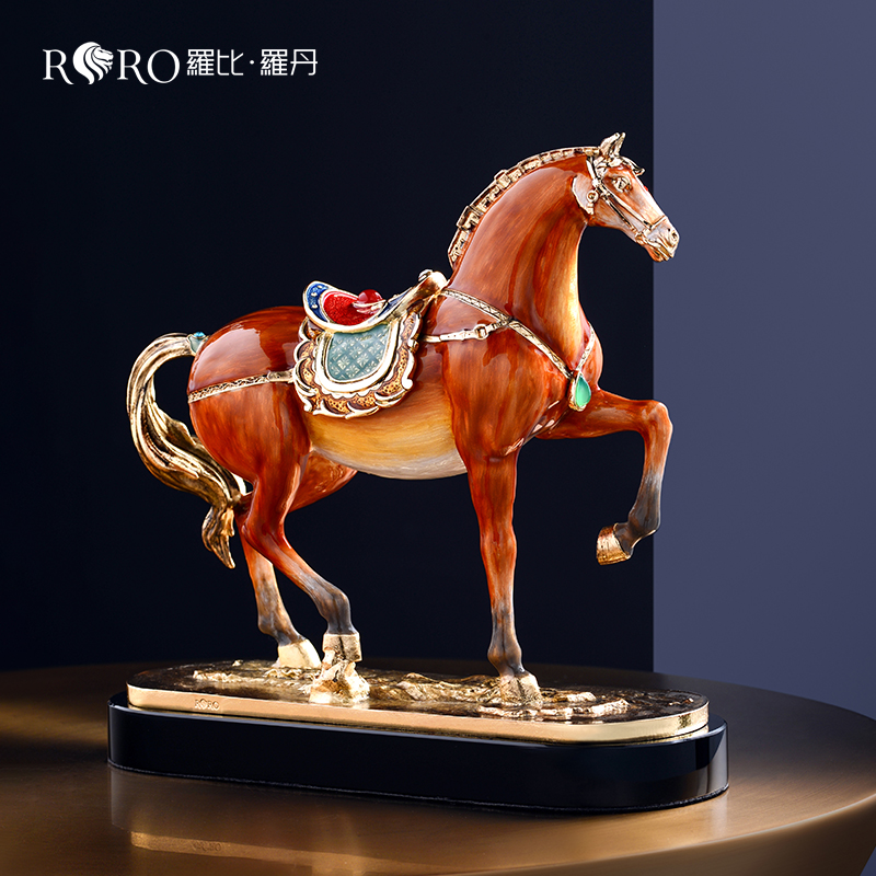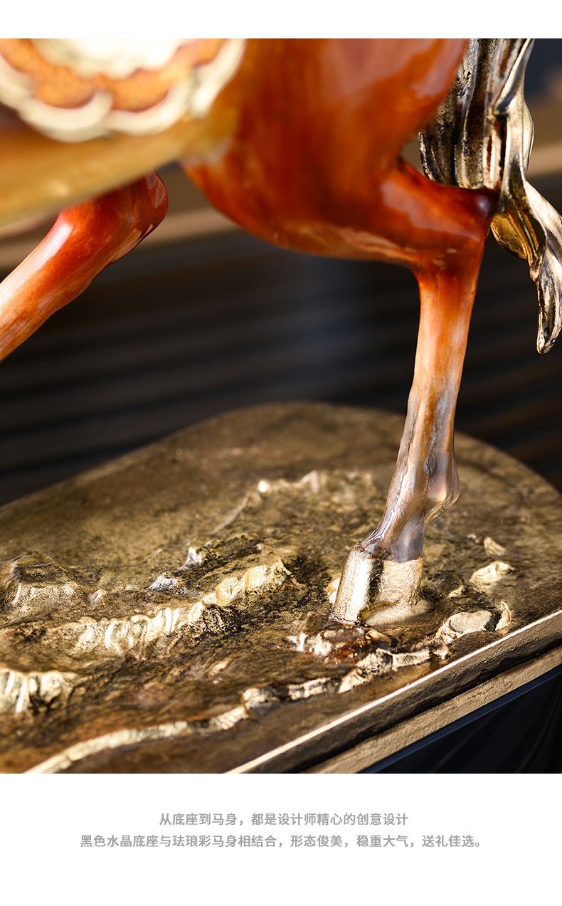 规格:21x8x20cm 包装:26x26x11cm 作品灵感源自盛唐时期的富贵马,马的身姿矫健 可日行千里 寓意身康体健 事业步步高升 财运飞黄腾达等。骏马底座为双层设计 上层为镀金合金板,辅以一层巧艺匠心的金色装饰物。下层为黑色大理石 大理石揉汇白色纹理 精致大气