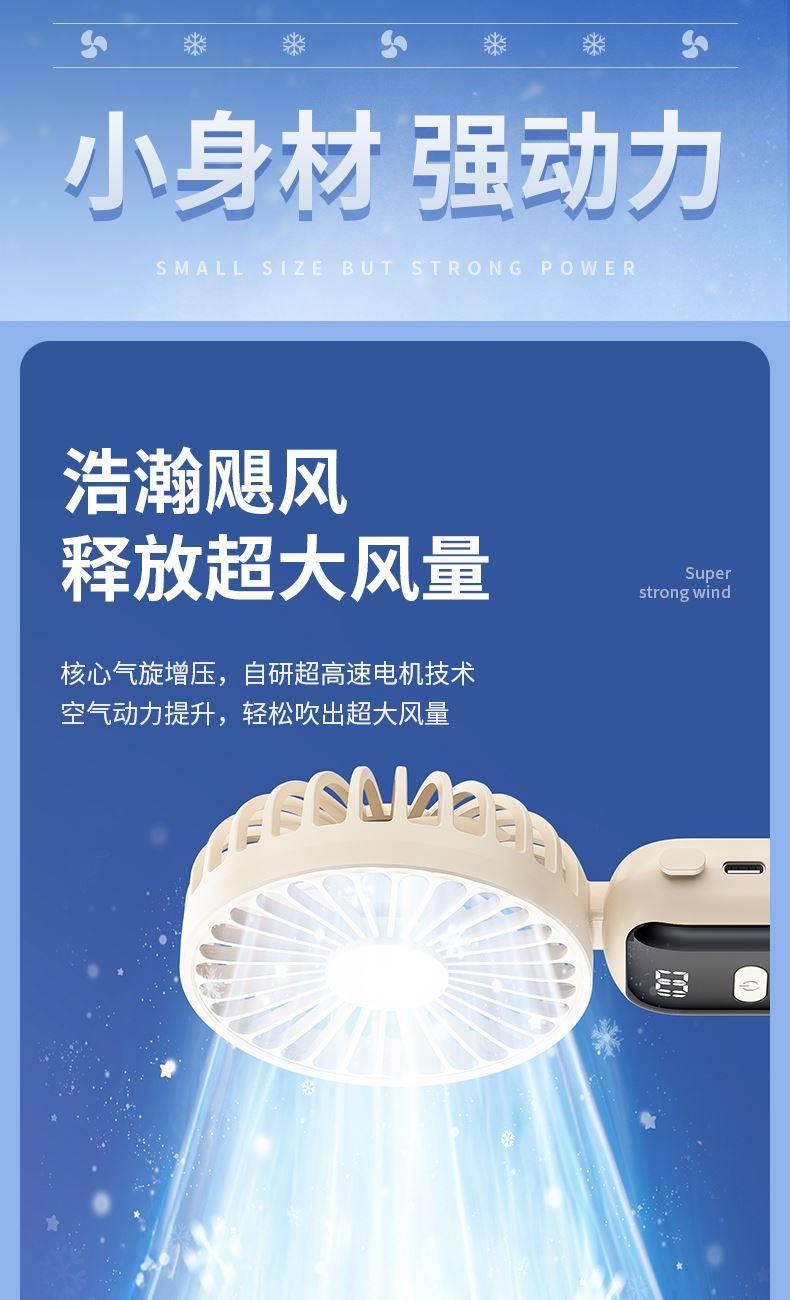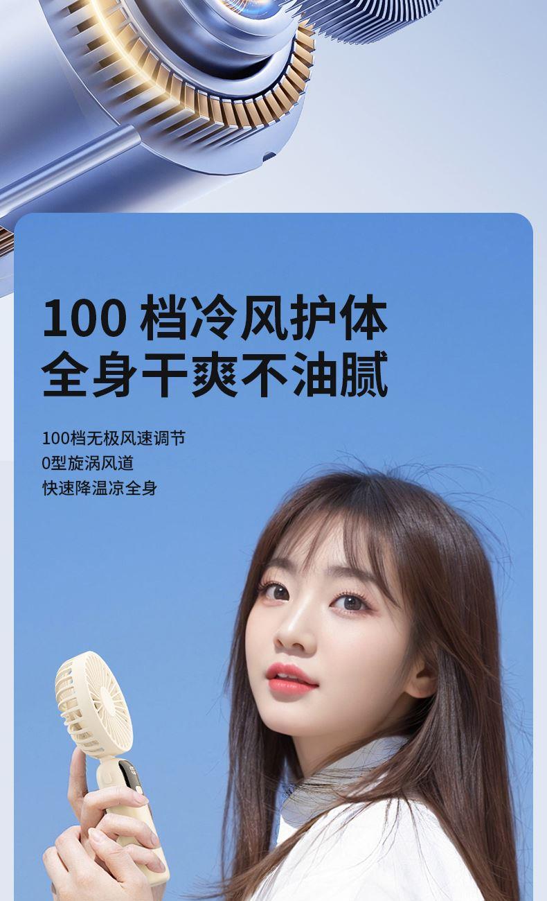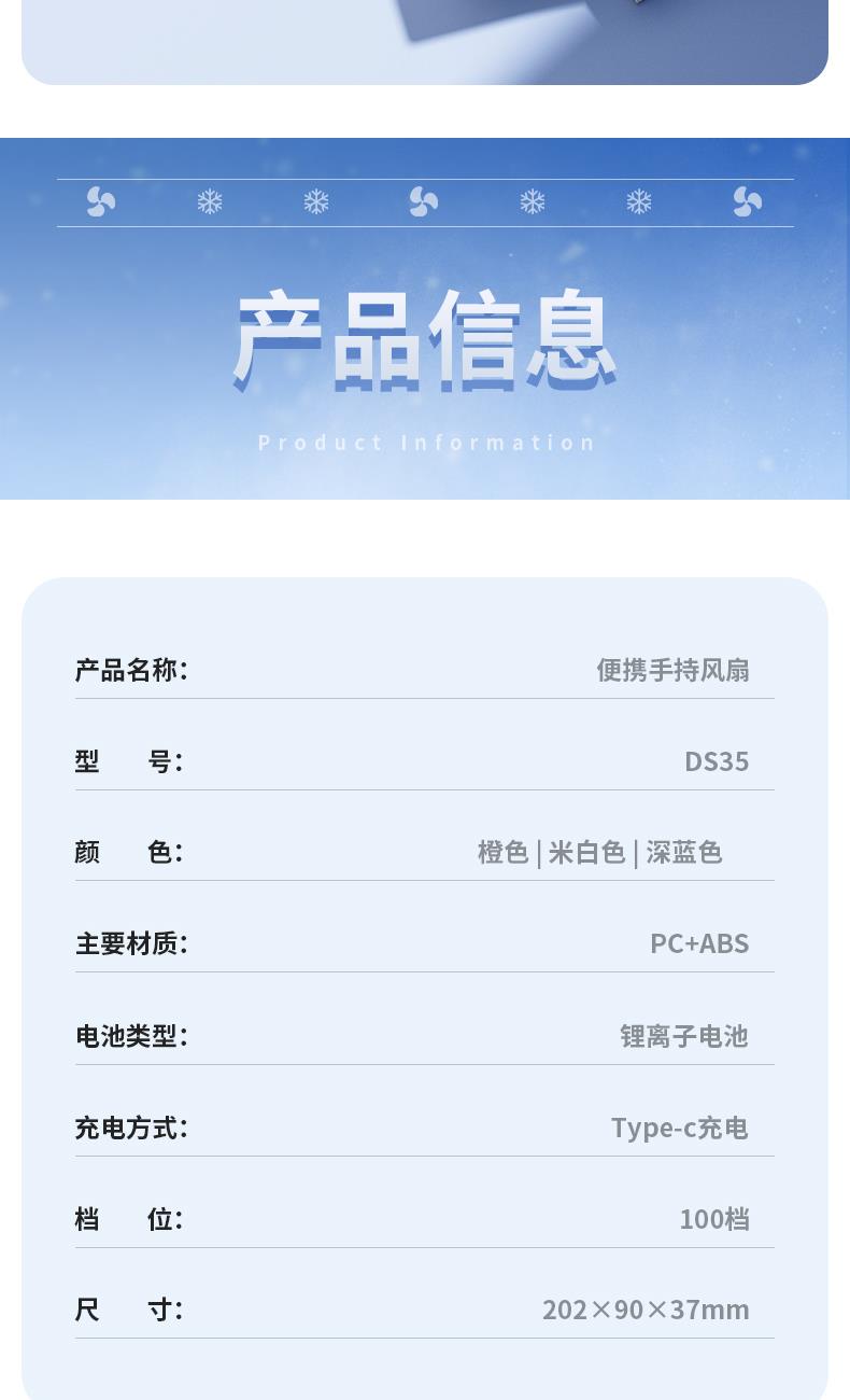 产品材质:ABS 产品功能:100档风力调节 产品容量:1200mAh 产品尺寸:202*90*37mm 产品颜色:白色,蓝色,橙色 智能数显设计,剩余电量一目了然;采用高性能锂电池,续航更持久,更静音,使用寿命更长。100档调节,风力随心选。定制LOGO面积大。