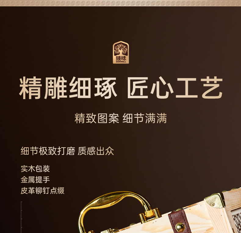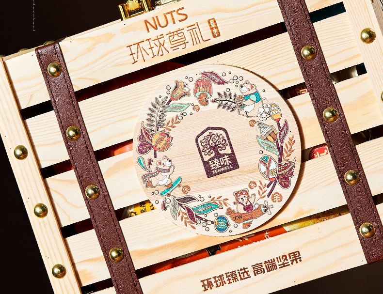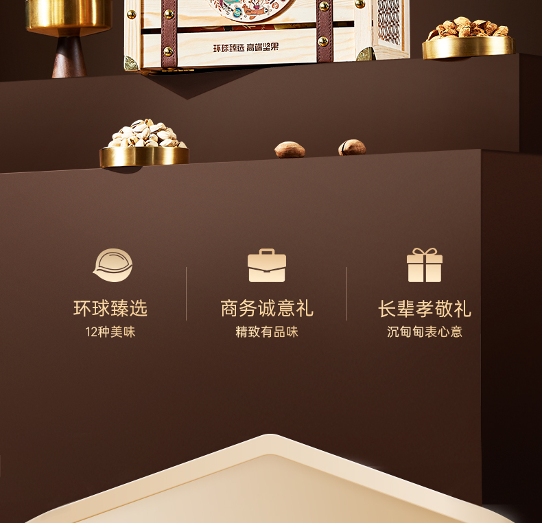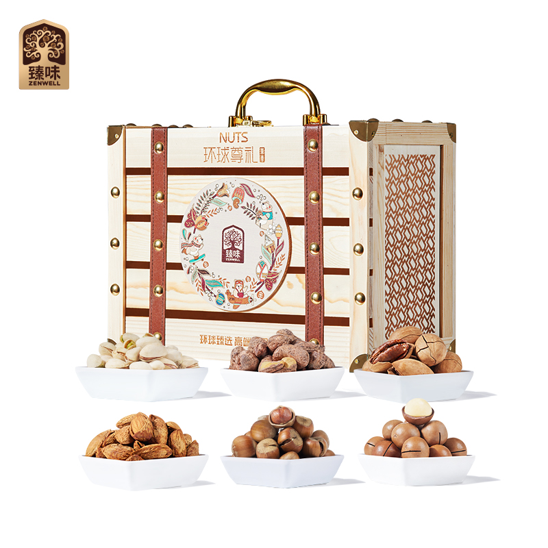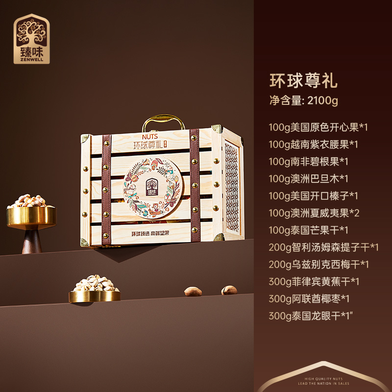 艺术与灵感糅合,铸就非凡杰 作,精致木箱包装,皮革铆钉 点缀,搭配皮质提手,打 造臻味全新环球尊礼坚果礼盒,标志性元素创新呈现,尽显卓 越精工,净含量:2100g,内含6种坚果、 6种果干,木质礼盒,至 上之礼,送礼奢华。