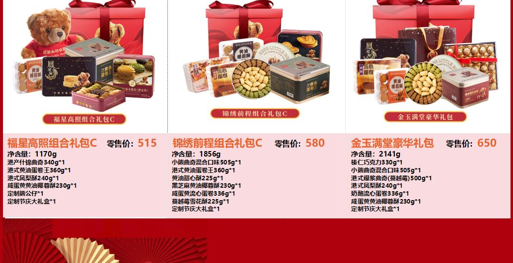 香港小熊,主打健康,美味,用心,产品覆盖了小熊曲奇,蛋卷王,凤梨酥,脆片,雪花酥,牛轧糖等40-50款。产品大多选用进口黄油,可可,抹茶粉等优质原材料,打造0添加健康食品,口感细腻浓郁,层次丰富回味无穷。包装方面,涵盖了铁盒,精致透明盒,节庆特色礼盒等多系列。